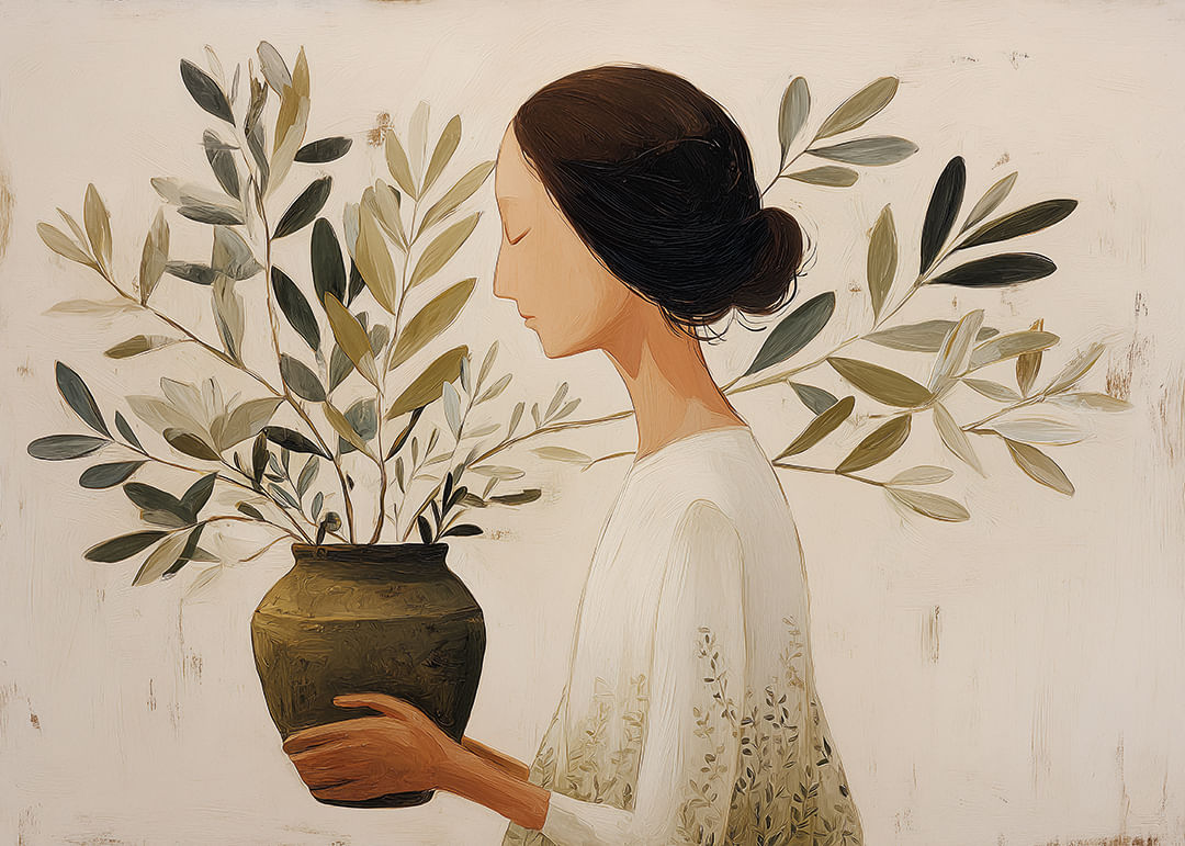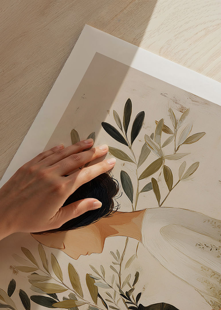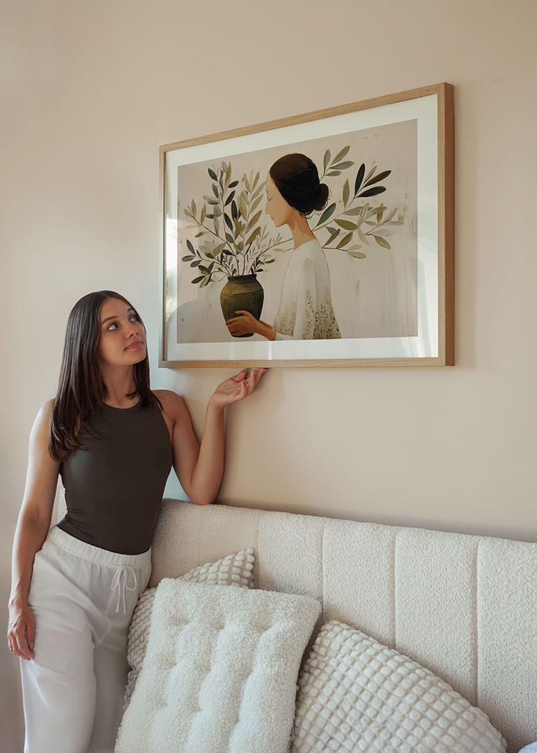 Denna poster förmedlar en lugn och meditativ känsla med sin mjuka och avskalade estetik. Motivet av en kvinna som håller en kruka med grönskande blommor fångar naturens stilla skönhet och för tankarna till tidlös harmoni. Dess subtila färgpalett och enkla komposition ger rummet en känsla av stillhet och frid, vilket gör denna poster till ett perfekt tillskott i varje hemmiljö.