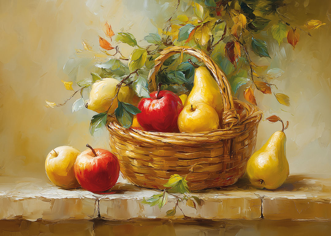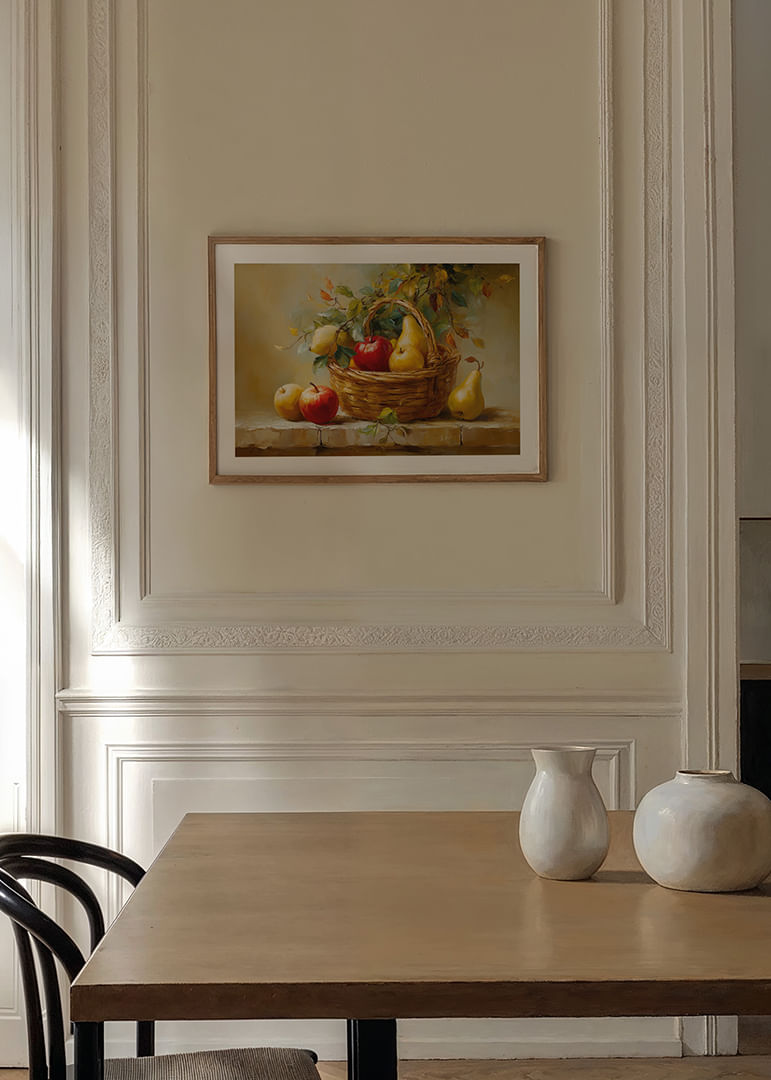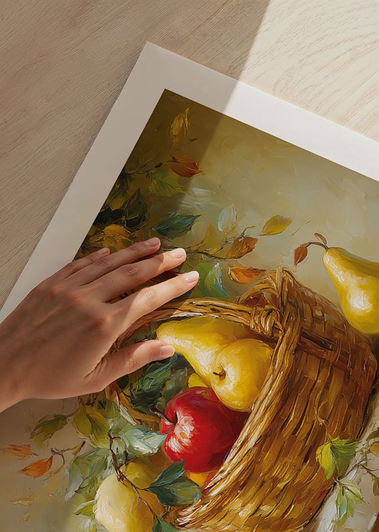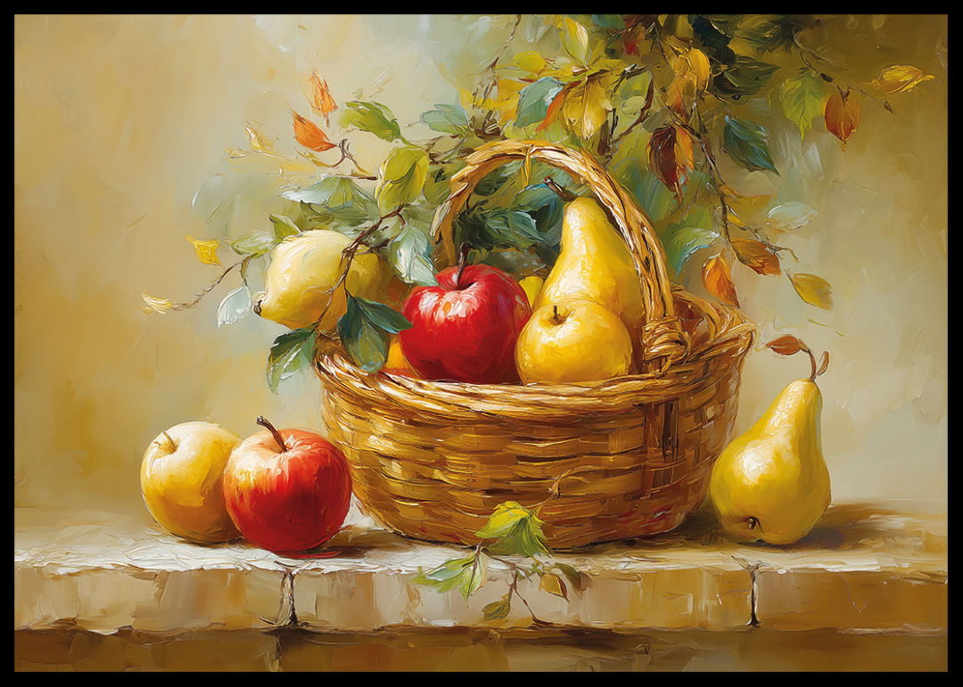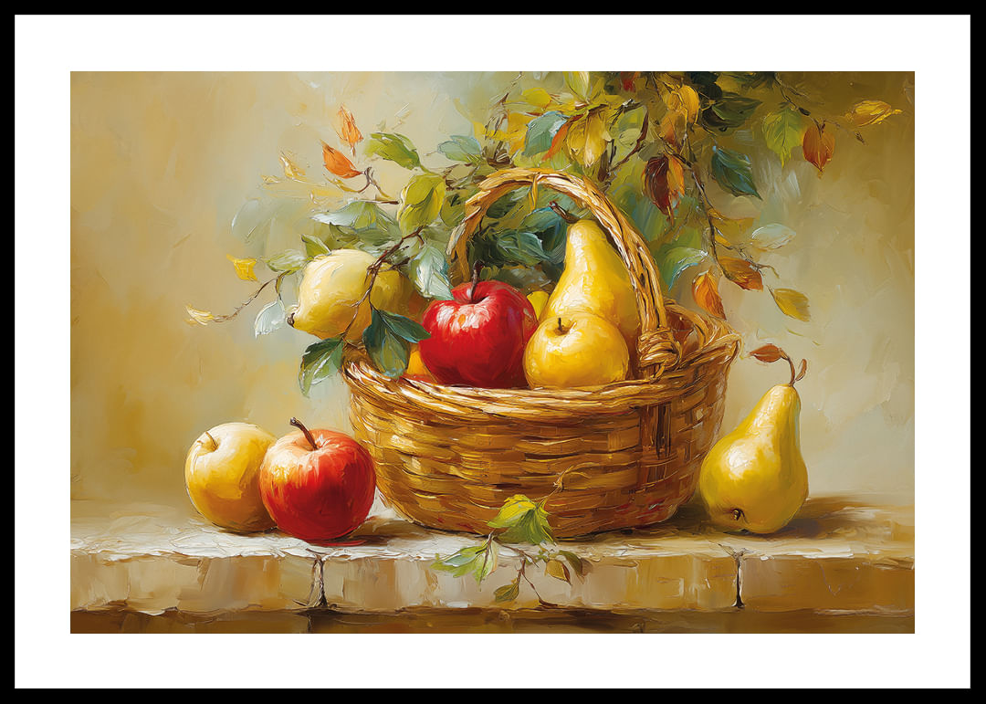 Denna poster fångar skönheten i en färgglad fruktkorg fylld med päron och äpplen, omgiven av gyllene höstlöv. De levande färgerna och den detaljrika flätade korgen ger en känsla av värme och rikedom till rummet. Varje inslag i postern utstrålar en rustik charm som lyfter hemmets atmosfär och inbjuder till lugn och fridfullhet, medan de naturliga elementen binder samman inredningen med naturens skönhet.