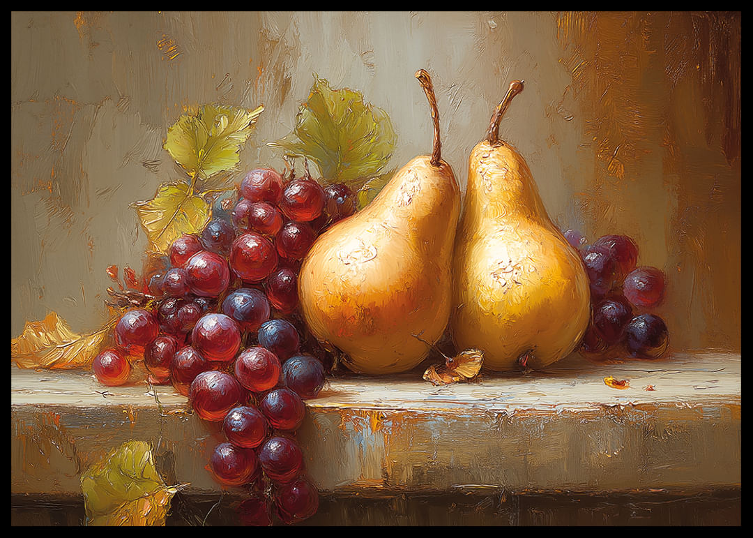 I detta konstverk fångas höstens magi med två gyllene päron omgivna av frodiga röda druvor. Den varma färgpaletten och mjuka penseldragen skapar en känsla av frid och överflöd. Denna poster blir en magnifik mittpunkt i alla hem, och förvandlar rummet till en plats av förfinad skönhet och tidlös elegans. Med posterens närvaro bjuds betraktaren in till en stund av rogivande stillhet.
