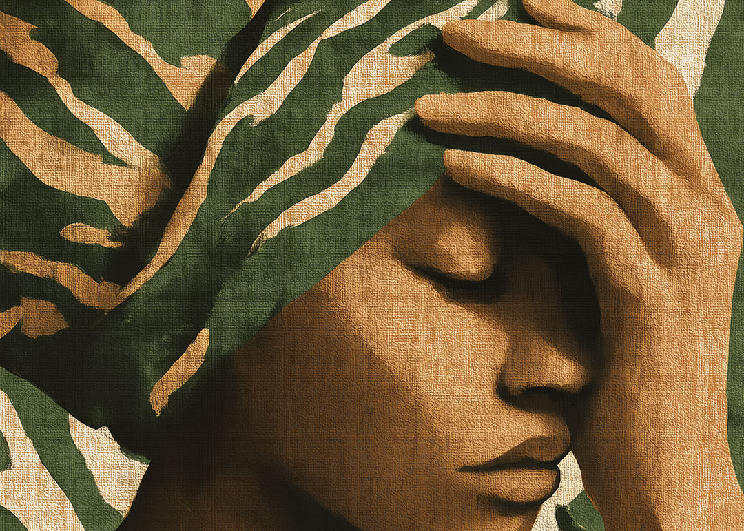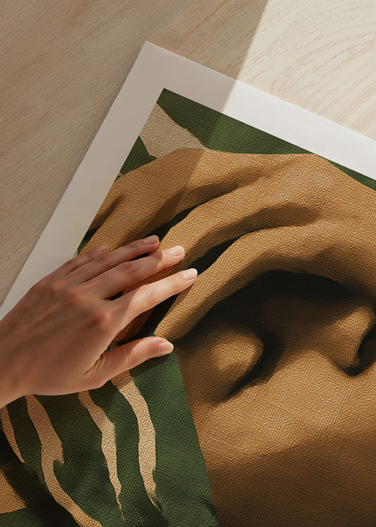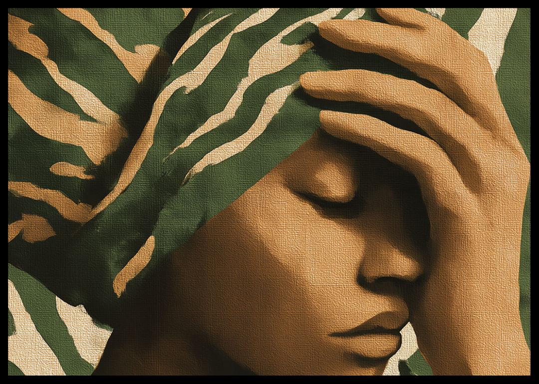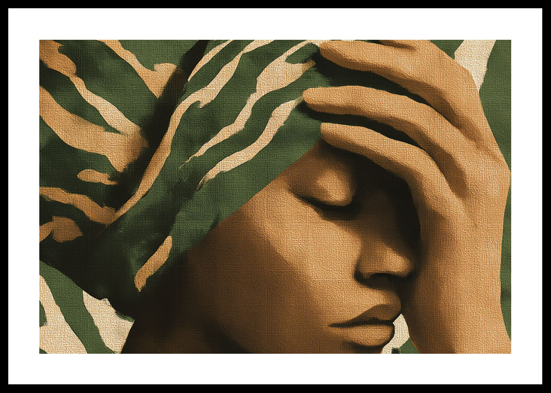 Denna poster fångar ett fridfullt ögonblick där en person i djup eftertanke vilar handen mot huvudet. De jordnära tonerna smälter harmoniskt samman med det elegant mönstrade tyget som sveper runt huvudet. Denna visuella harmoni skapar en känsla av ro och introspektion. I ett vardagsrum eller sovrum förhöjer postern atmosfären med en tidlös och meditativ närvaro.