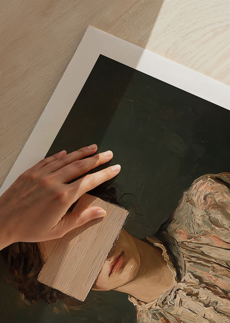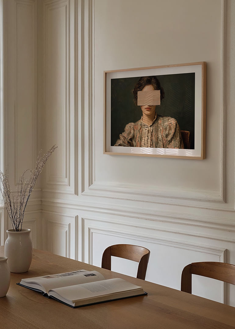 Denna poster fångar uppmärksamheten med ett porträtt av en mystisk kvinna vars ansikte delvis döljs av en obruten yta. Kombinationen av mjuka, dämpade färger och det gåtfulla uttrycket väcker nyfikenhet och skapar en känsla av djup. Postern blir ett fängslande samtalsämne och ger rummet en sofistikerad och tankeväckande atmosfär som inspirerar till reflektion och fantasins flykt.