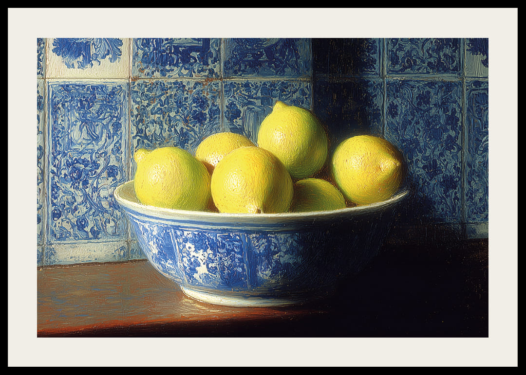 En poster som fångar ögonen med sina livfulla, gyllene citroner i en elegant blåvit skål. Citronernas klara gula mot de intrikata blå kakelplattorna skapar en harmonisk kontrast som både förfriskar och lugnar sinnena. Denna poster för med sig en känsla av tidlös charm och stil, perfekt för att förbättra atmosfären i vilket kök eller vardagsrum som helst.