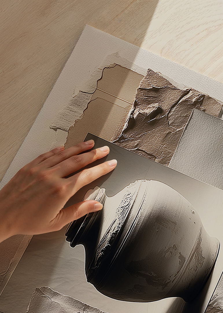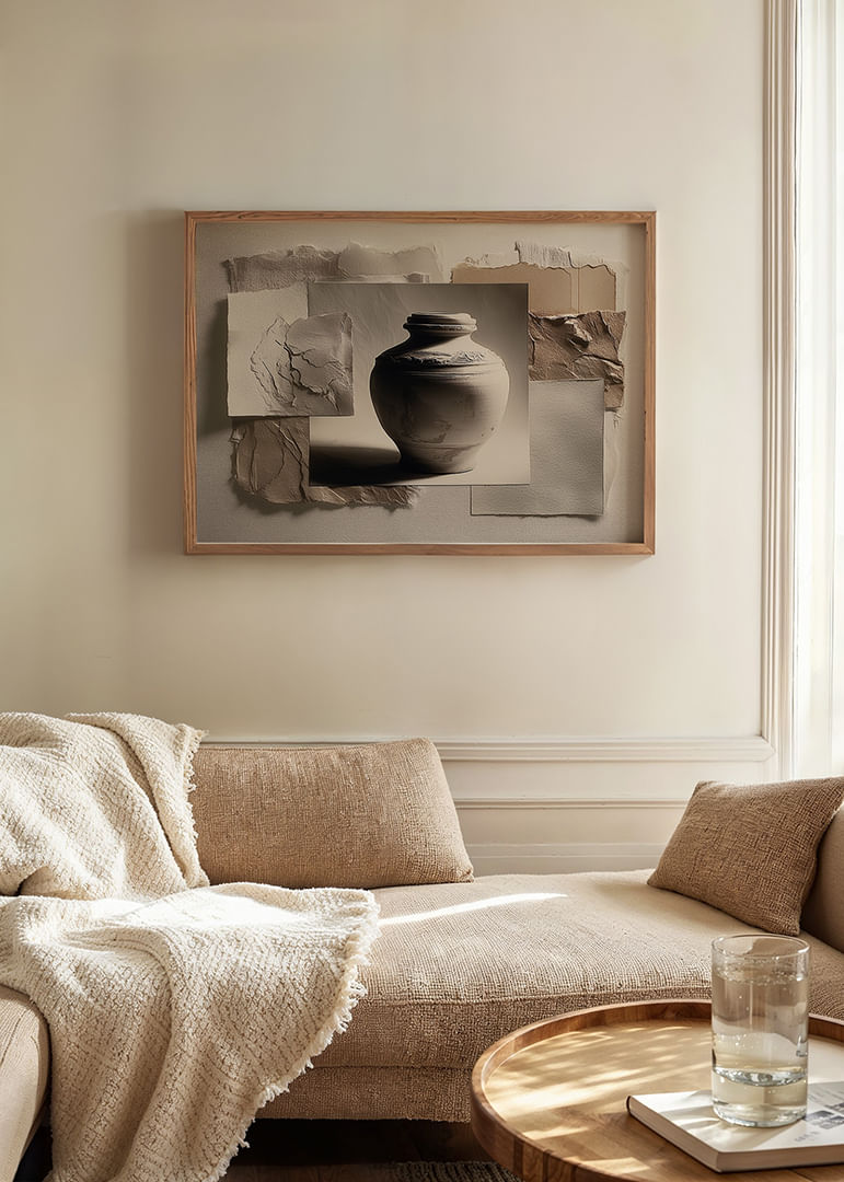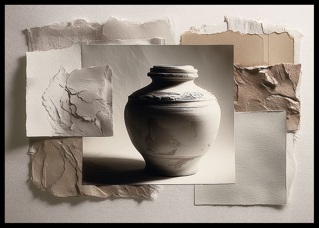 Denna poster fångar tidlös skönhet med en rustik kruka placerad mot en bakgrund av taktila texturer. Krukans mjuka kurvor kompletteras av den omgivande papperstexturen, vilket skapar en harmoni av former och färger. Postern förmedlar en känsla av enkel elegans och naturlig skönhet, vilket gör den till ett perfekt tillskott för att förgylla alla inredningsmiljöer med en subtil, konstnärlig touch.