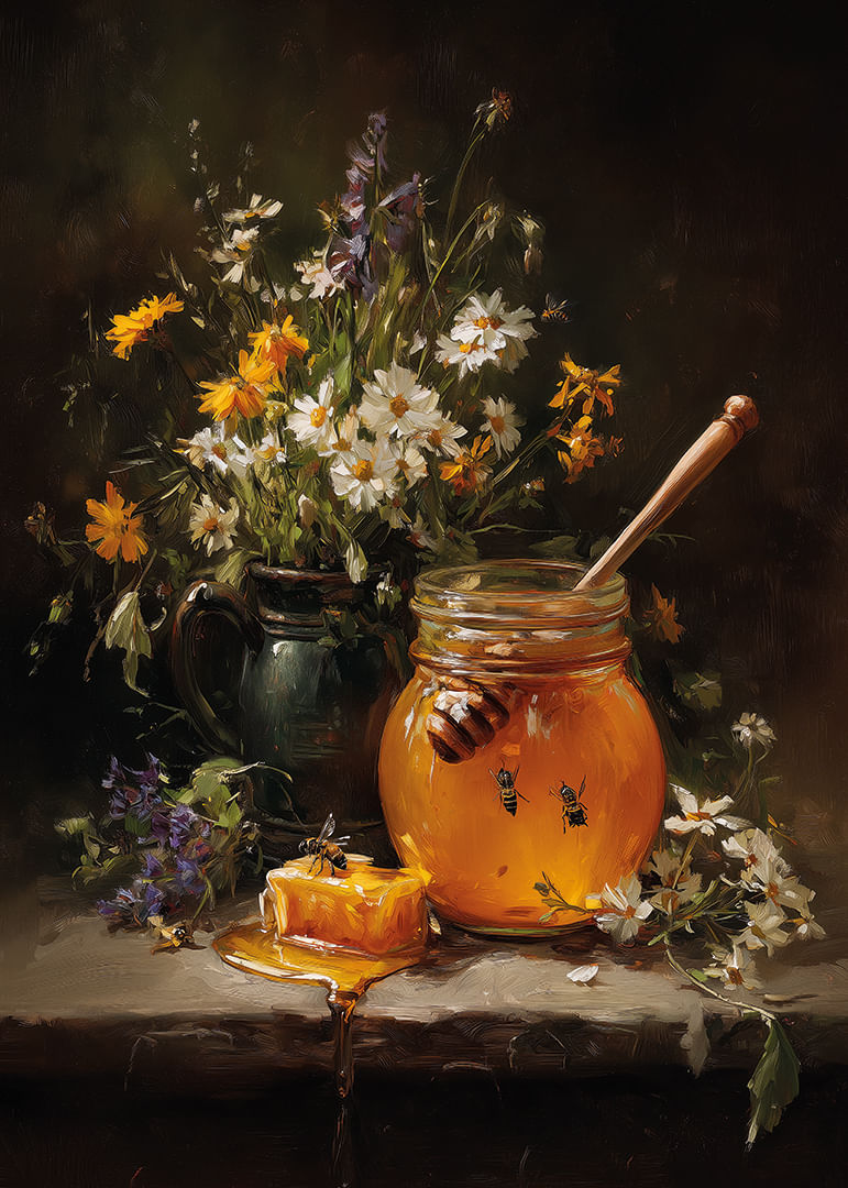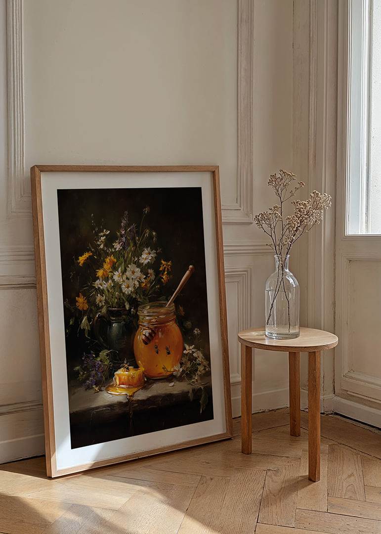 I denna poster fångas betraktarens blick av den harmoniska kombinationen av gyllene honung och livliga blommor. De vackra nyanserna av orange smälter samman med blommornas skira färger, vilket skapar ett konstnärligt mästerverk. Postern tillför en känsla av naturlig skönhet och värme till vilket rum som helst, vilket ger liv och ett lugnande intryck i hemmet.