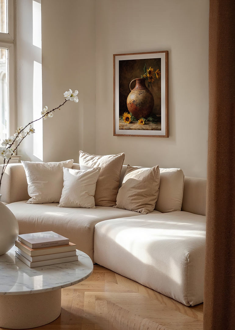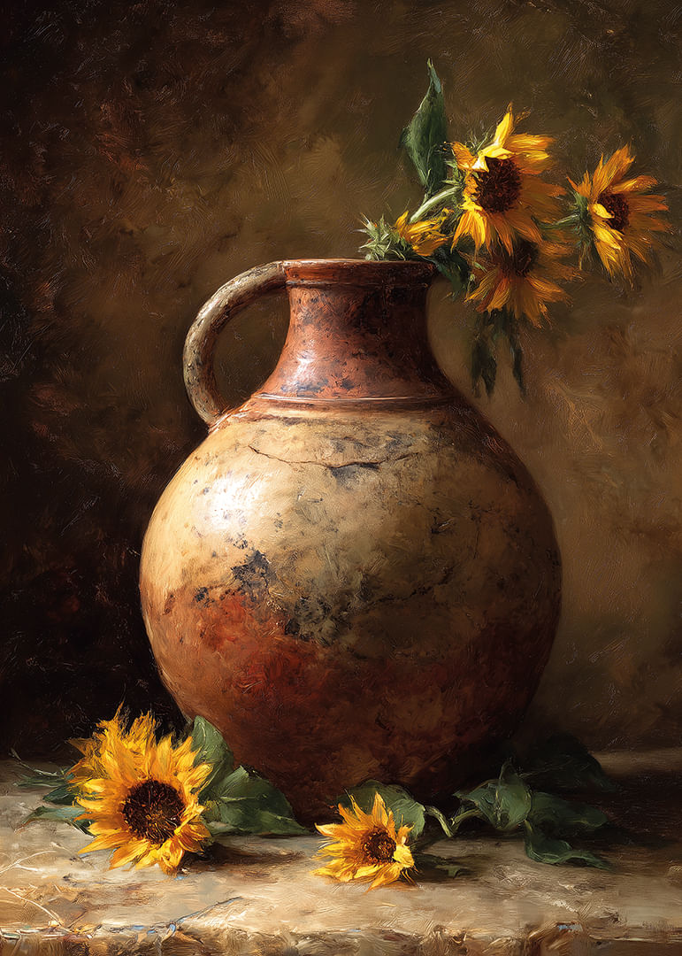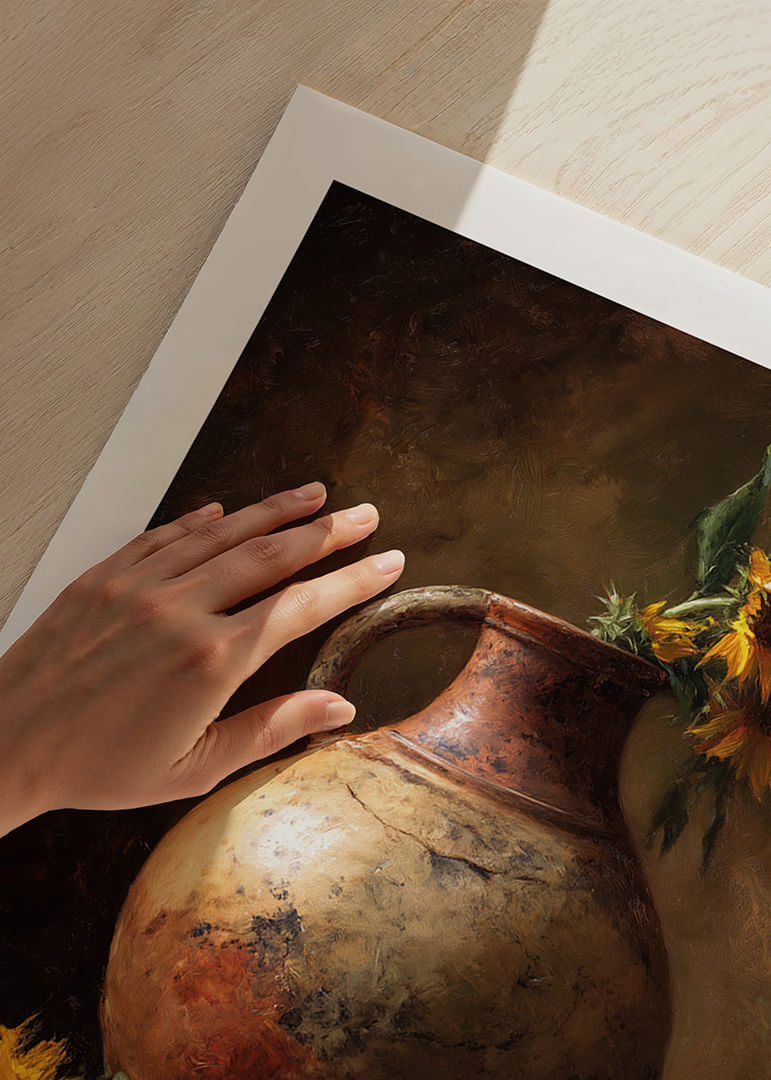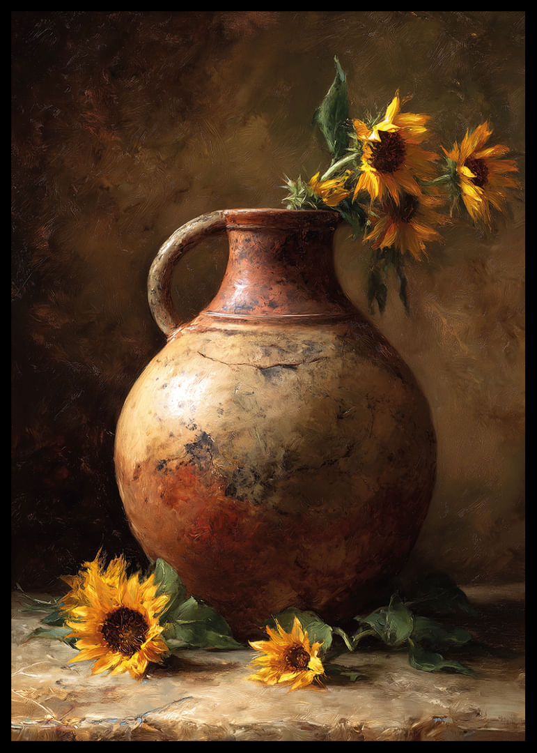Denna poster fångar ögat med sina gyllene solrosor som vilar elegant i en rustik kruka. Jordnära toner och mjuka penseldrag skapar en känsla av lantlig frid och tidlös skönhet. Med sitt varma och inbjudande uttryck förvandlar postern vilket rum som helst till en oas av lugn och charm, och höjer stämningen med sin naturliga och harmoniska estetik.