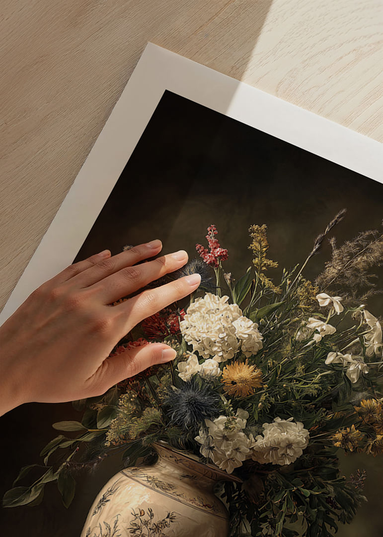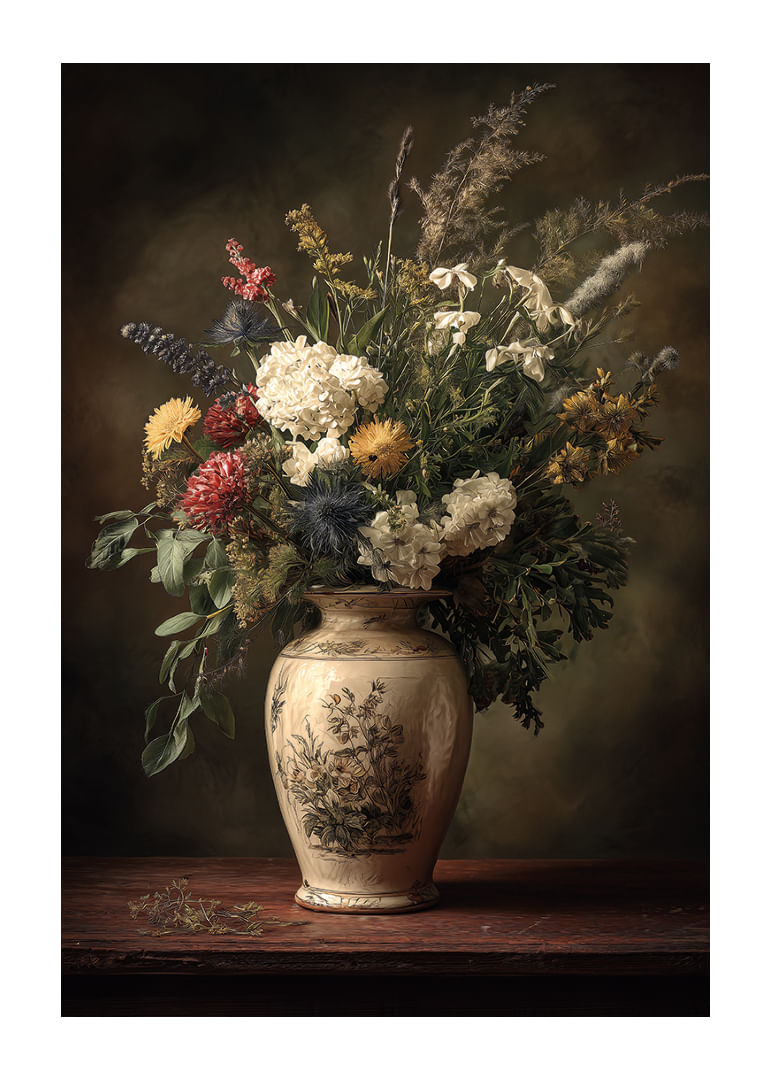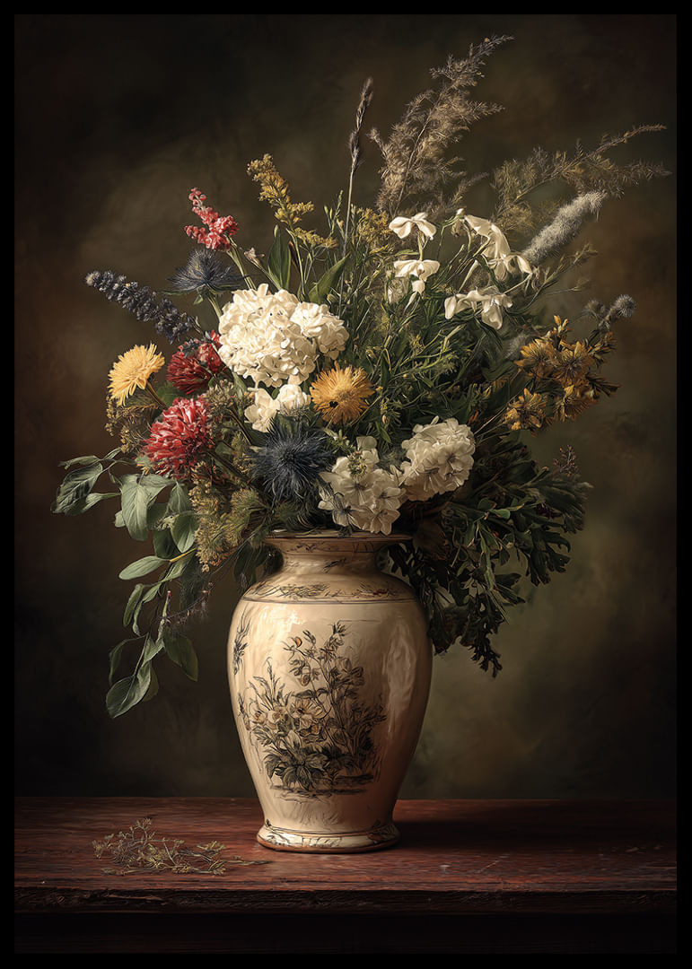 Denna poster fångar ögat med ett elegant arrangemang av blommor i varma, jordnära nyanser. Den utsökta vasen förhöjer vårkänslan och ger rummet en romantisk touch. Varje detalj i postern skapar en känsla av evig skönhet, där färgerna och texturerna smälter samman. Perfekt för att tillföra en klassisk och sofistikerad atmosfär till vilket hem som helst, denna poster är en hyllning till naturens konstverk.
