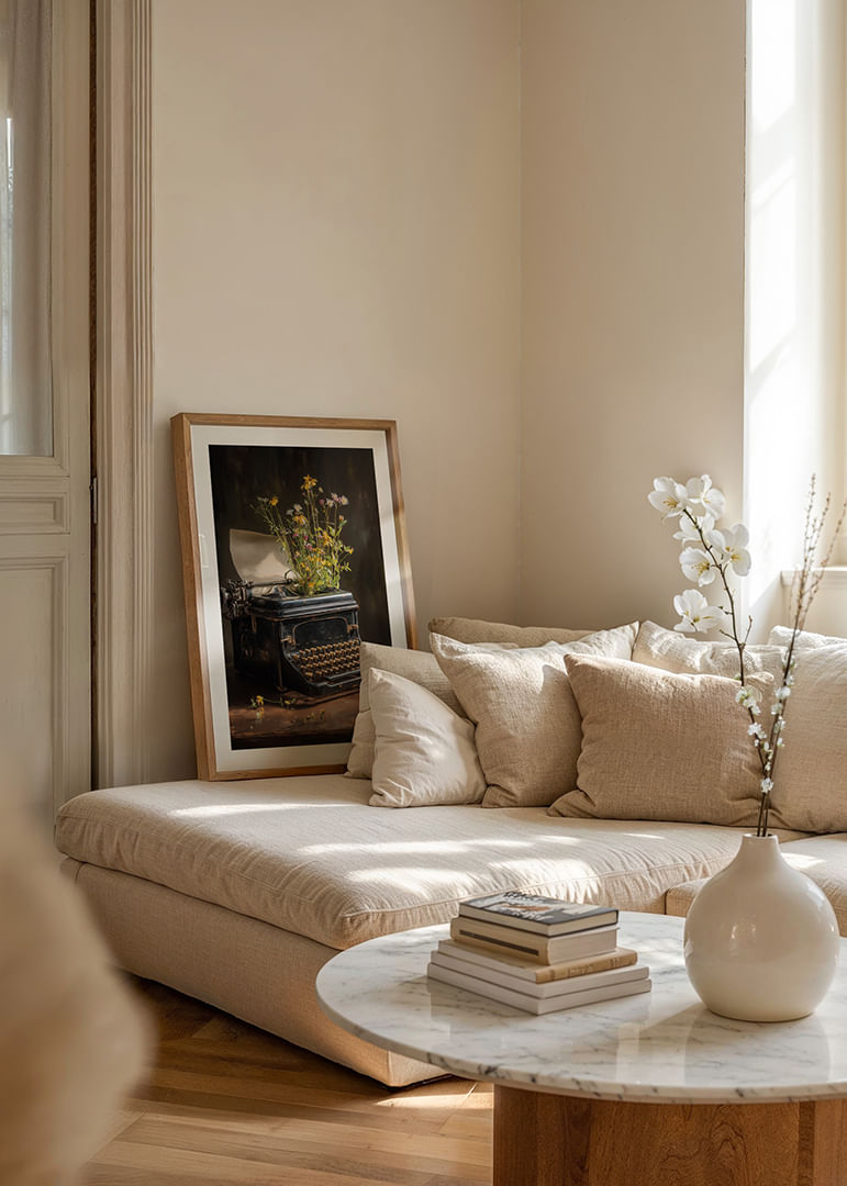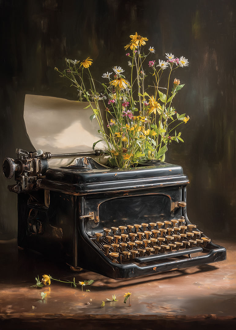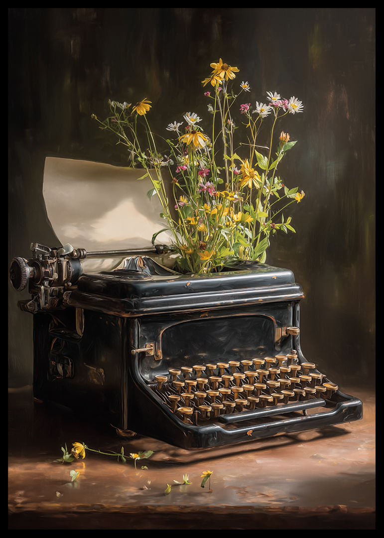 Denna poster väcker omedelbart en känsla av nostalgi och kreativitet med sin gamla skrivmaskin fylld med färgglada ängsblommor. Det kontrasterande mötet mellan maskinens robusta metall och blommornas skörhet skapar en harmonisk balans. Med varm charm förvandlar postern vilket rum som helst till en mysig och inspirerande plats, perfekt för den som älskar det artistiska och det tidlösa.