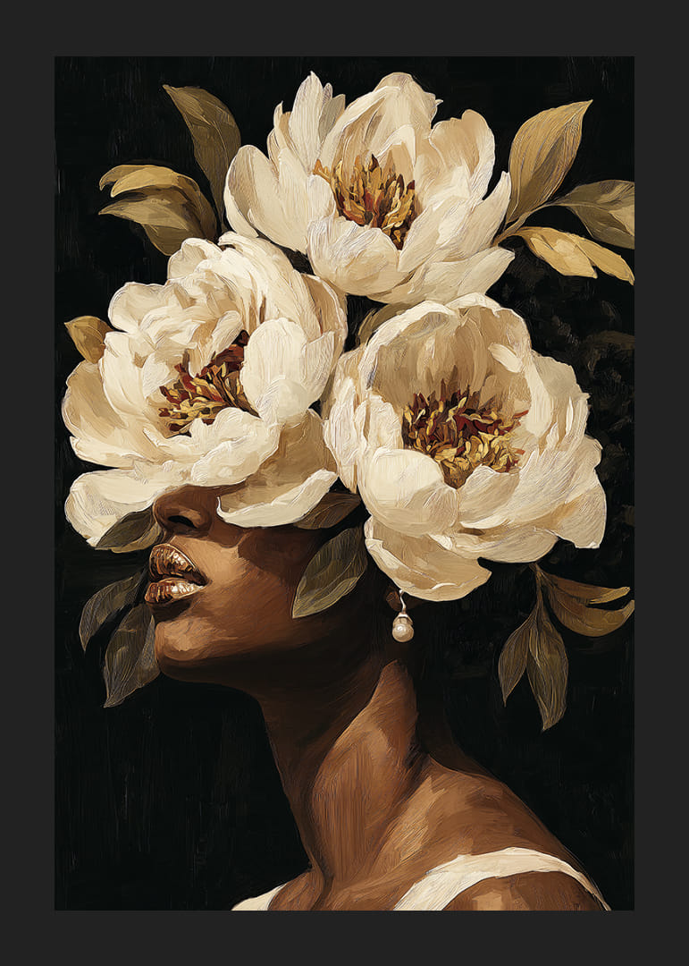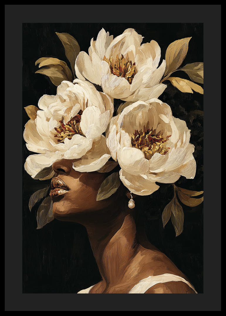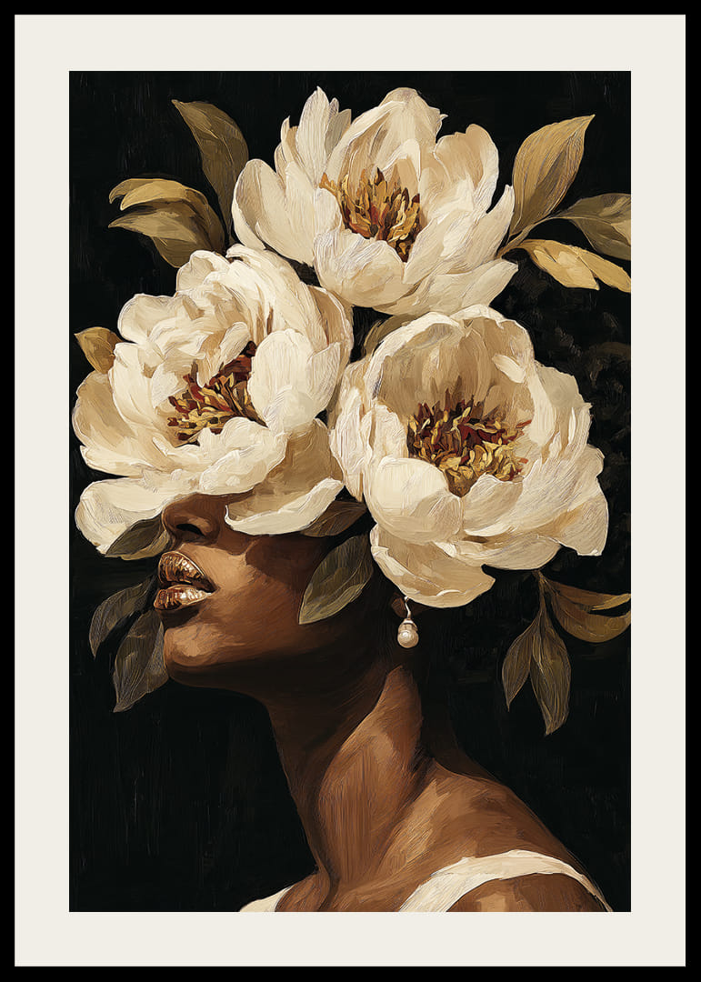 Denna poster förtrollar med sin tidlösa skönhet där blomstrande blommor omsluter en kvinnas ansikte och skapar en fascinerande mystik. De stora, vita blommorna står i kontrast mot den mörka bakgrunden och framhäver elegansen och djupet i motivet. Med sina gyllene toner och en subtil pärla, förstärker postern atmosfären av förfining i varje rum och skapar en känsla av drömskhet.