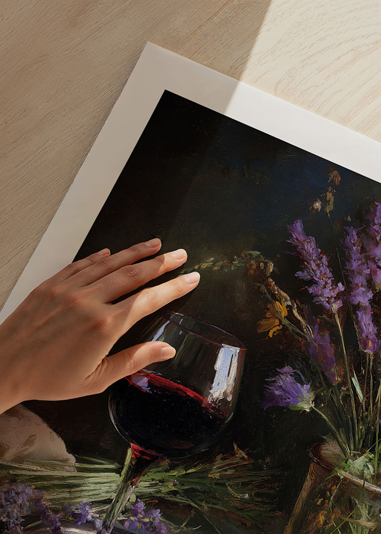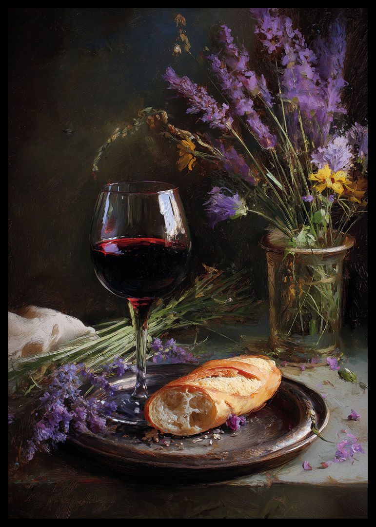 Denna poster fångar en rustik känsla med ett stilleben av ett glas rött vin, bröd och vilda blommor i lila toner. Den harmoniska paletten av vinrött och lavendel skapar en känsla av lugn och tidlöshet. Perfekt för att ge ditt hem en sofistikerad och varm atmosfär, fungerar denna poster som en påminnelse om naturens enkla skönhet och livets små njutningar, vilket förhöjer stämningen i rummet.
