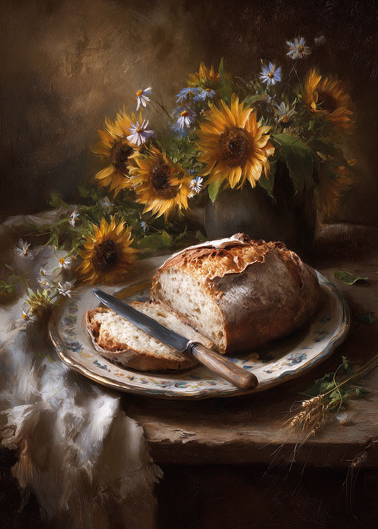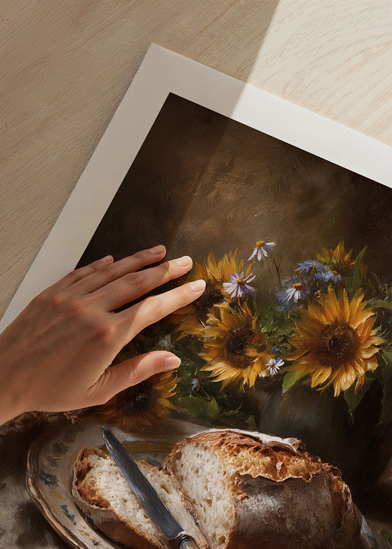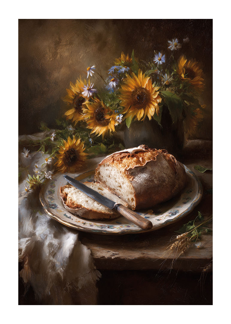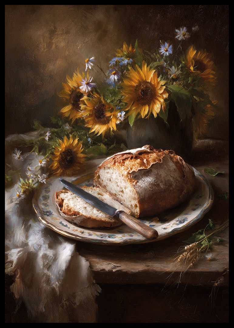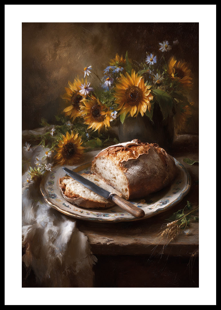 Den här postern fångar en varm, rustik känsla där grovt bröd omges av strålande solrosor och milda blommor. De rika, jordnära tonerna och det naturliga ljuset skapar en atmosfär av hemtrevnad och enkelhet. Med den detaljerade avbildningen av både brödet och blomsterarrangemanget tillför denna poster en gyllene och inbjudande touch till vilket rum som helst. Perfekt för att skapa lugn och skönhet.