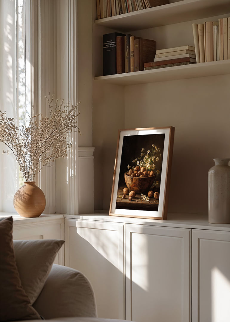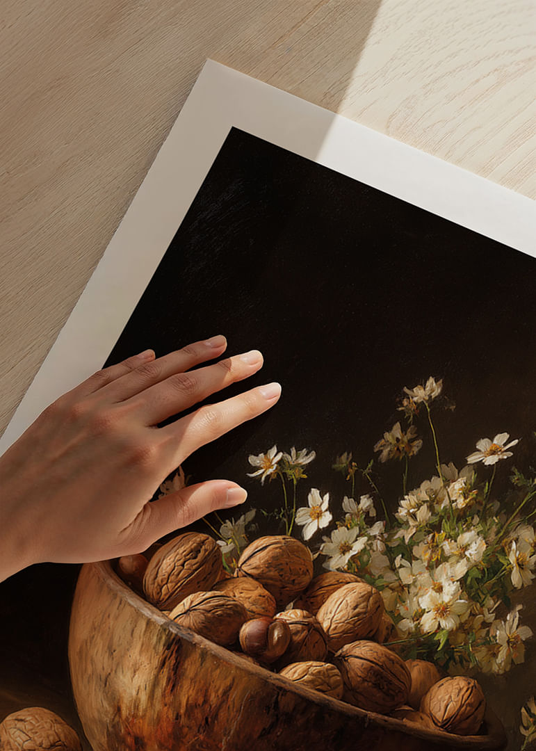Denna poster fångar skönheten i ett mysigt stilleben med en träskål fylld med nötter och omgiven av skira vita blommor. Den rustika träskålen framhäver de naturliga färgerna hos nötterna och skapar en varm, inbjudande atmosfär. Blommornas mjuka skimmer tillför en känsla av tidlös elegans. Denna poster förhöjer alla rum med en känsla av enkelhet och lugn, vilket gör den perfekt för varje hem.