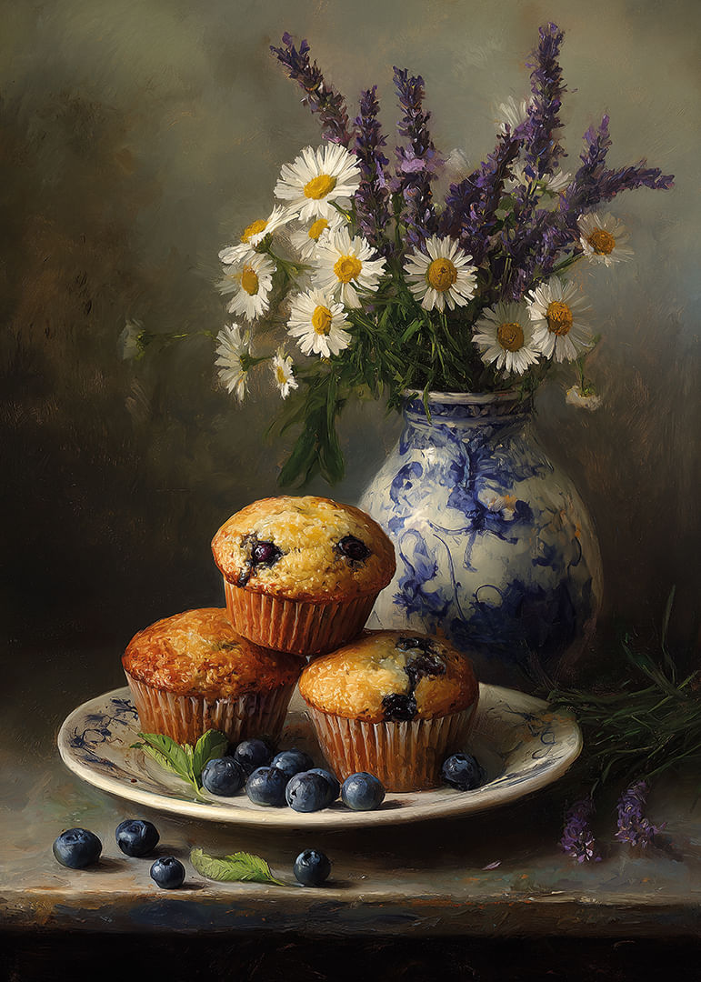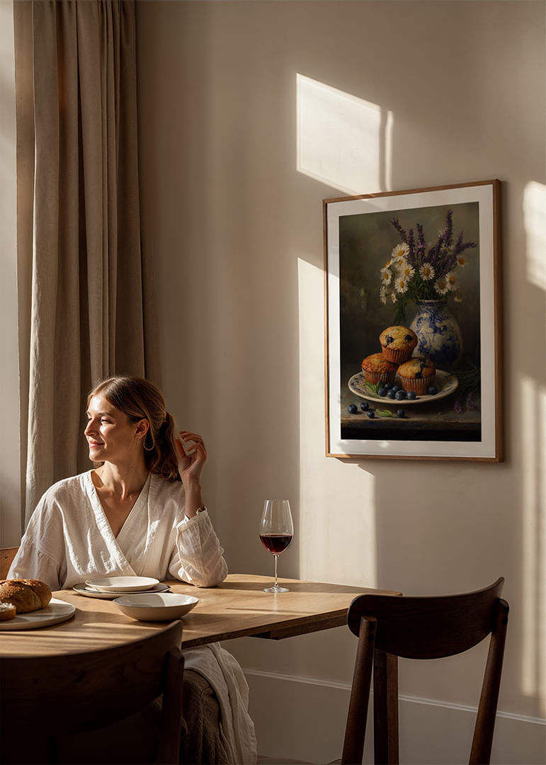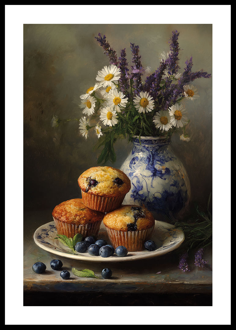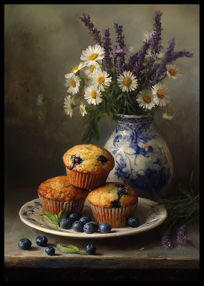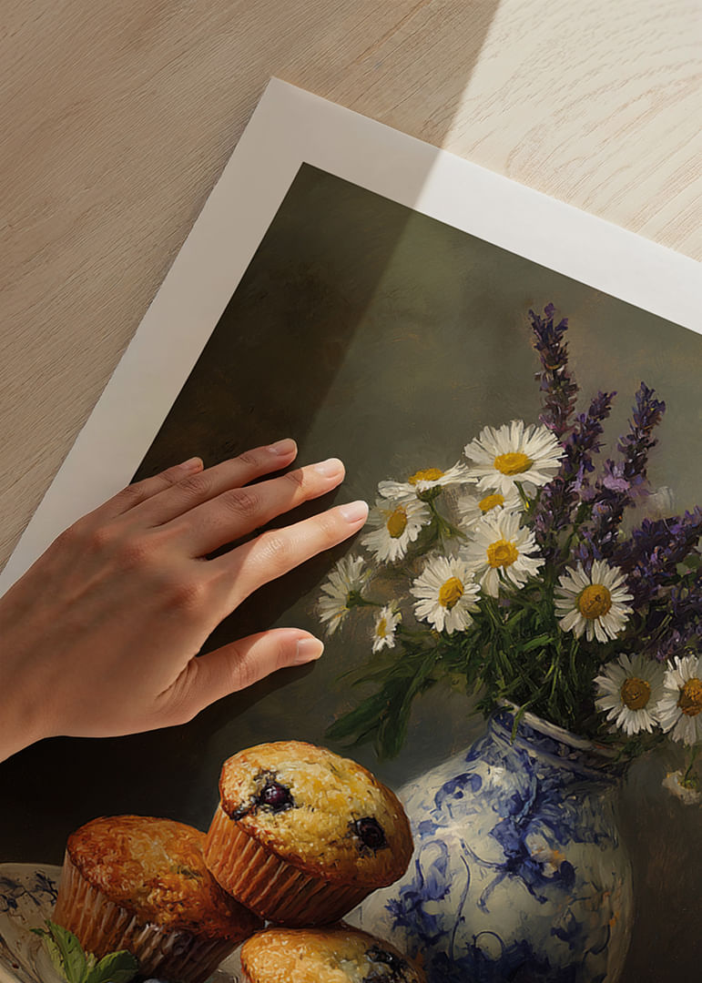Denna vackra poster fångar essensen av lantlig stillhet med saftiga blåbärsmuffins arrangerade på ett fat bredvid en blomstrande vas med prästkragar och lavendel. Färgerna och detaljerna skapar en varm och inbjudande atmosfär som berikar vilket rum som helst. Postern blandar traditionell elegans med enkel njutning, vilket gör den till en perfekt detalj som lyfter hemmets harmoni.
