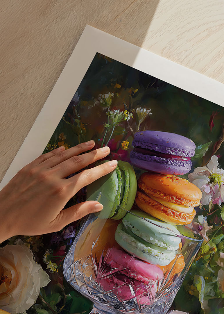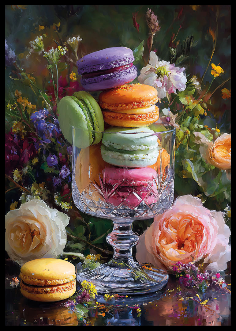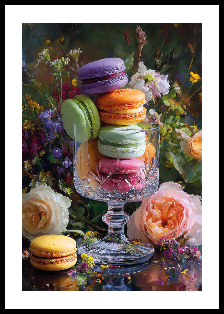 Denna poster fångar en fest av färgglada macarons i en elegant glasbägare, omgiven av ett överflöd av blommor. Varje macaron speglas i det kristallklara glaset, och den livfulla färgpaletten skapar en känsla av lyx och njutning. Med sina subtila detaljer och charm tillför denna poster en touch av magi och elegans till vilket rum som helst och förvandlar vardagen till en visuell fest.