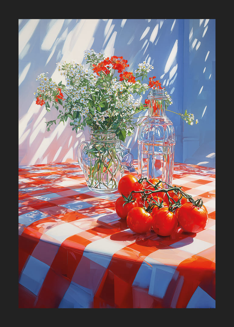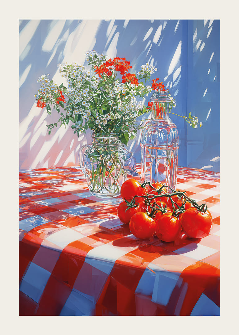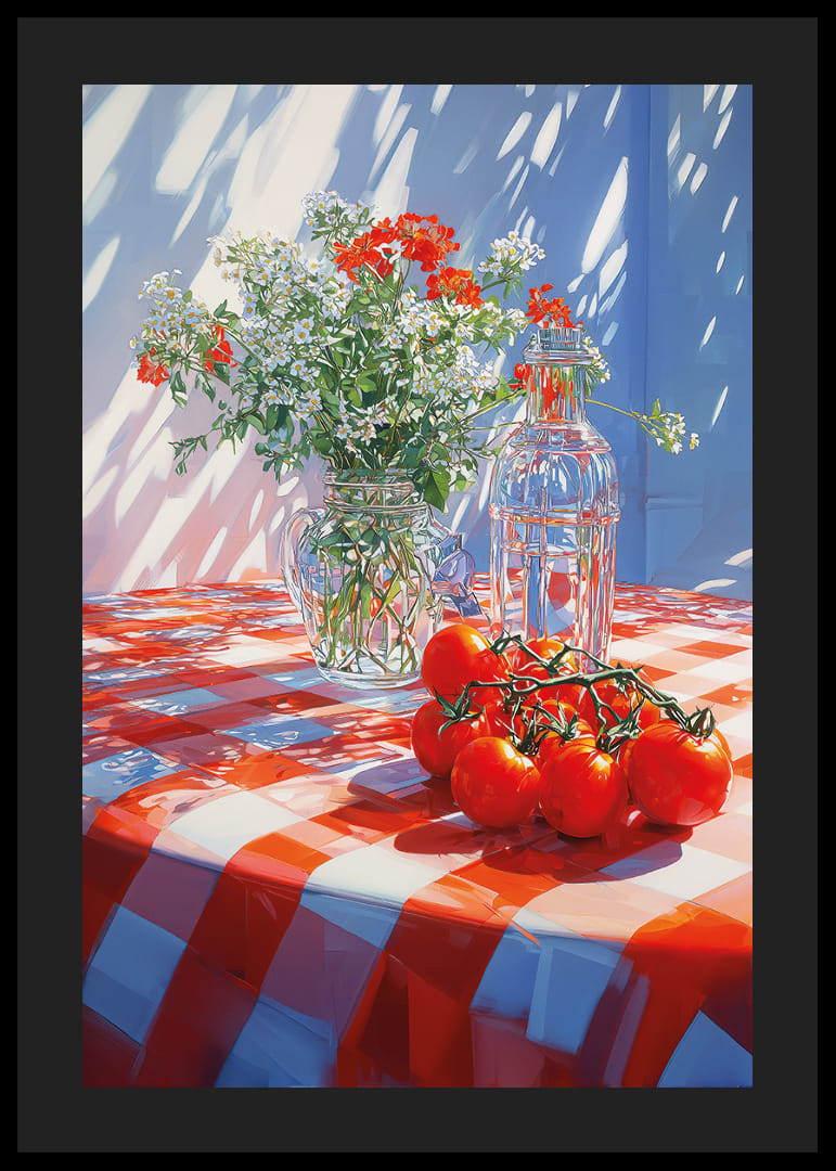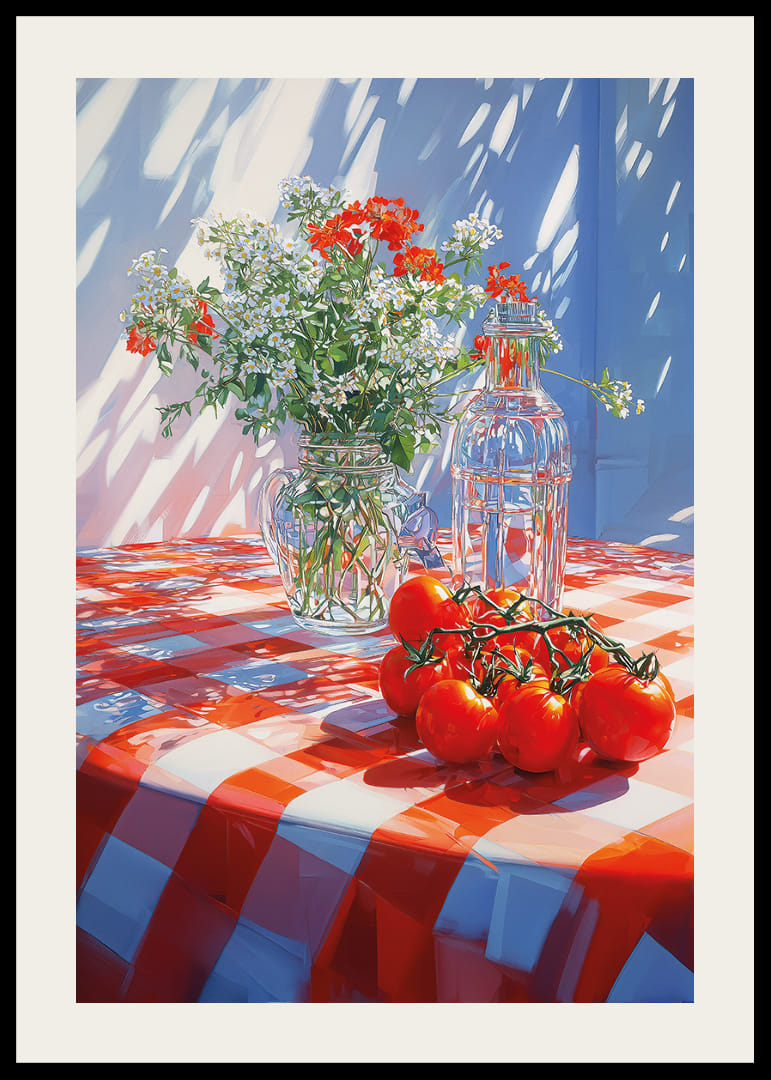 Denna poster fångar en solig eftermiddag där solljus spelar över en röd-vitrutig duk. En bukett av fräscha blommor och ljusröda tomater ger liv åt scenen. Det sprudlar av färger och skapar en varm, inbjudande känsla. Postern är perfekt för att tillföra en glimt av sommarglädje och livfullhet till ditt hem och får varje rum att kännas mer välkomnande och levande.