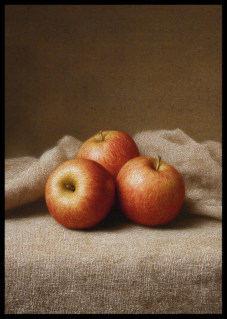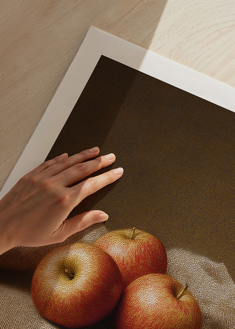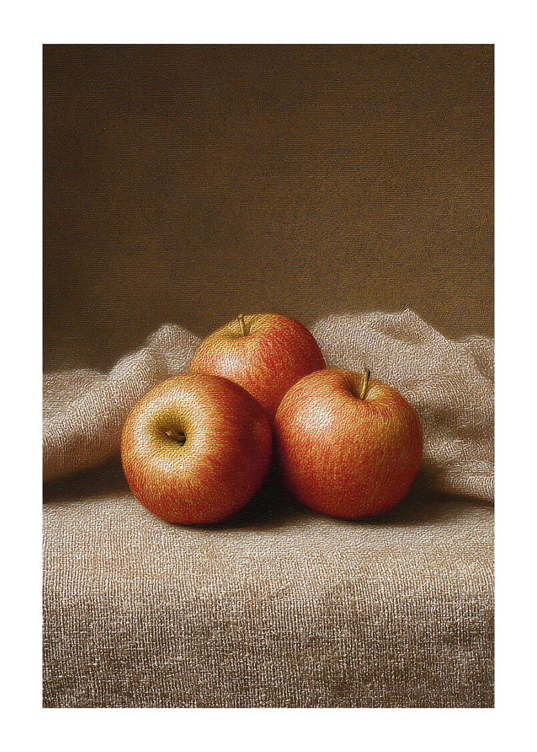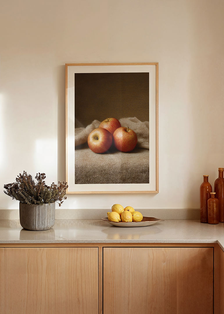 I denna poster förenas tre gyllene äpplen mot en bakgrund av jordnära toner och harmoniska skuggor. Den enkla kompositionen framhäver äpplens naturliga skönhet, vilket skapar en känsla av lugn och tidlöshet. Perfekt för hemmet, tillför denna poster en känsla av rustik elegans och förankrar rummet i en harmonisk, jordnära estetik.