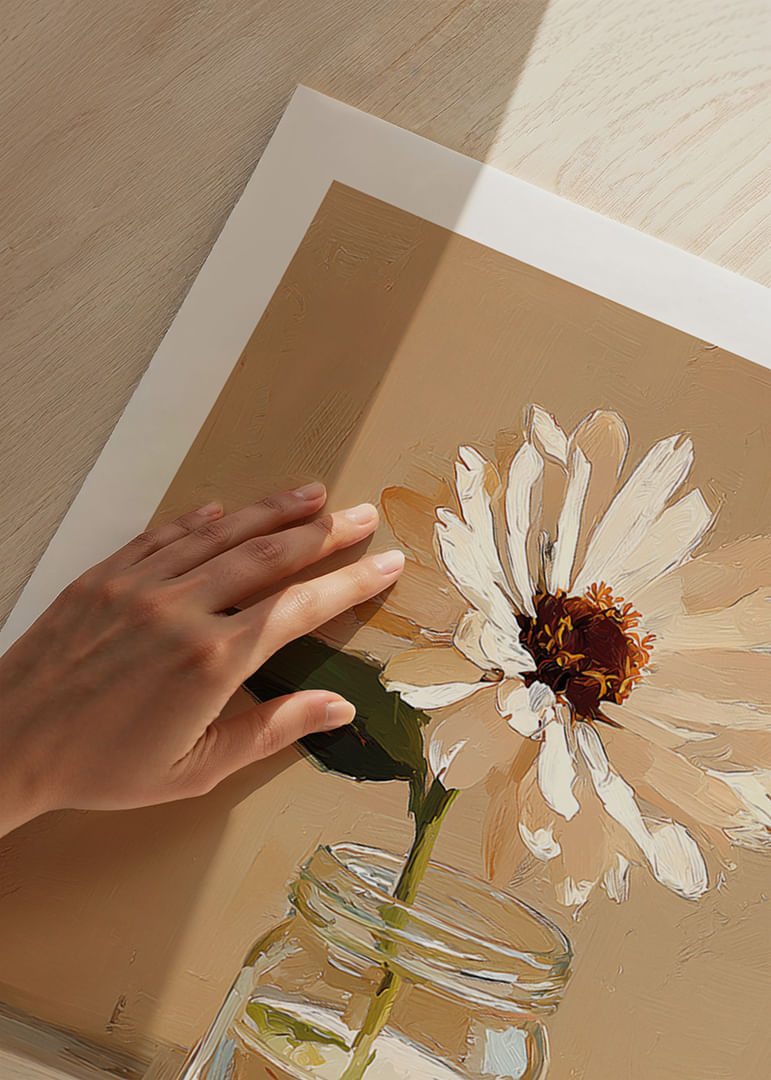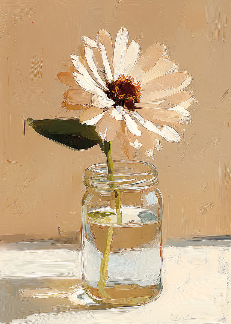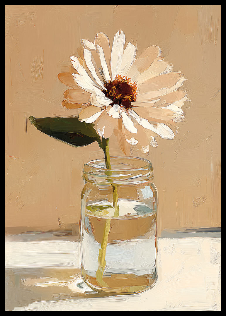 Denna poster fångar ögat med en ensam blomma i en enkel glasvas, där de mjuka, krämiga tonerna skapar en känsla av tidlös skönhet. Blommans enkelhet ger en känsla av harmoni och stillhet som sprider sig i rummet. Den subtila färgpaletten och det mjuka ljuset i postern förhöjer atmosfären och bidrar till en lugnande och fridfull miljö, perfekt för alla vardagsrum.