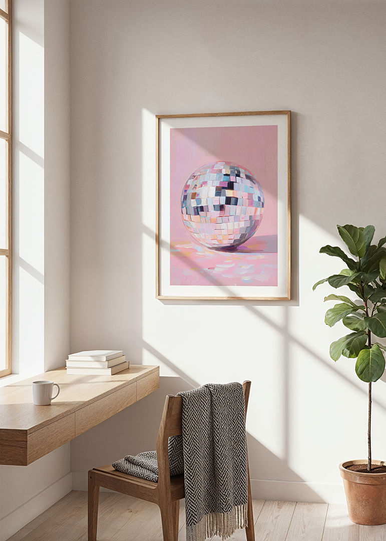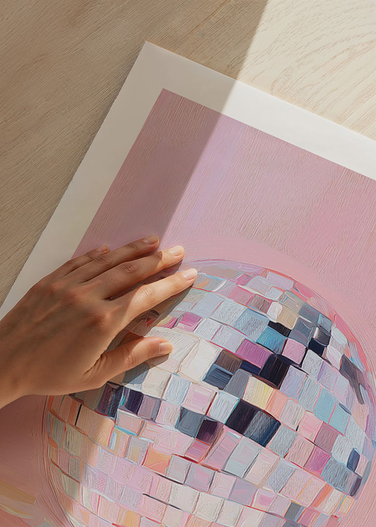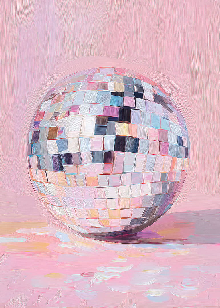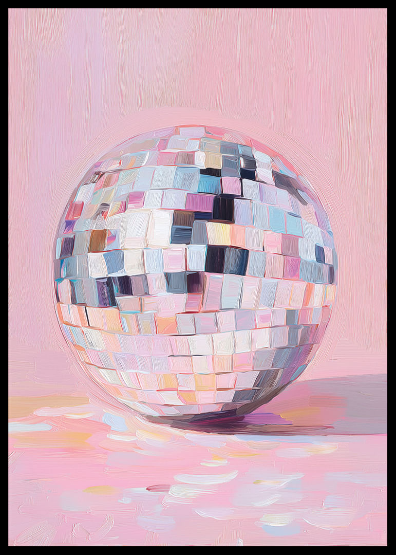Denna poster fångar en glittrande discokula i mjuka pastellnyanser som sprider ett magiskt sken. Med sina reflektioner av rosa, blått och vitt skapar den en atmosfär av drömlik elegans och lekfullhet. Detta konstverk förvandlar vilket rum som helst till en plats av inspiration och kreativitet, där vartenda hörn fylls med en känsla av oändliga möjligheter. Placera denna poster på en framträdande plats för att höja ditt hems stil.