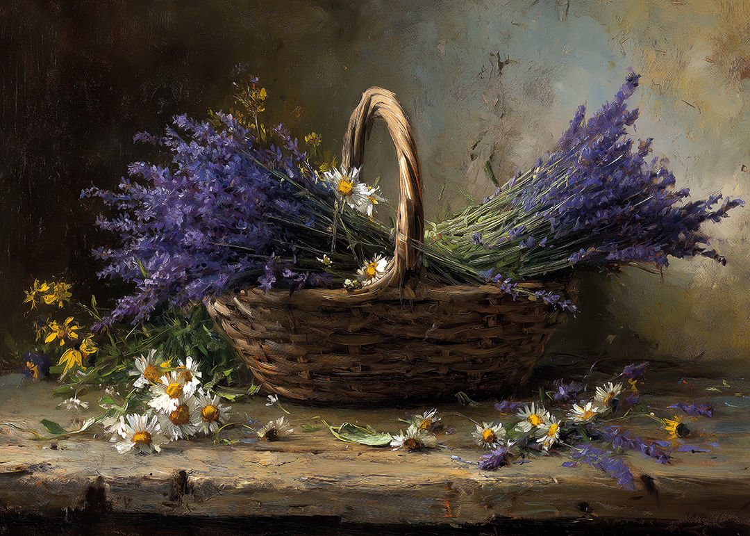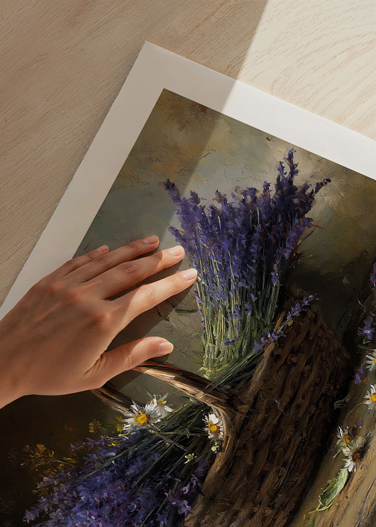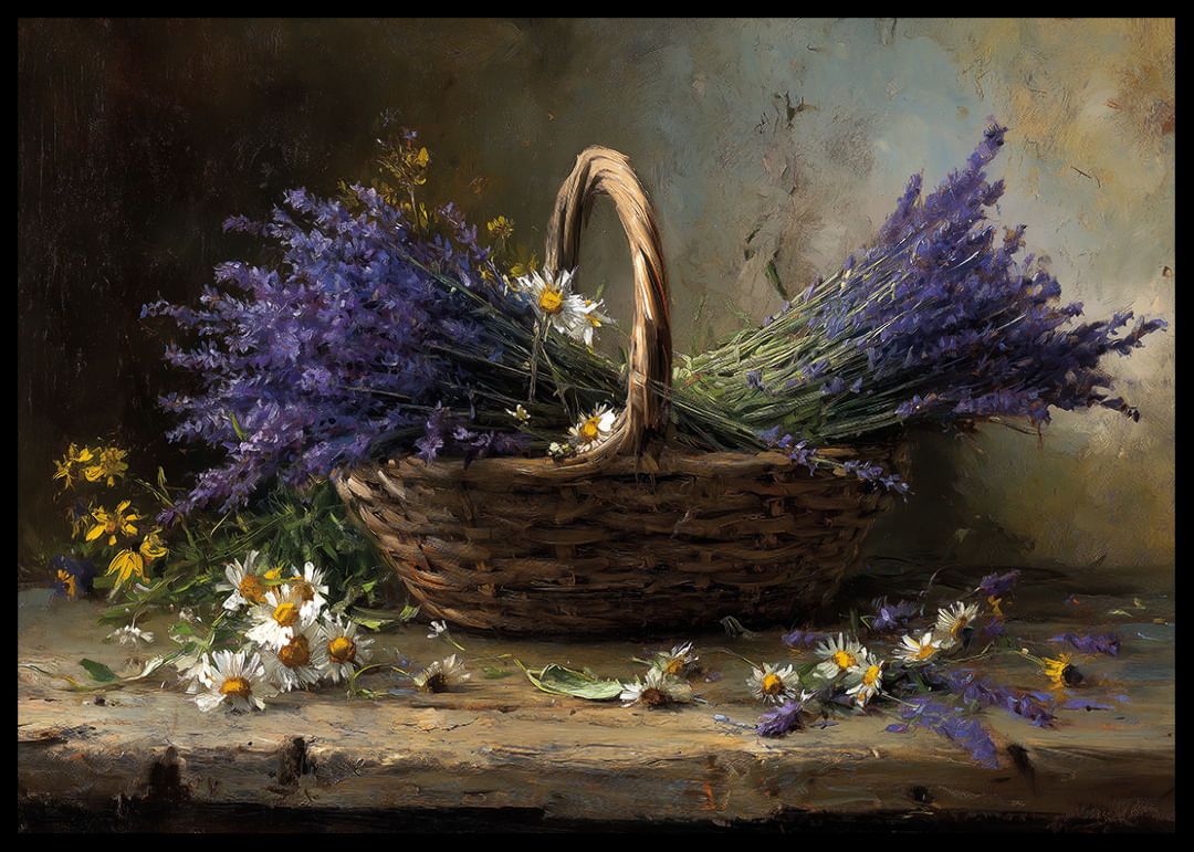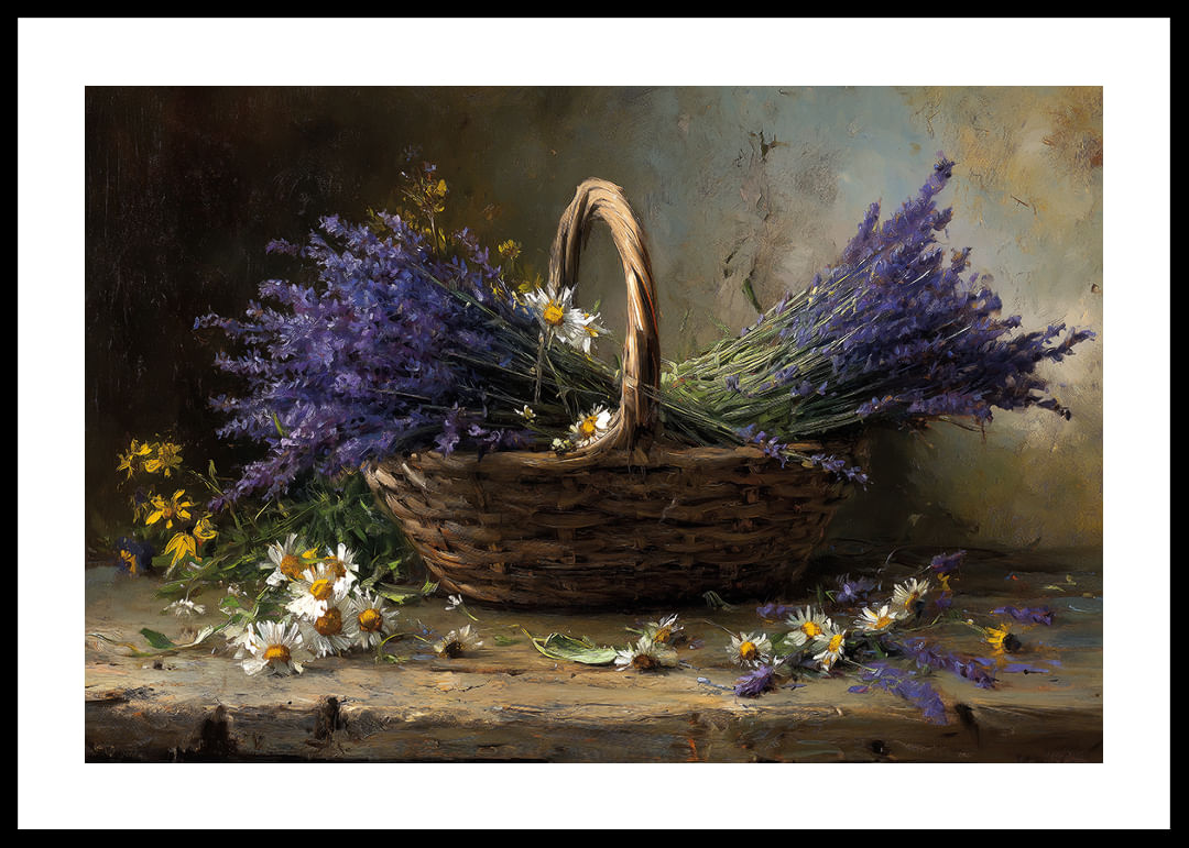 Denna poster förmedlar en harmonisk och lantlig känsla med sin vackra korg fylld av lila lavendel och vita prästkragar. Den milda färgpaletten av blått och vitt smälter samman för att skapa en känsla av ro och enkelhet. Placeringen av blommorna ger ett sken av vild skönhet som naturligt kompletterar alla rum. Postern blir en perfekt del av inredningen och förhöjer stämningen med sin mjuka närvaro.