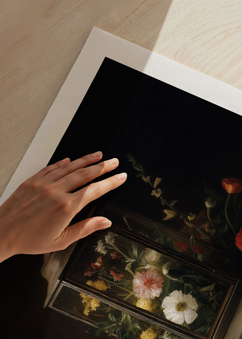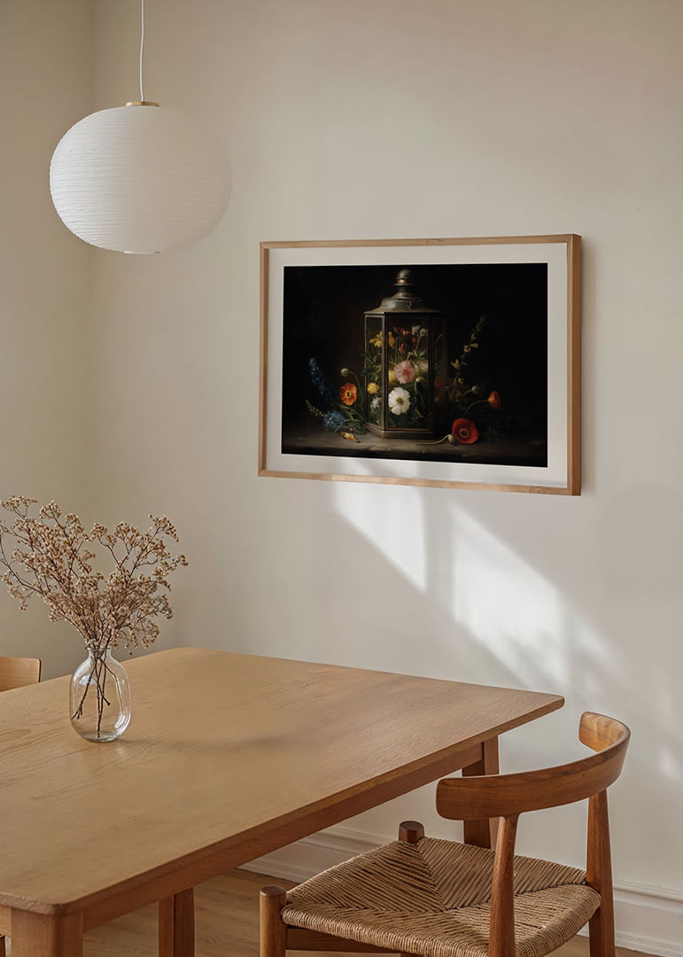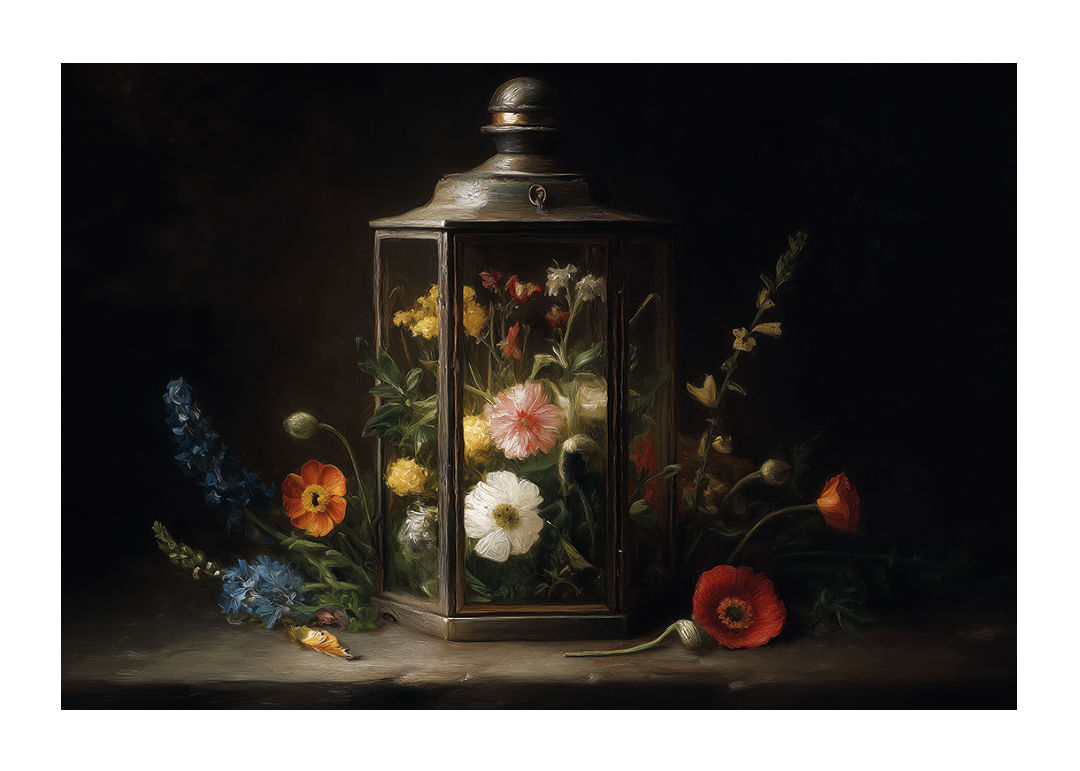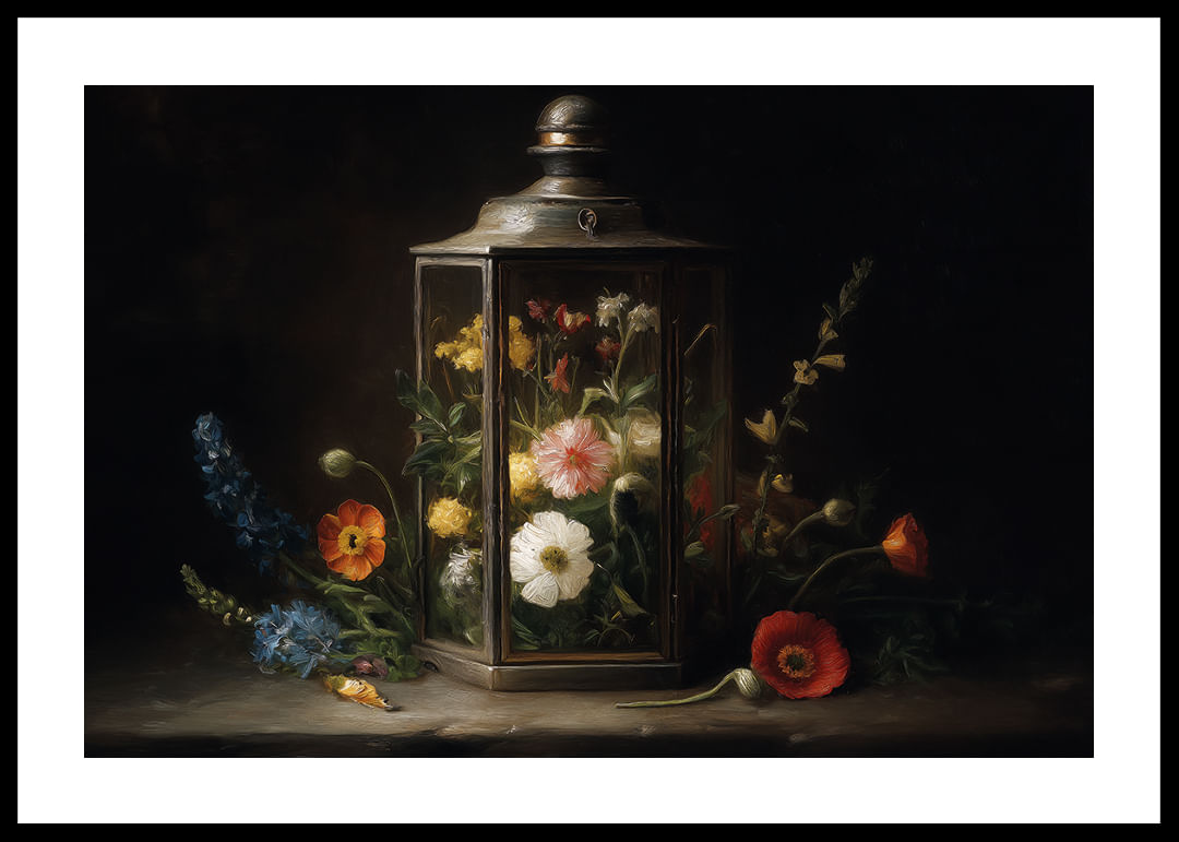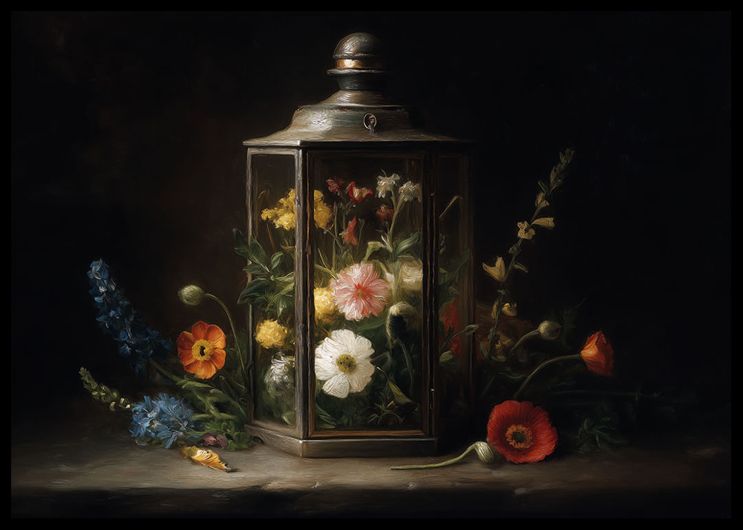 En harmonisk poster som fångar skönheten av blommor inneslutna i en antik lykta. De färgglada kronbladen kontrasterar mjukt mot den mörka bakgrunden och skapar en känsla av evig sommar. Denna poster förvandlar vilket rum som helst till en fristad av lugn och skönhet, med sin kombination av naturlig elegans och nostalgisk charm. Perfekt för att ge värme och liv åt hemmets väggar.