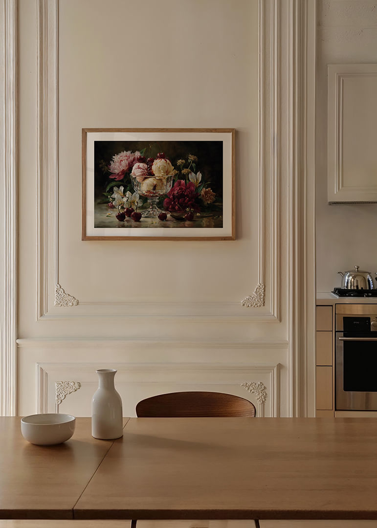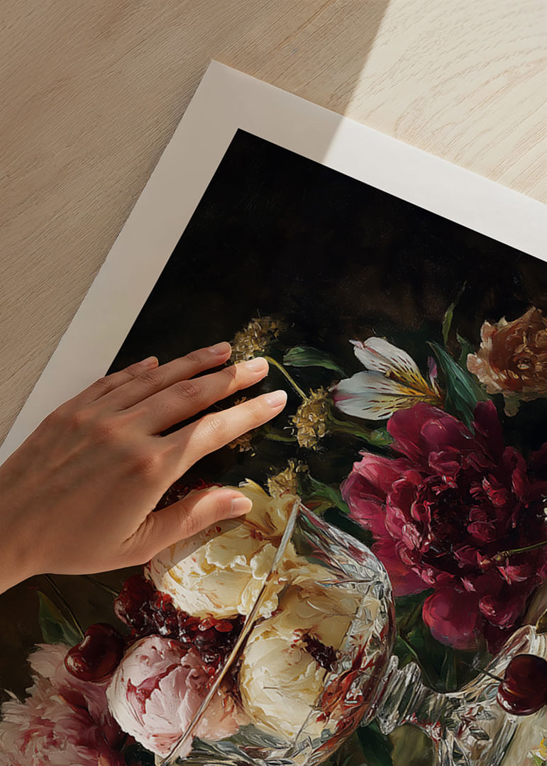 Denna poster fångar en lyxig scen med krämig glass dekorerad med saftiga körsbär och inramad av en rik blomsterprakt. De levande färgerna och den detaljrika kompositionen förmedlar en känsla av exklusivitet och elegans. Posterns detaljer skapar ett blickfång som sprider en aura av raffinerad skönhet och smakfullhet i vilket rum den än placeras.
