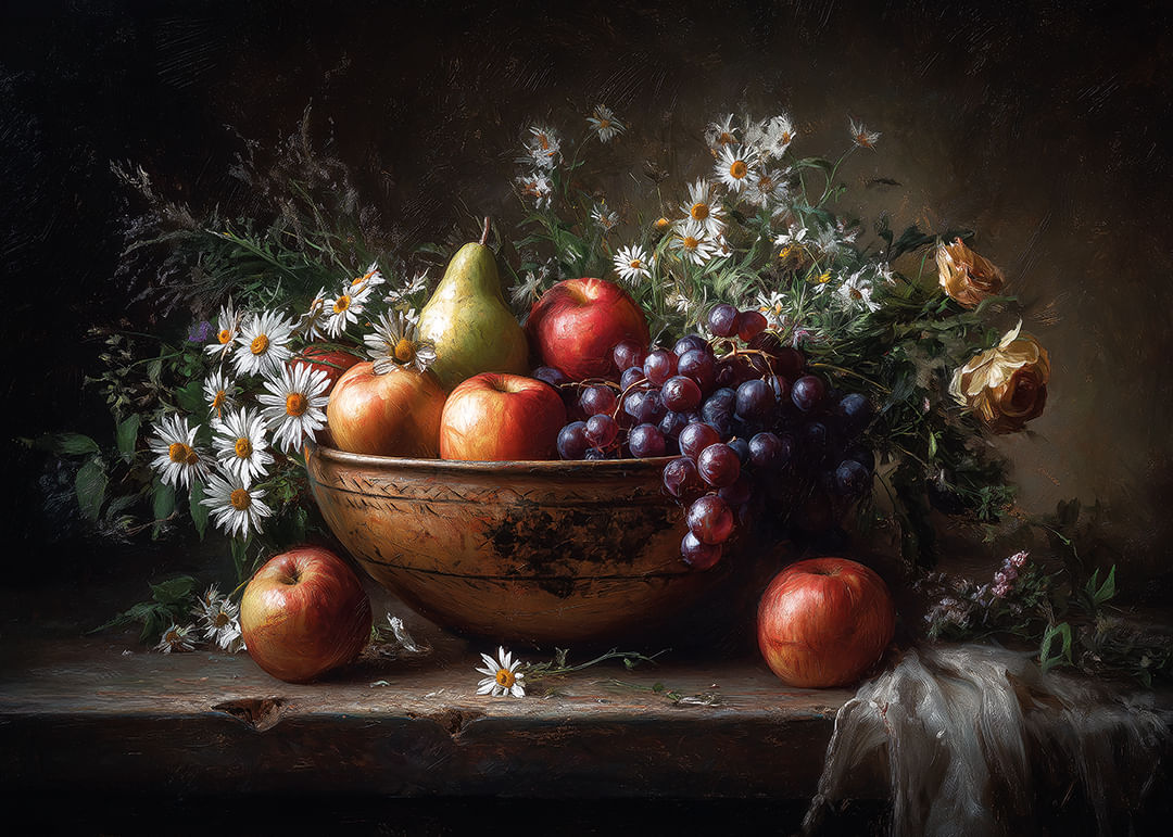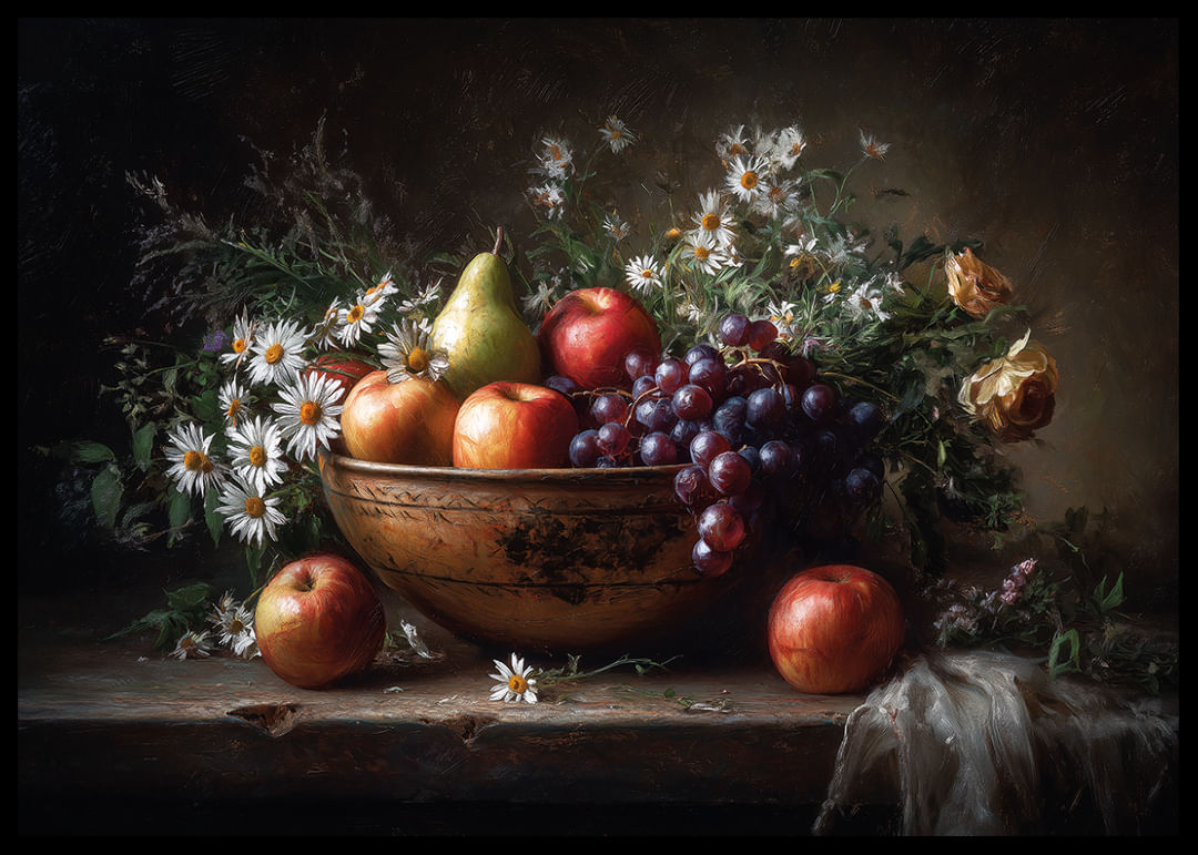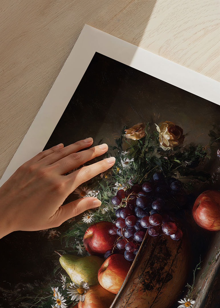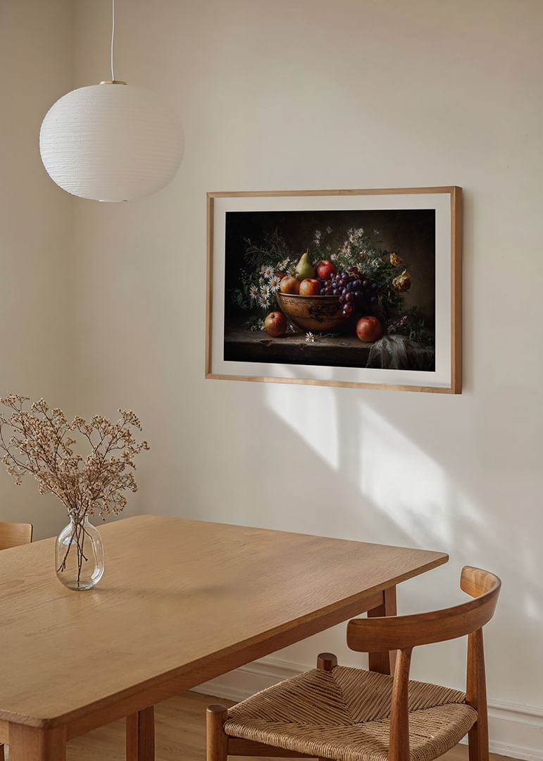 Denna poster fångar essensen av naturlig skönhet med en frodig skål av frukter och färska blommor. De levande färgerna i de saftiga äpplena, päronet och de djuplila druvorna kombineras harmoniskt med florans delikata skönhet. Postern ger en känsla av rikedom och överflöd, och förvandlar vilket hem som helst med sin eleganta och varma atmosfär som skapar ett tidlöst intryck.