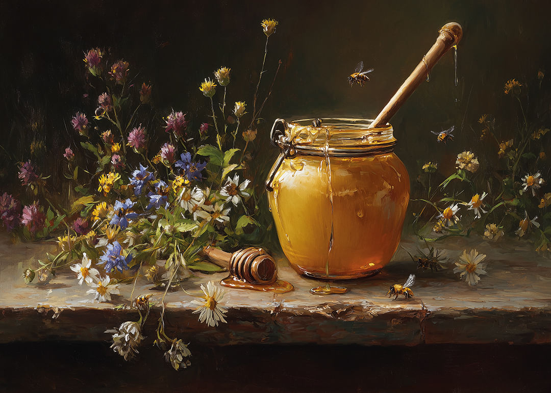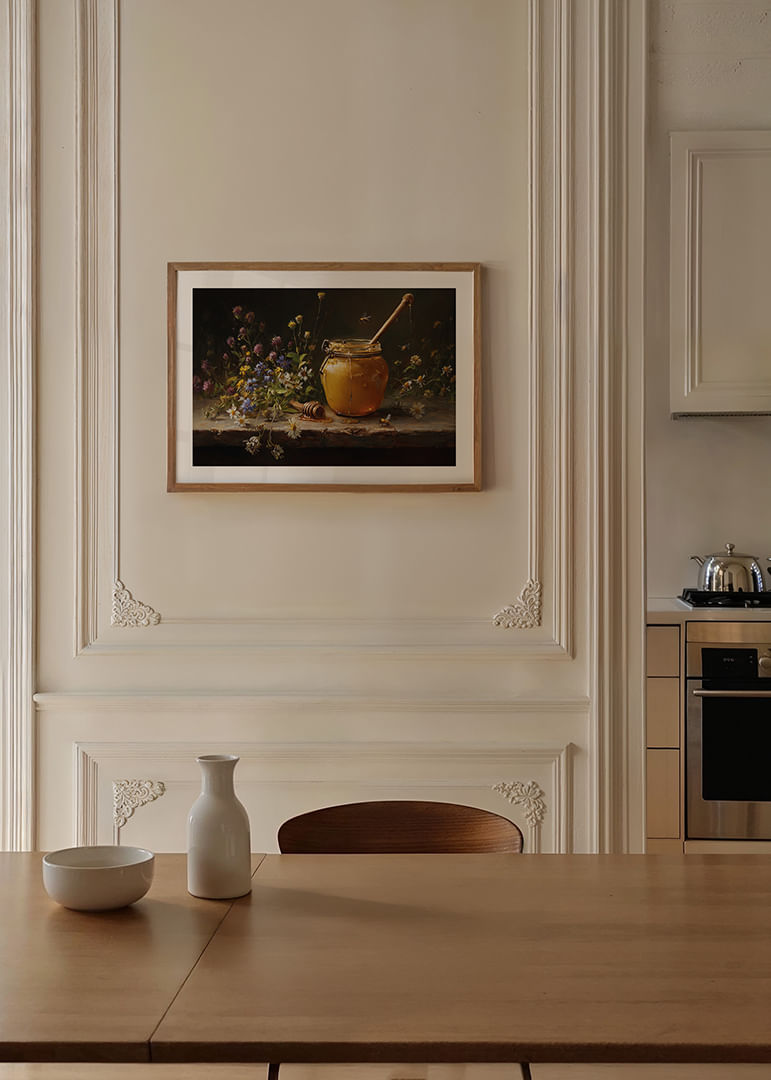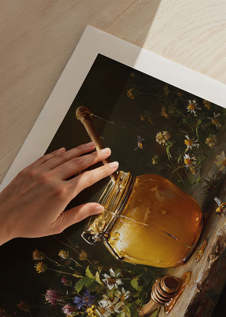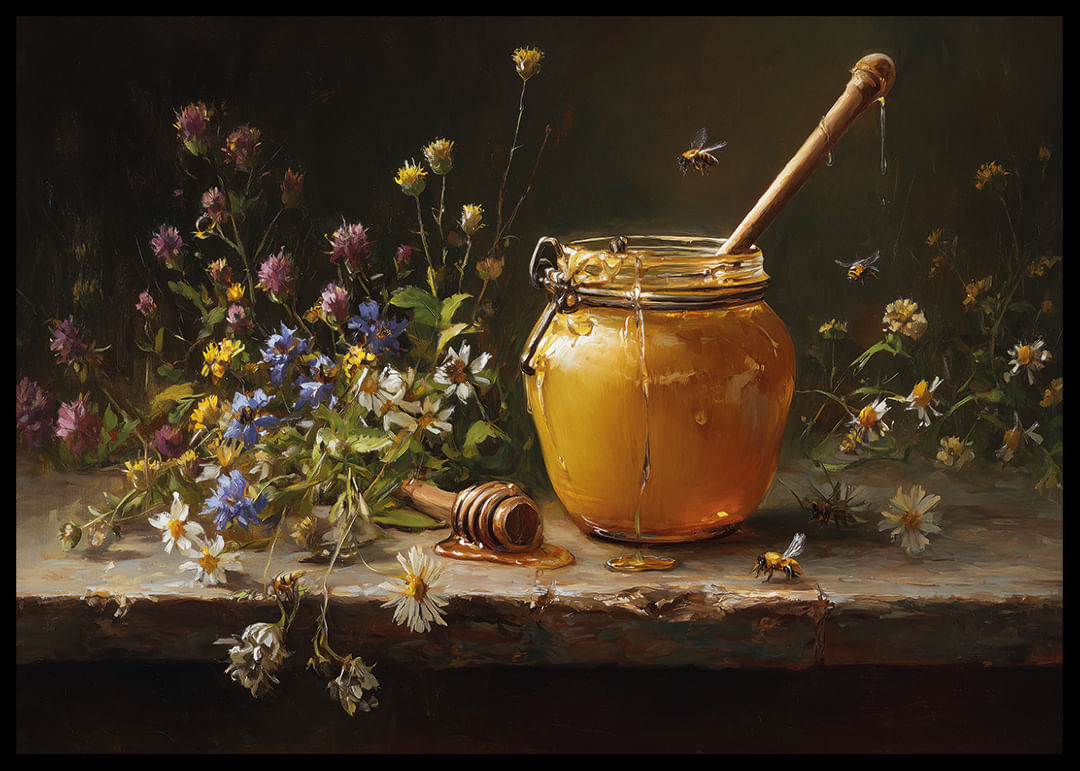 Upptäck en poster där solens gyllene honung smälter samman med blommornas färgsprakande symfoni. Kruset med honung är omgivet av naturens skatter, där varje blomma dansar i harmoni med surrande bin. Denna poster fångar essensen av sommarens rikedom och tillför ett varmt, lantligt inslag till ditt hem, vilket ger rummet liv och en oöverträffad karaktär. En sann ögonfångare.