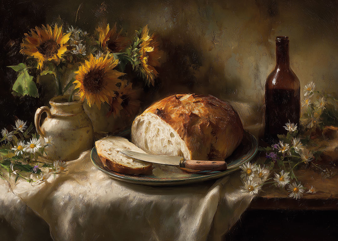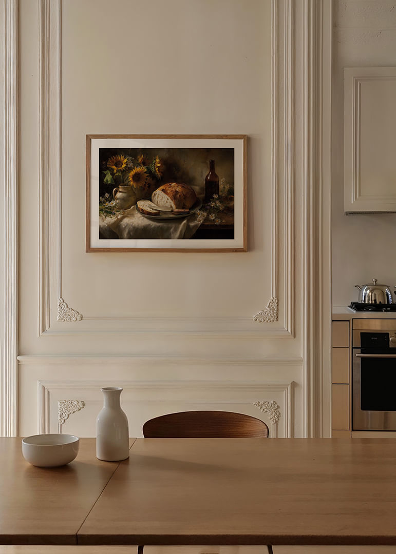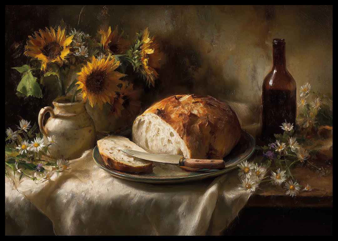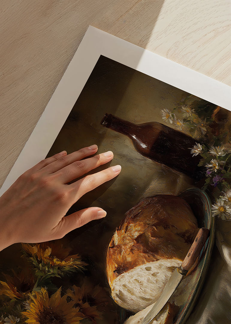 Denna poster fångar en tidlös skönhet med ett stilleben av gyllene solrosor och nybakat bröd. Ljuset flödar in mjukt och ger en hemtrevlig känsla. Tonerna av guld och jord skapar en varm atmosfär, där varje detalj fördjupar upplevelsen. Med sitt subtila skimmer och rustika charm blir denna poster en förtrollande fokuspunkt som berikar och lyfter rummets hela stämning.