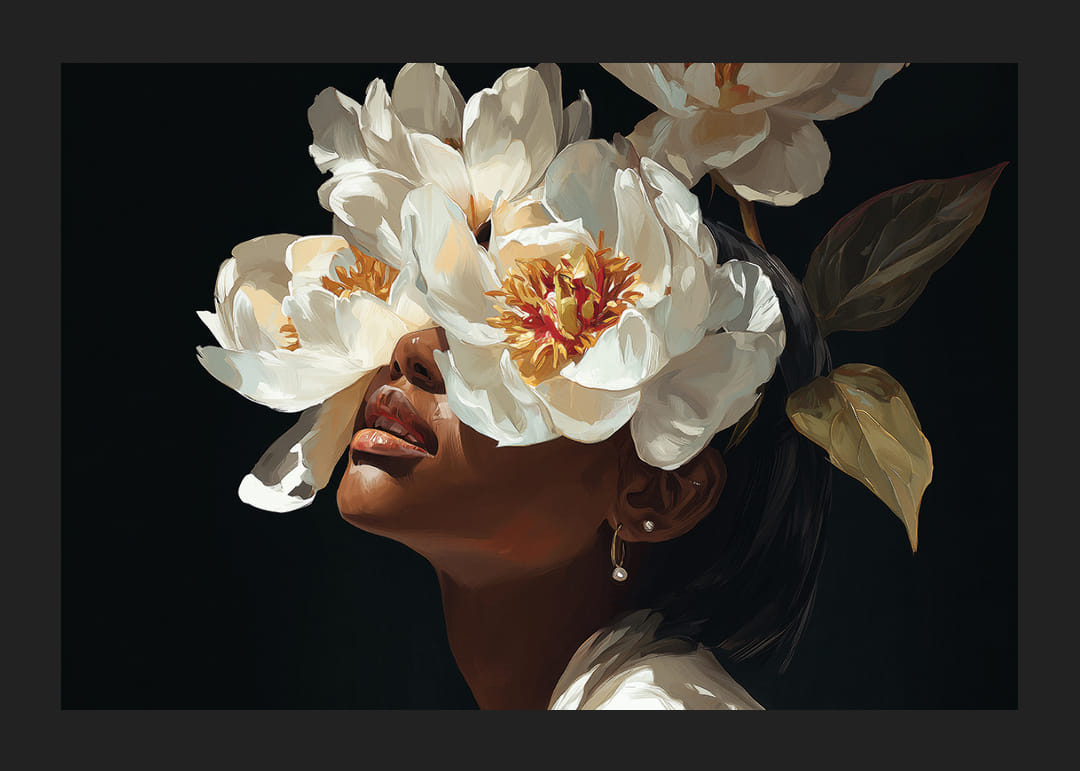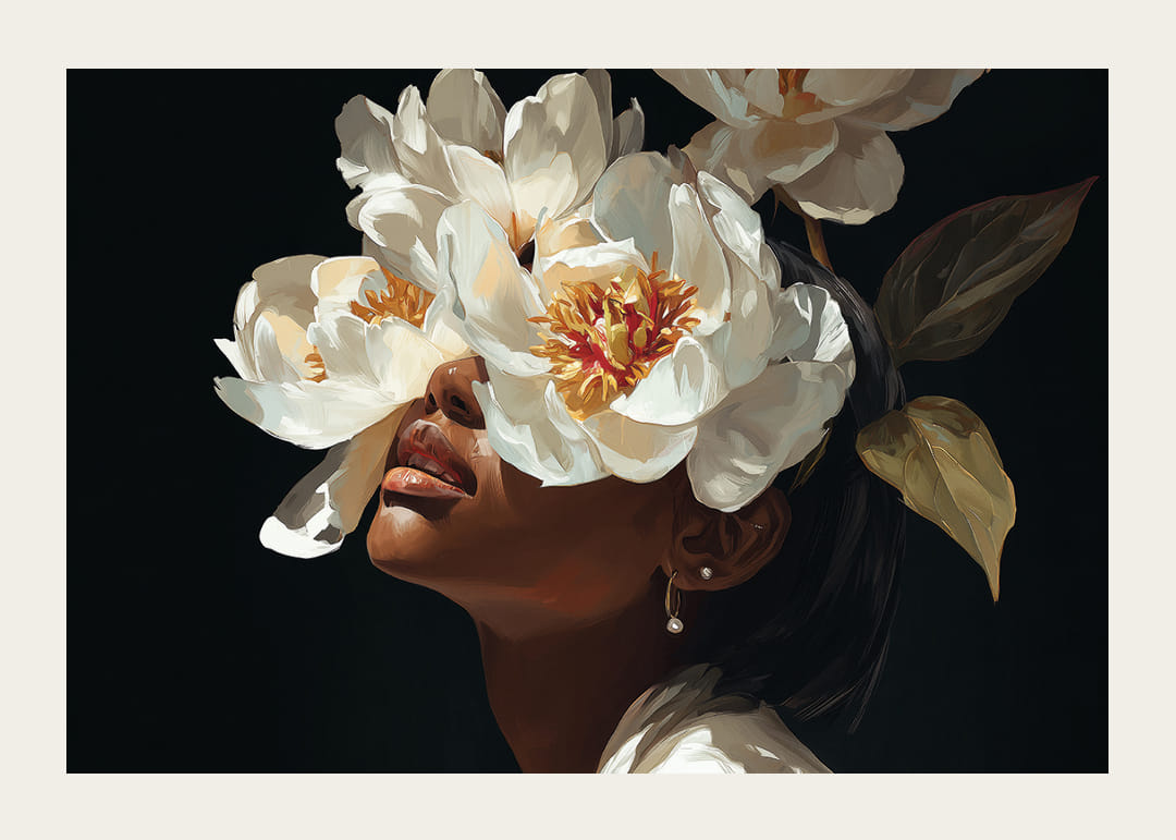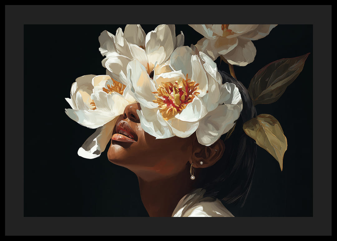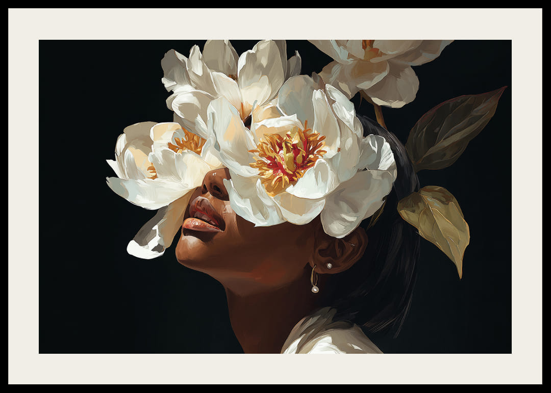 En sensationell blandning av mystik och skönhet inspirerar denna poster, där vitala blomblad sveper runt en ansiktslös gestalt. Den djupa kontrasten mellan de ljusa blommorna och den mörka bakgrunden förstärker känslan av mystik och undran. Denna poster ger ett elegant uttryck till varje rum och inbjuder till reflektion och fascination i din heminredning.