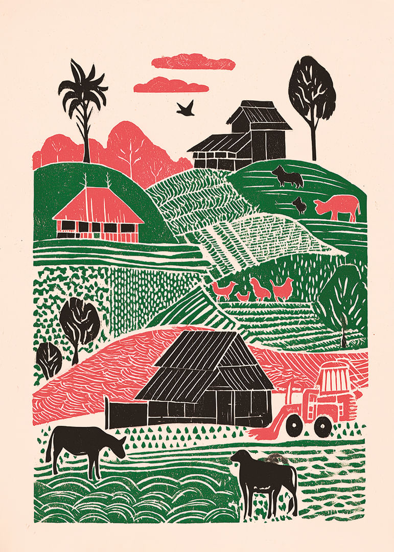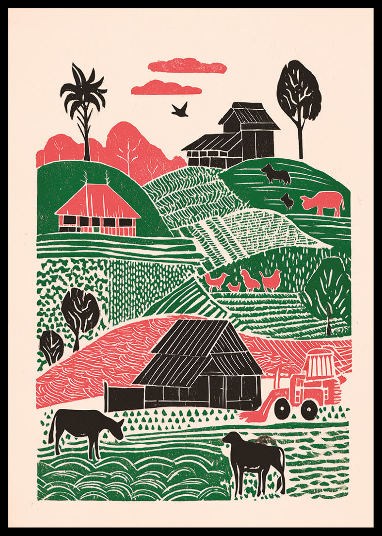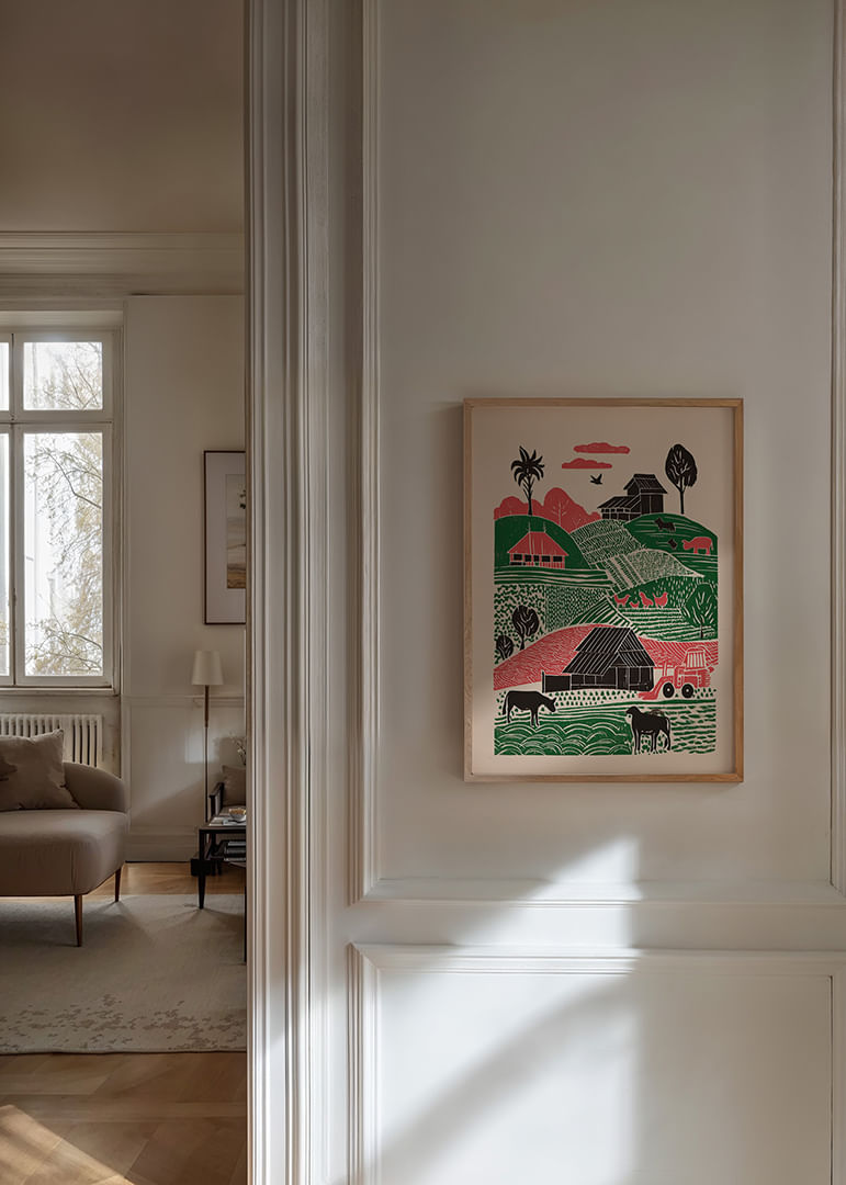Denna poster fångar ett levande landskap med böljande kullar, färgstarka hus och djur i harmoni. De gröna och rosa tonerna skapar en känsla av lugn och pastoral skönhet. Fältens dynamiska mönster ger djup och rikedom till motivet, vilket gör det till en idealisk dekoration i ditt hem. Postern bidrar med en lantlig charm och en känsla av stillhet till vilket rum den än pryder.