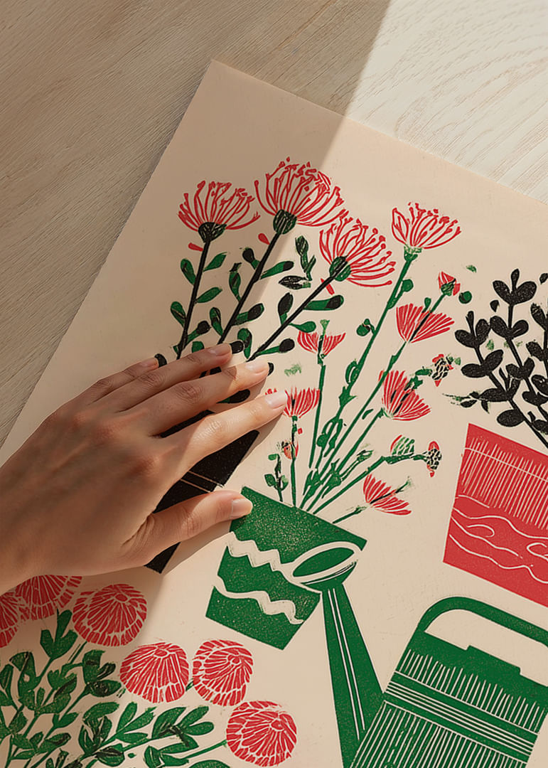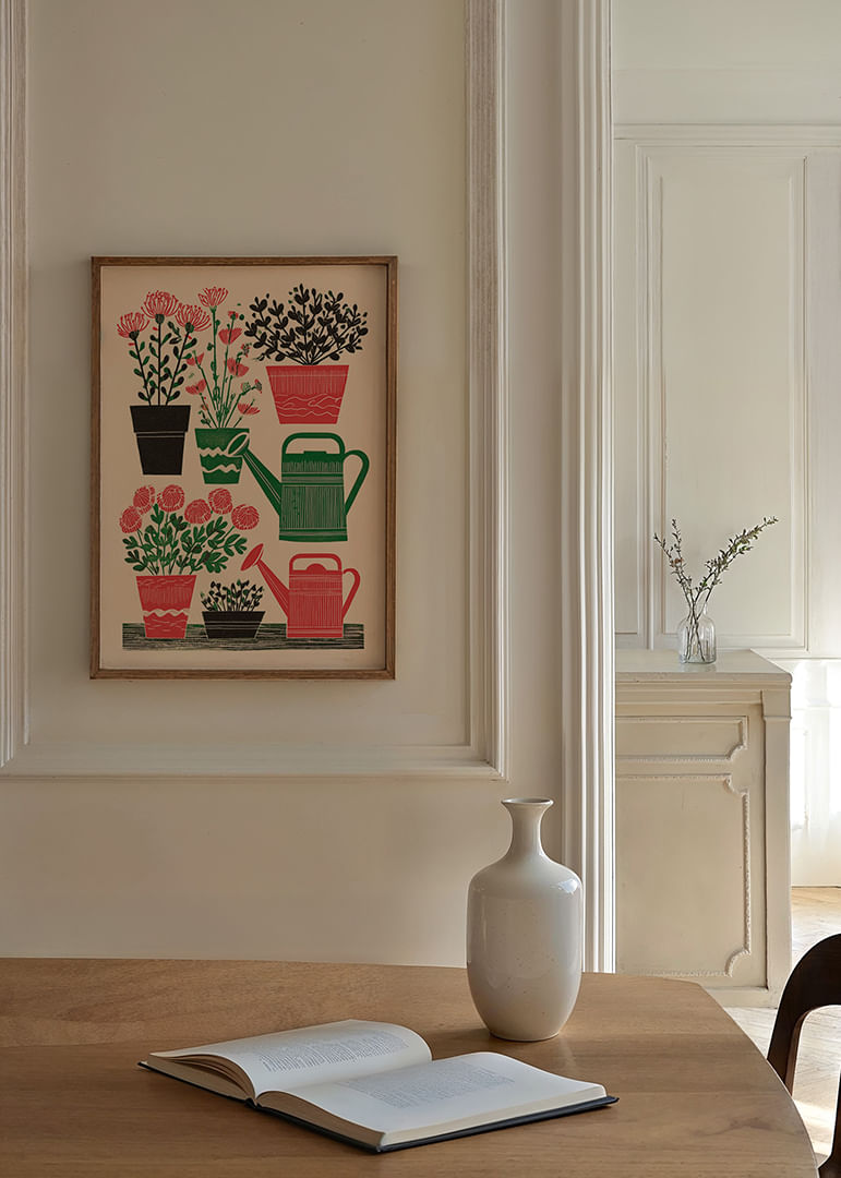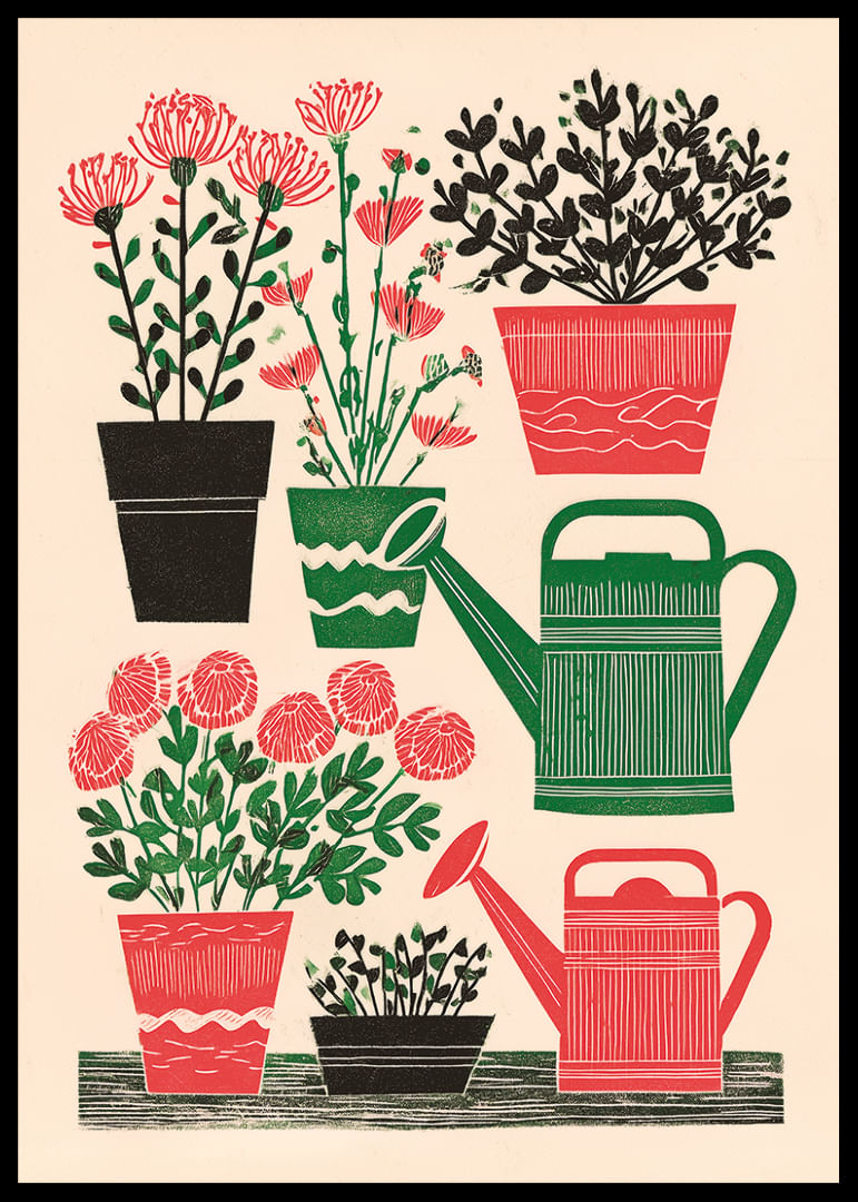 Denna poster fångar ögonen med sina livliga blommor i färgstarka krukor, där kombinationen av gröna, rosa och röda toner skapar en harmonisk känsla. Det stiliserade växtmotivet förmedlar både energi och lugn, vilket gör denna poster perfekt för att lyfta stämningen i vilket rum som helst. Dess dynamiska design ger en unik touch, och bidrar med en naturlig, uppfriskande atmosfär till ditt hem.