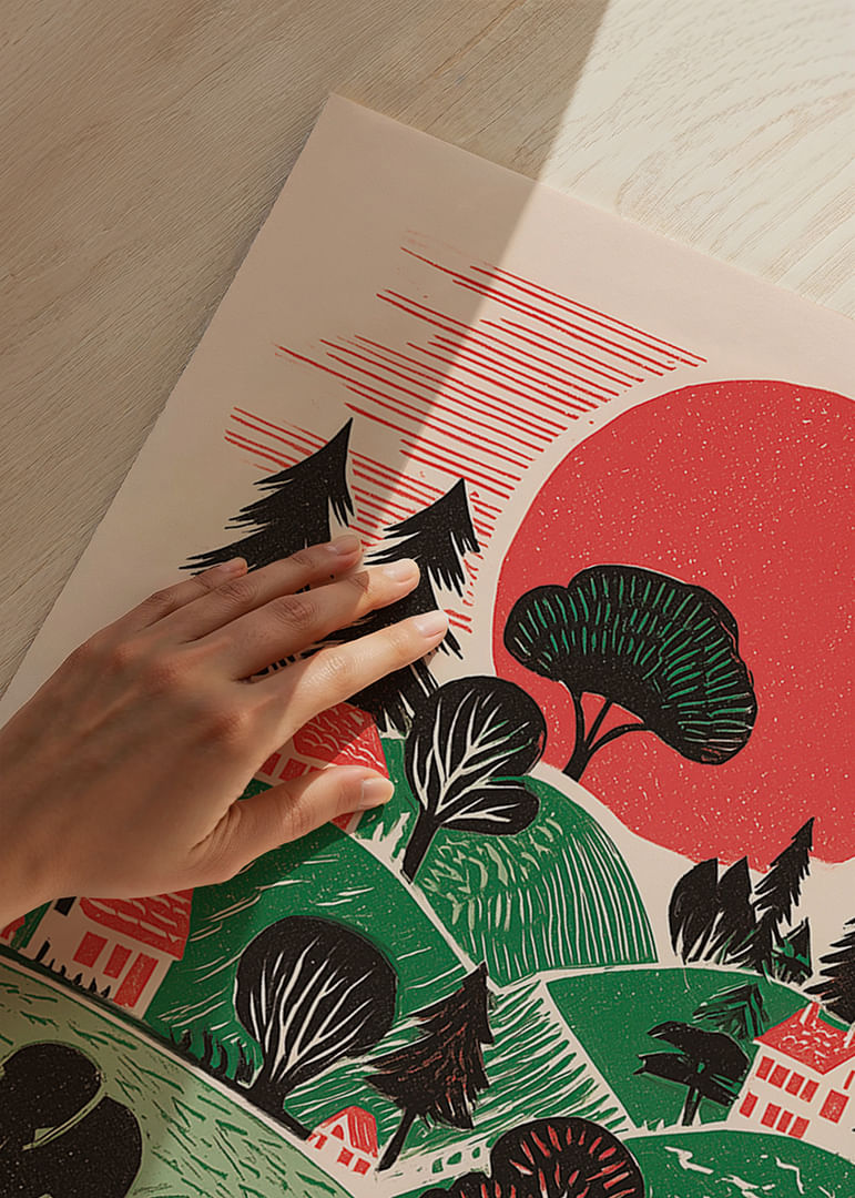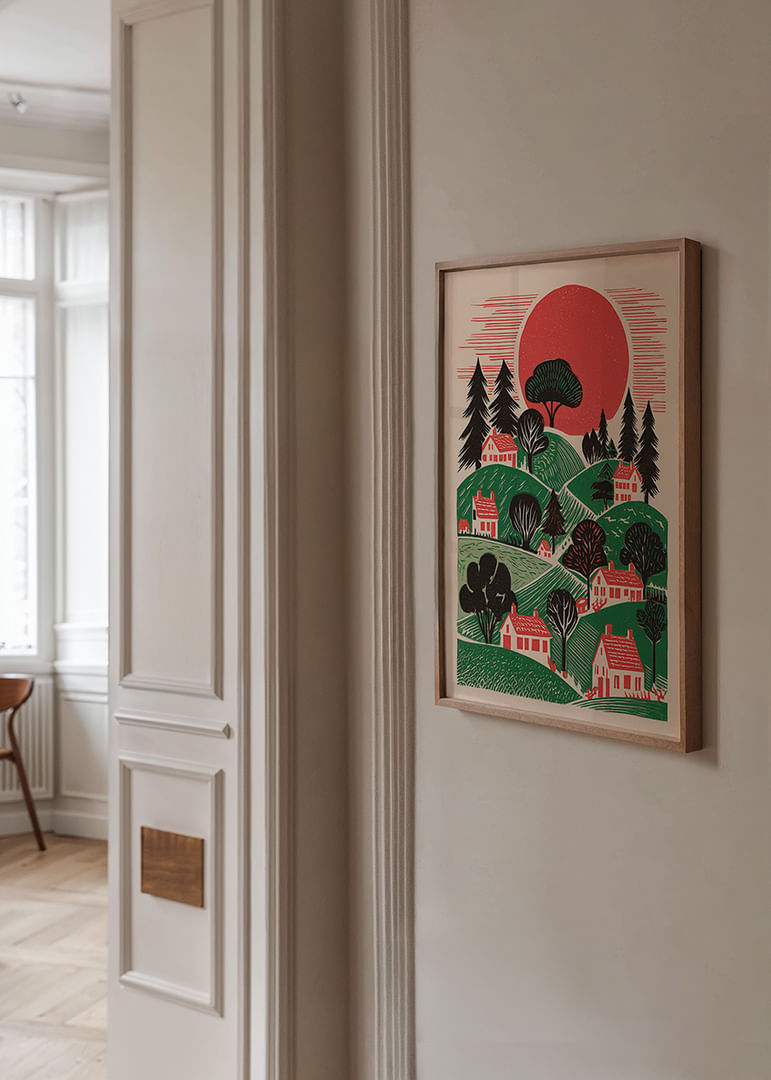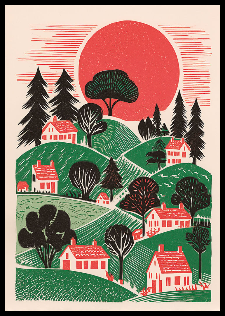 Den här postern fångar en vacker landsbygd med röda och gröna toner, där solen majestätiskt går ner över kullarna. Husen sprider sig som pärlor längs backarna och skapar en rofylld harmoni. Kontrasten mellan färgerna ger en känsla av stillhet och avkoppling. En perfekt poster som lyfter stämningen i vilket rum som helst och tillför en lantlig charm med en touch av dramatisk skönhet.