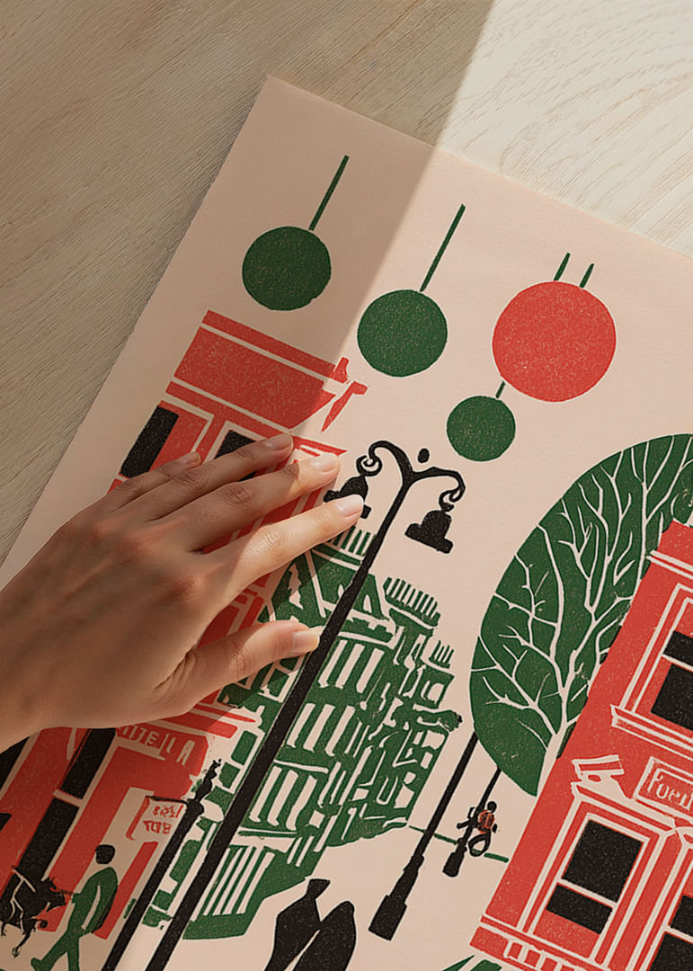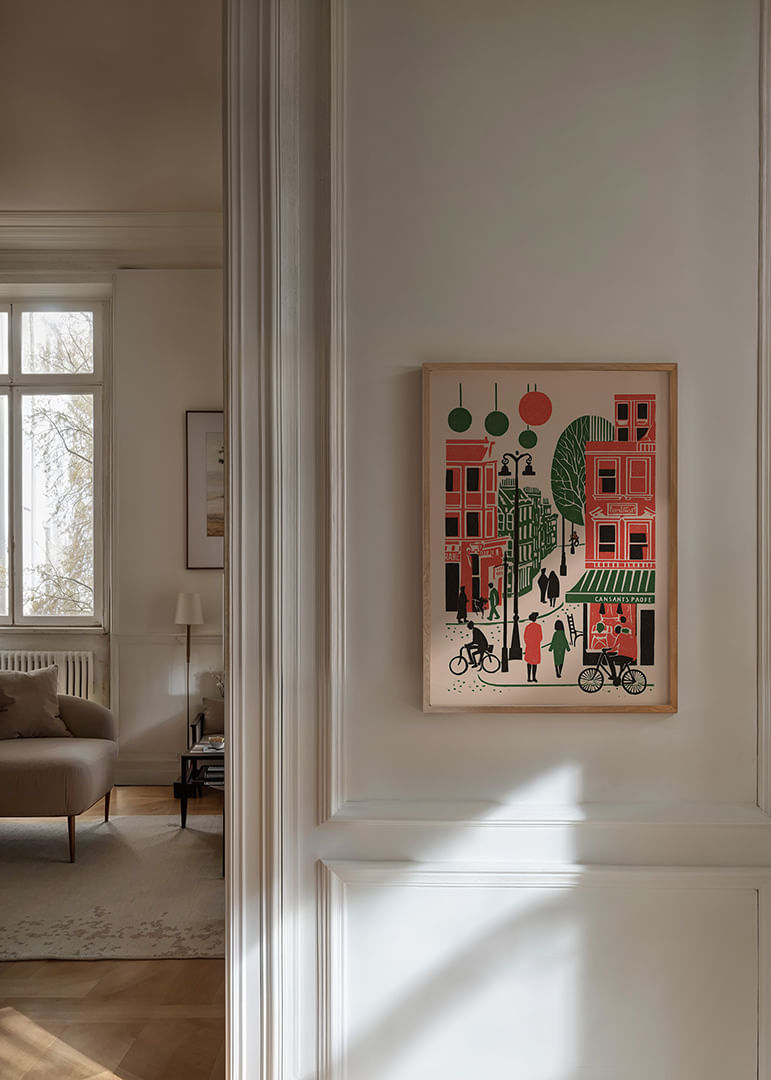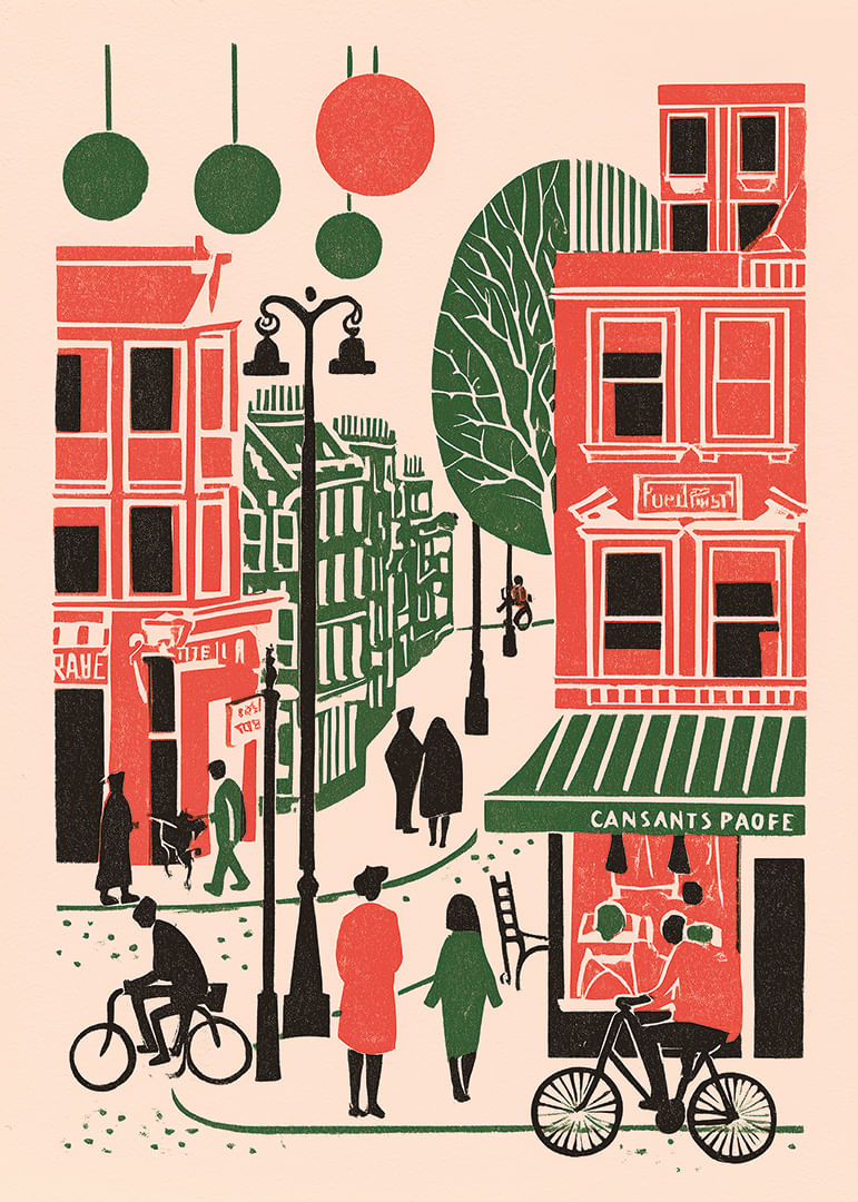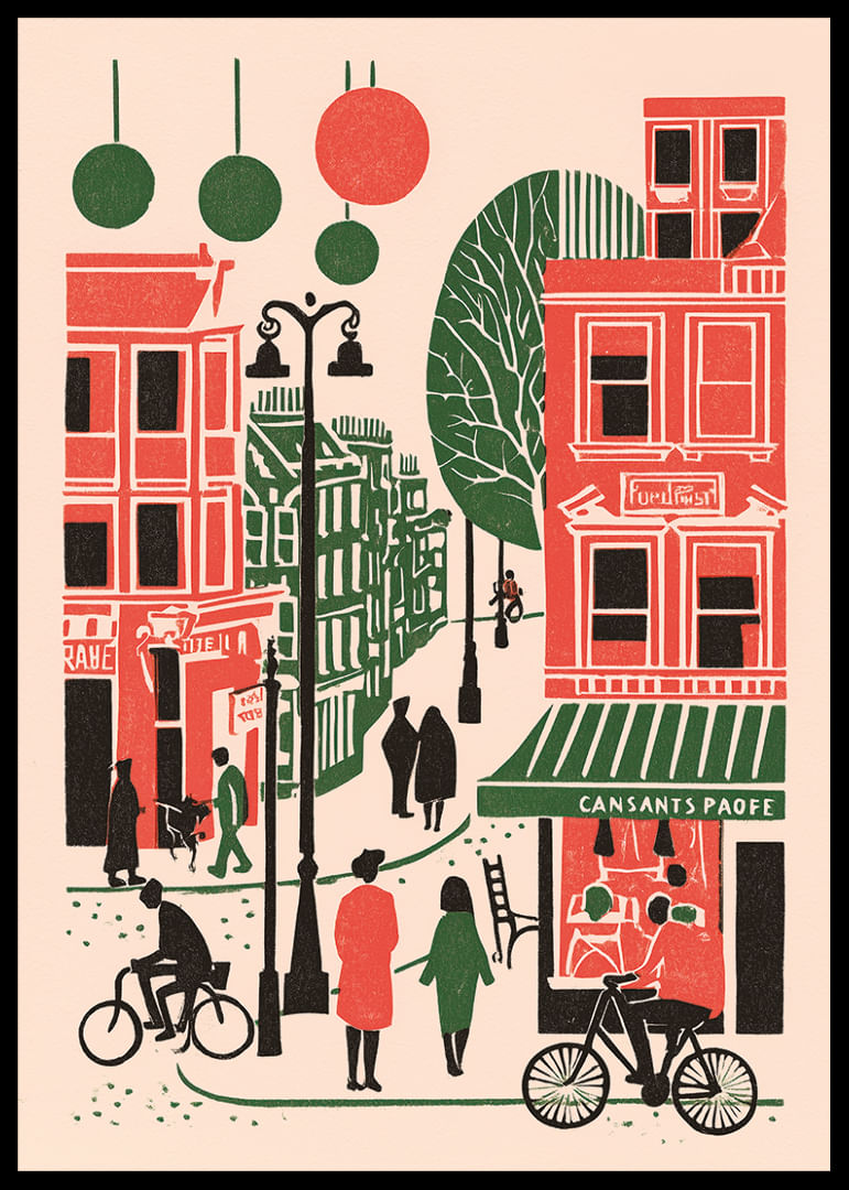 Denna poster bjuder in dig till en färgstark stadsbild fylld av liv och rörelse. De djärva röda och gröna tonerna skapar en kontrast som fångar blickar och framkallar känslor av urban glädje. Människor cyklar och promenerar genom en pittoresk gata, vilket ger en känsla av gemenskap och energi. Postern förvandlar vilket rum som helst till en levande hyllning av storstaden, där liv och rörelse aldrig upphör.