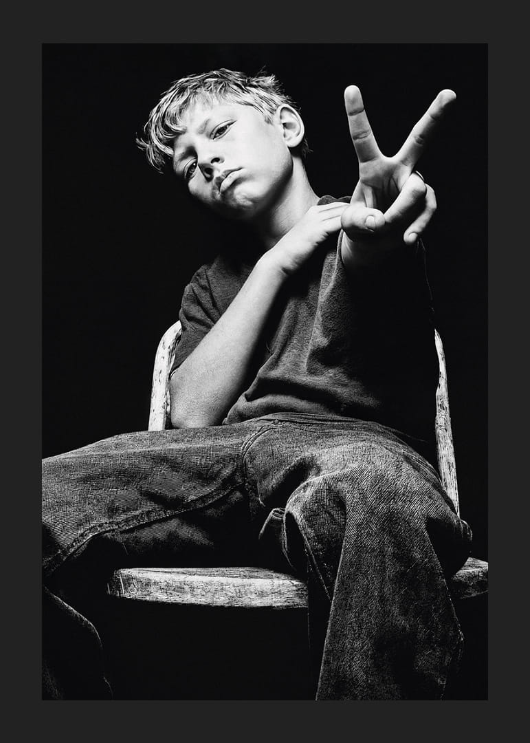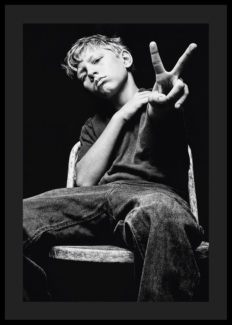 Ett svartvitt fotografi som fångar en ung pojkes självsäkerhet, orädda attityd och en känsla av att allt är möjligt. Kroppsspråket och det tydliga Peace-tecknet berättar om en generation som möter framtiden med en bekymmerslös framtidstro. Denna poster är en del av kollektionen "Face the truth" där varje köp stödjer The Non-Violence Projects viktiga arbetet med att förebygga våld. Kollektionen hyllar människans emotionella kraft och speglar Non-Violence Projects vision om en värld där konflikter hanteras med förståelse istället för våld. En poster för dig som vill inreda med mening – och stå upp för något större.