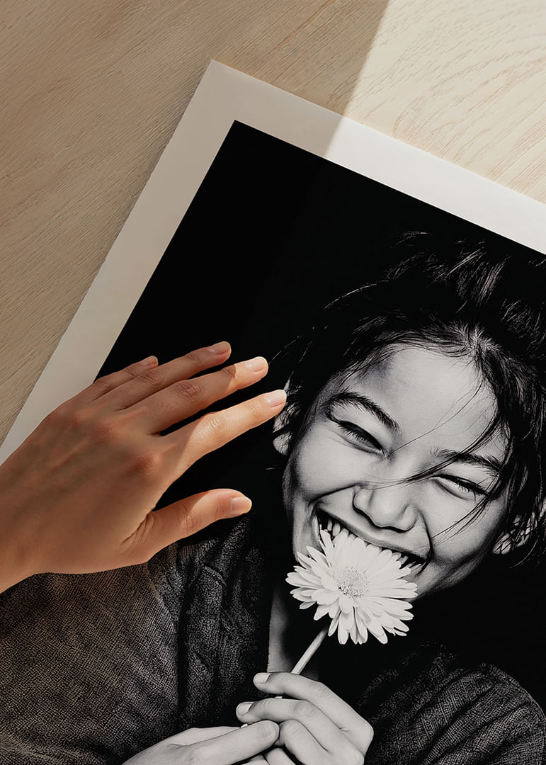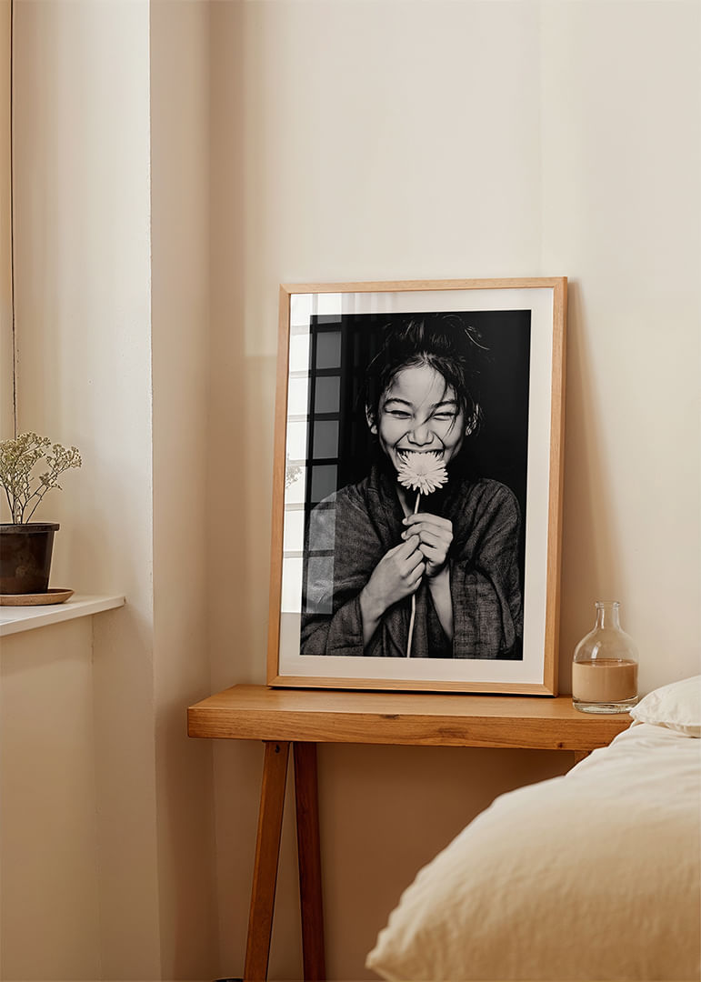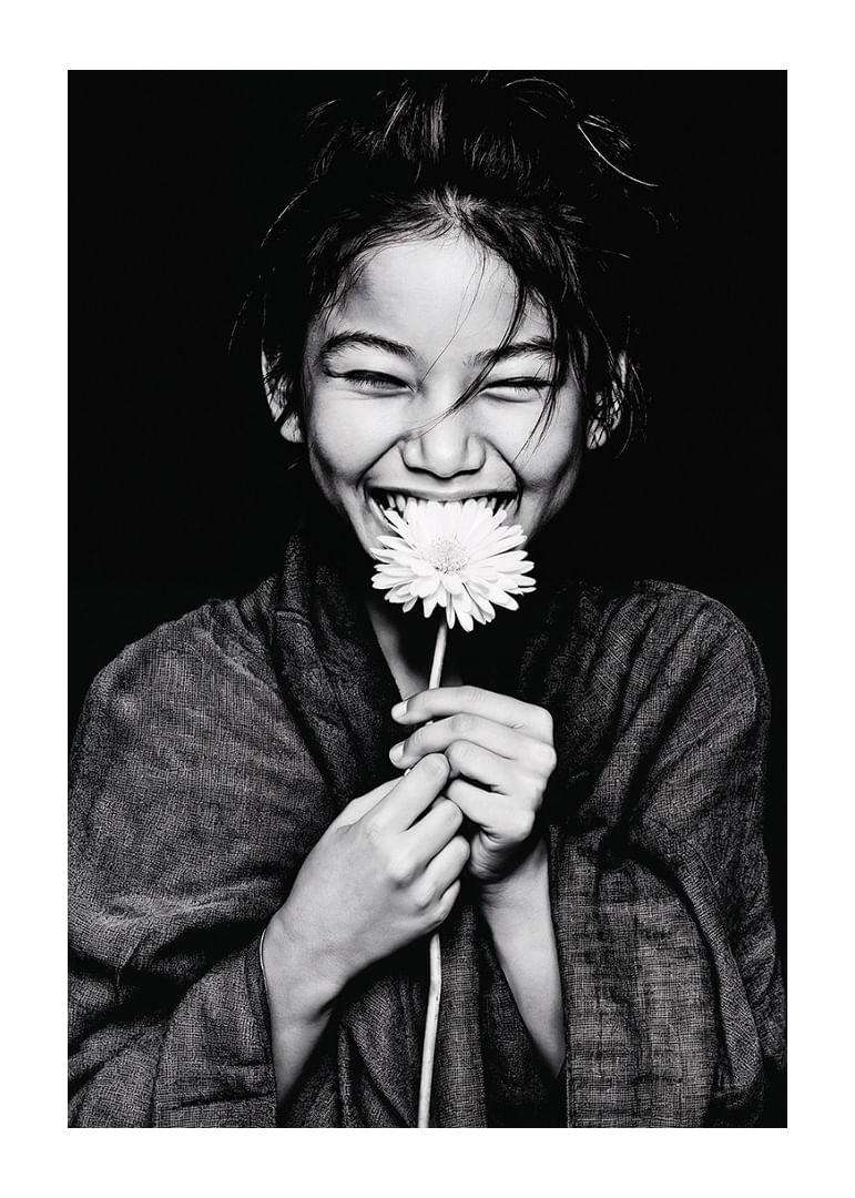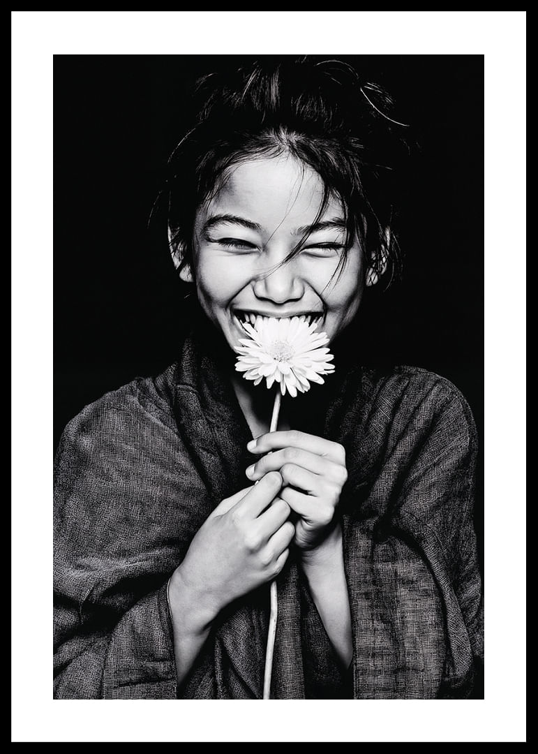 Ett fotografi som fångar den rena glädjen hos ett lyckligt barn – ett leende så strålande att det smittar och är omöjligt att värja sig mot. Med en blomma som enkel symbol för hopp och liv påminner bilden oss om att styrka ibland finns i det allra enklaste: att våga sprida ljus och värme. Denna poster är en del av kollektionen "Face the truth" där varje köp stödjer The Non-Violence Projects viktiga arbetet med att förebygga våld. Kollektionen hyllar människans emotionella kraft och speglar Non-Violence Projects vision om en värld där konflikter hanteras med förståelse istället för våld. En poster för dig som vill inreda med mening – och stå upp för något större.