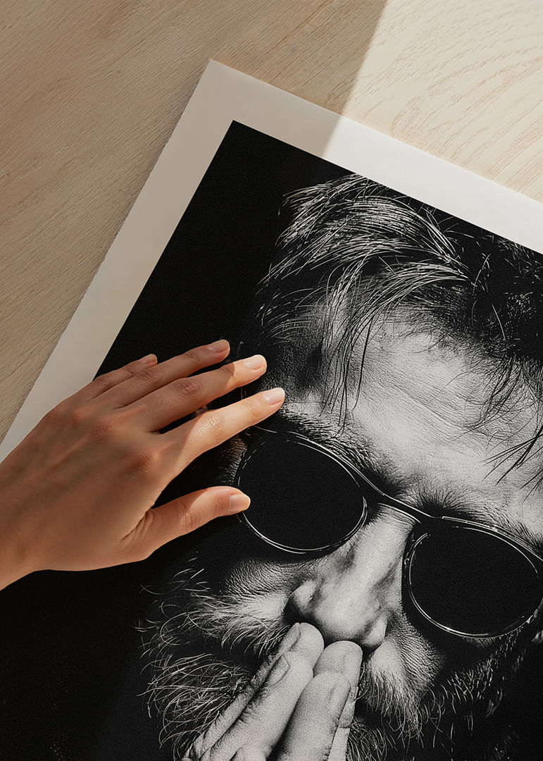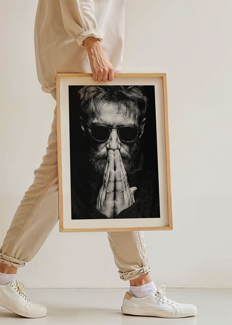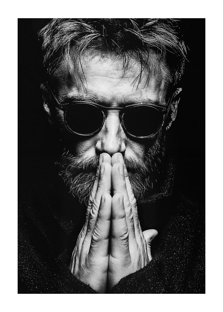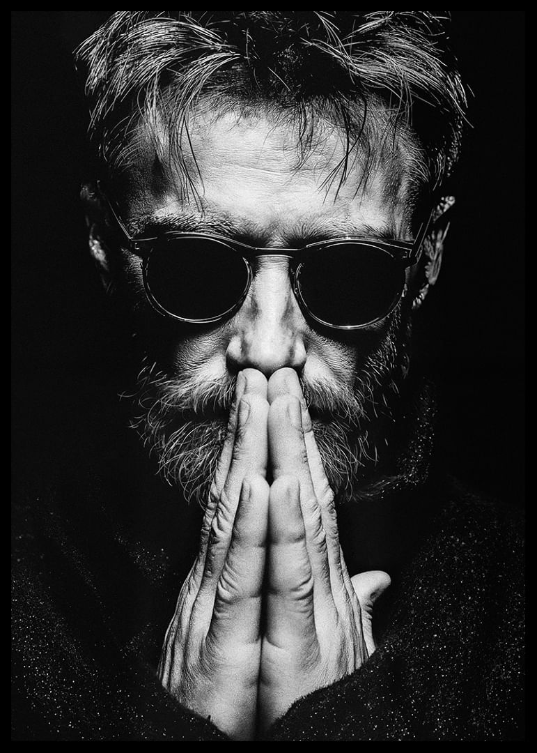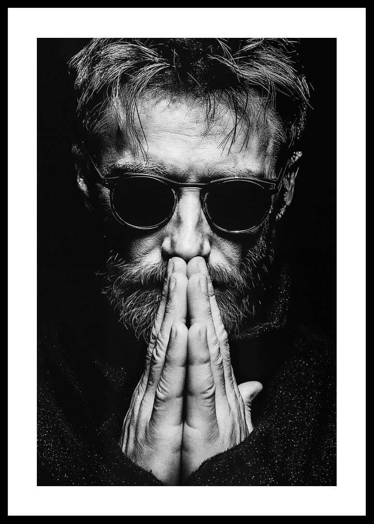 Ett svartvitt porträtt som fångar ett ögonblick av djup eftertanke – ett andetag mellan då och nu. Med slutna ögon bakom mörka glasögon och händerna tätt ihop framför ansiktet, förmedlar bilden en inre resa av eftertänksamhet och förlåtelse. Denna poster är en del av kollektionen "Face the truth" där varje köp stödjer The Non-Violence Projects viktiga arbetet med att förebygga våld. Kollektionen hyllar människans emotionella kraft och speglar Non-Violence Projects vision om en värld där konflikter hanteras med förståelse istället för våld. En poster för dig som vill inreda med mening – och stå upp för något större.