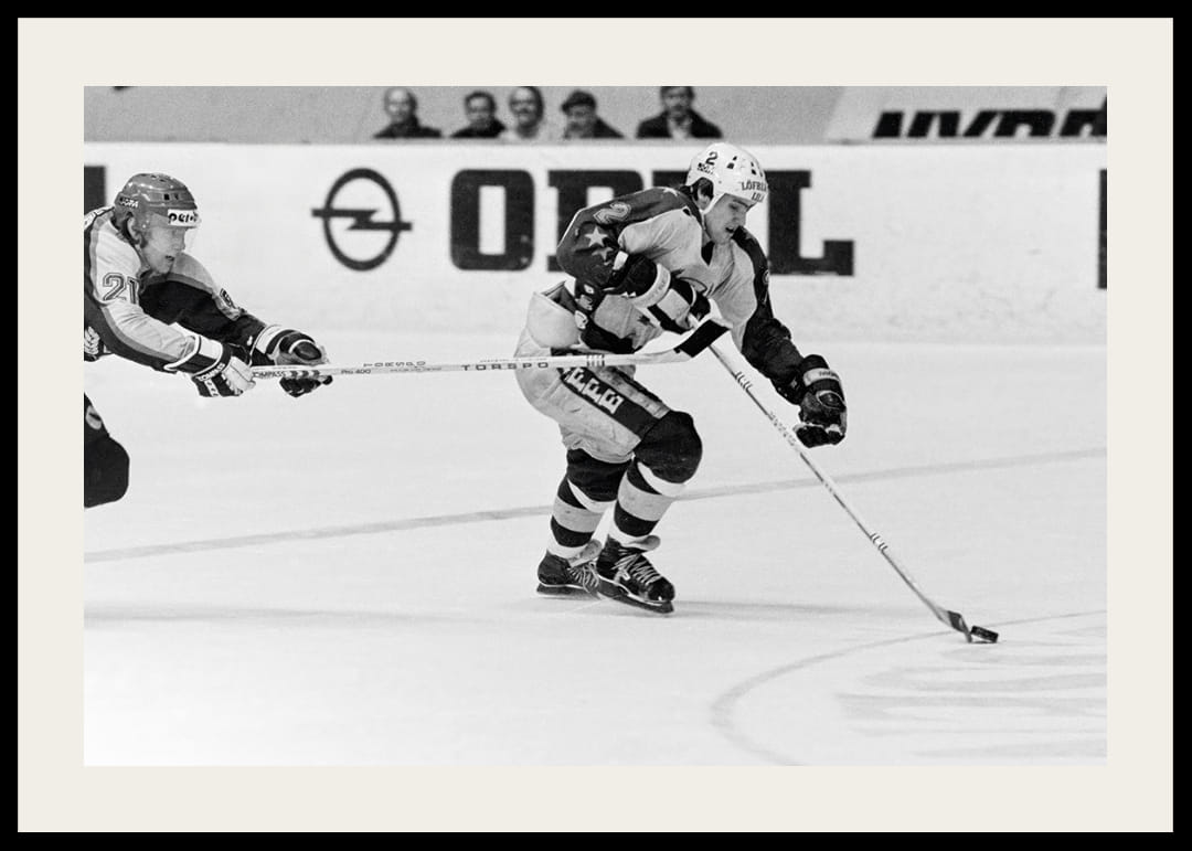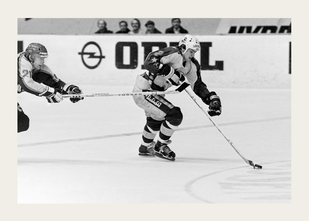 Tommy Samuelsson med pucked under kontroll i en match mot Djurgården i SM-Semifinal 1979