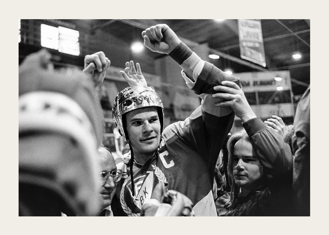 Thomas Rundqvist firar SM-guld då Färjestad BK blev Svenska Mästare efter vunnit med 6-3 mot Björklöven i match 4 1988.