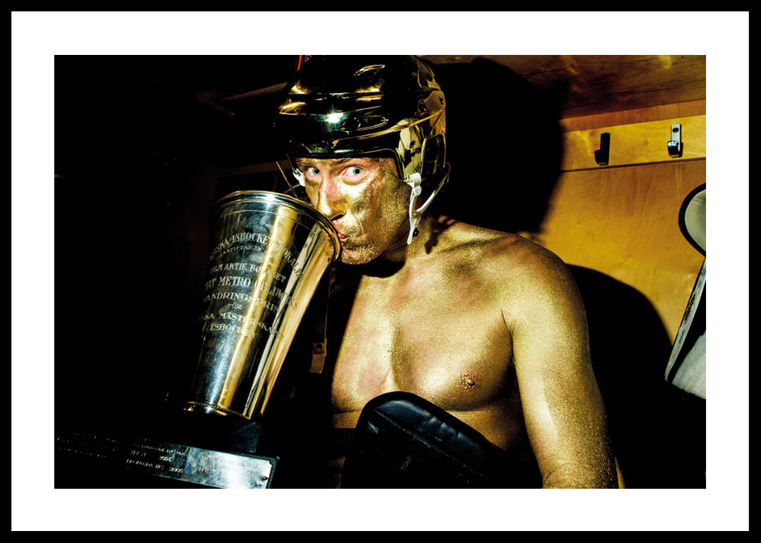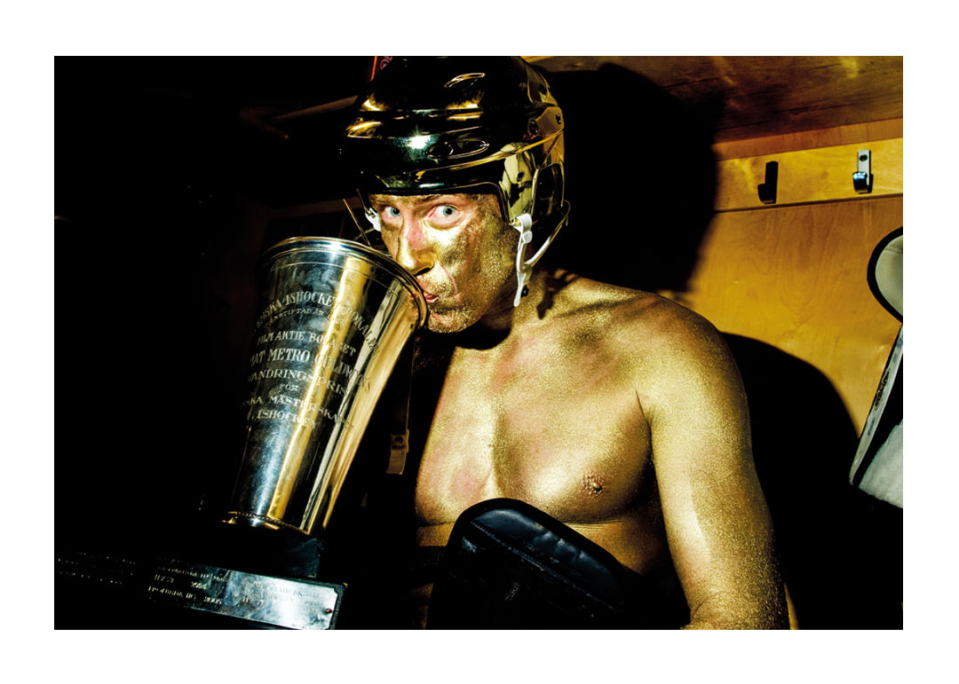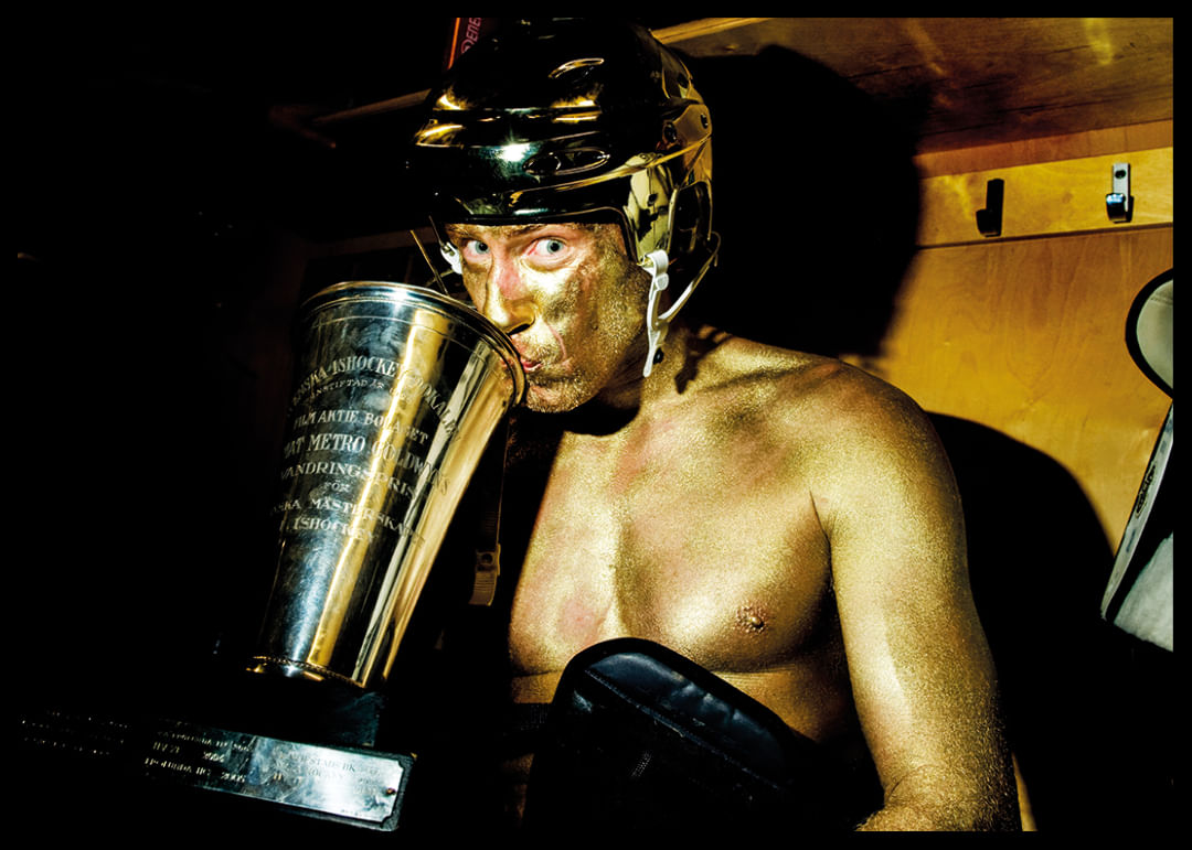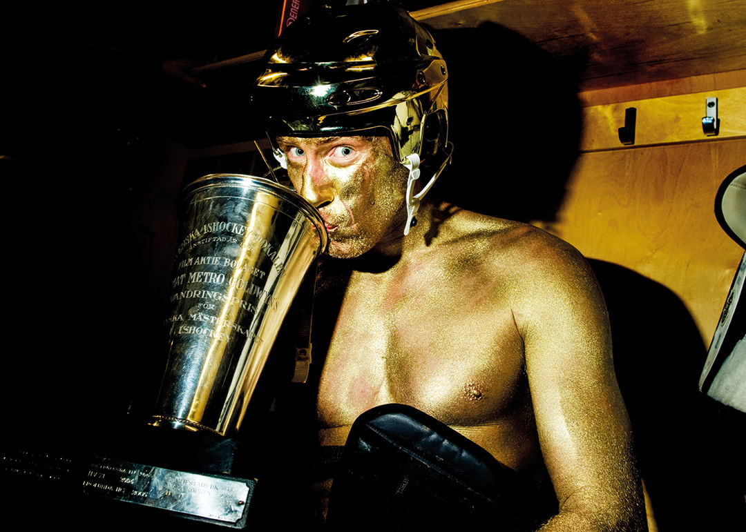 Jörgen Jönsson sitter guldmålad med Le Mat-pokalen efter SM-guldet mot HV71 2009.