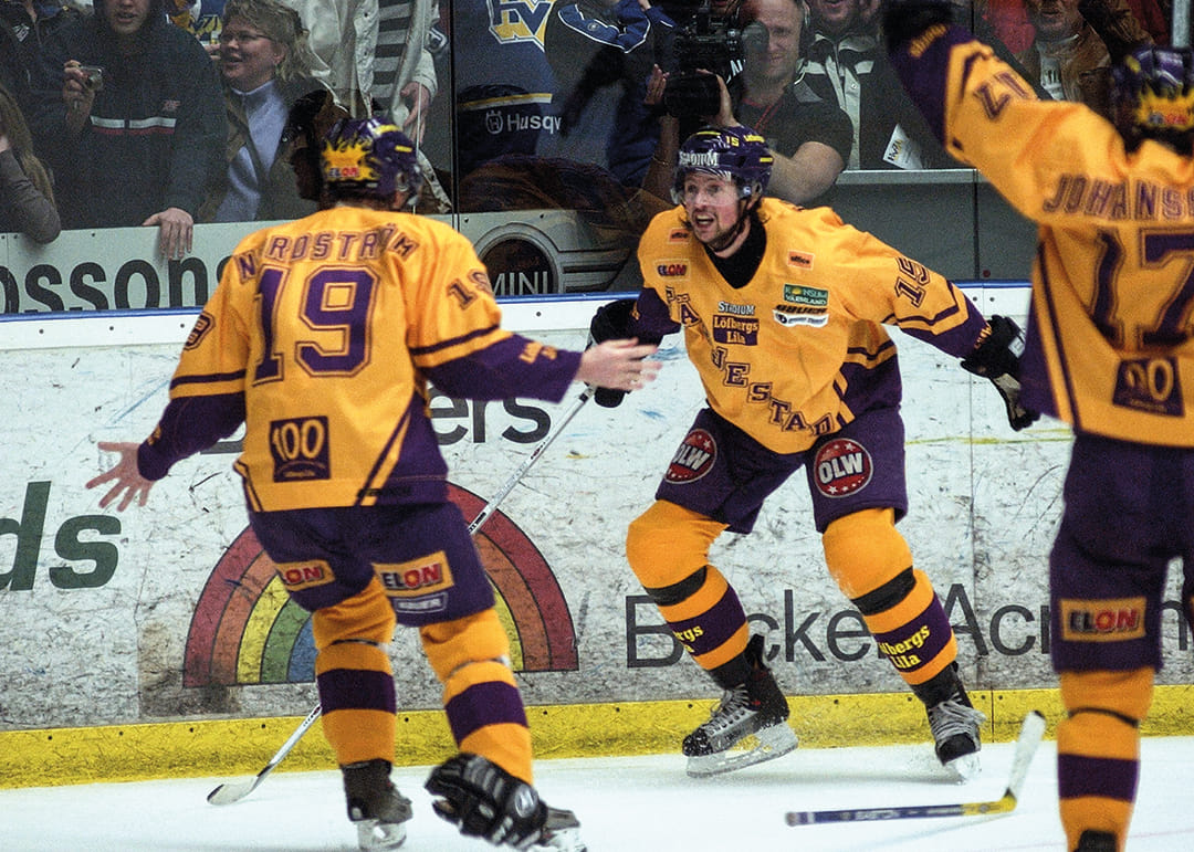 Rickard Wallin och Peter Nordström firar tillsammans efter det avgörande 4-3 målet mot HV71 i semifinalen 2006.