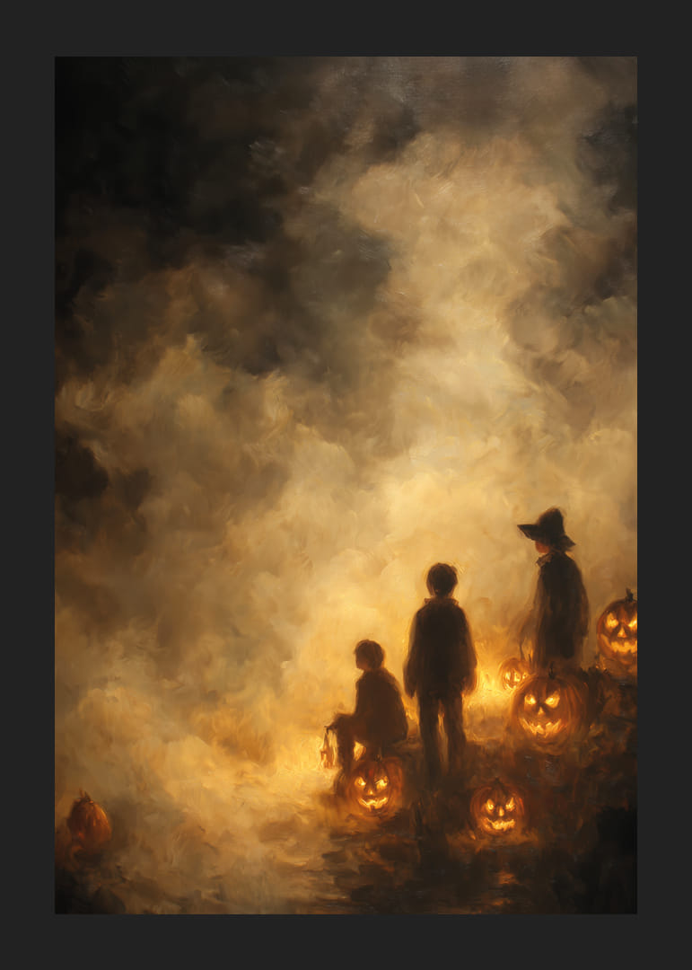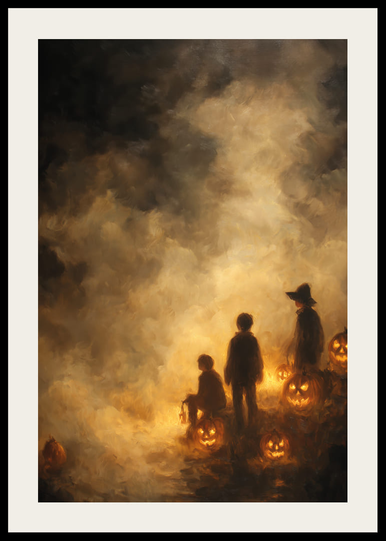 Denna poster fångar en mystisk och förtrollande atmosfär med sina barn som står bland lysande pumpalyktor i ett disigt sken. Mörka silhuetter och glimmande detaljer ger en känsla av äventyr och mystik. Denna poster är idealisk för att skapa en varm och gåtfull stämning i hemmet, perfekt för att framkalla nostalgiska höstminnen och omfamna höstens magiska charm.