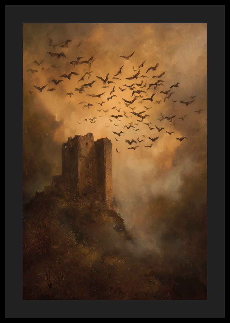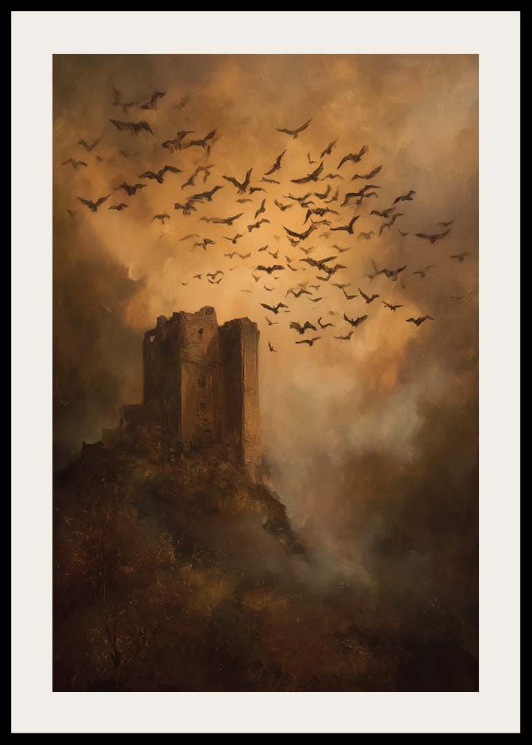 Fånga mystiken med denna poster som visar en övergiven borg omgiven av en dramatisk flock fåglar under en gyllene skymning. Varje detalj framhäver en känsla av tidlöshet och hemligheter. Posterns varma toner och dramatiska uppbyggnad skapar en atmosfär av förundran och mystik i varje rum den placeras i. Den blir ett blickfång, en ö i tiden som berikar din miljö med historia och skönhet.