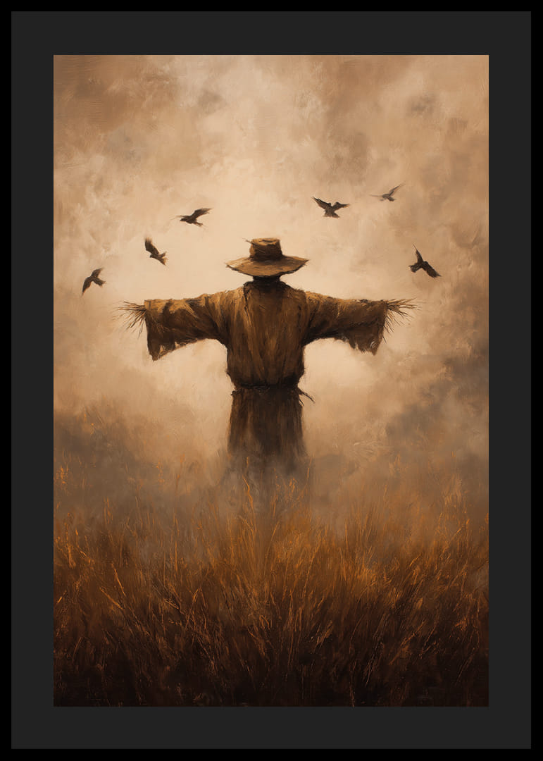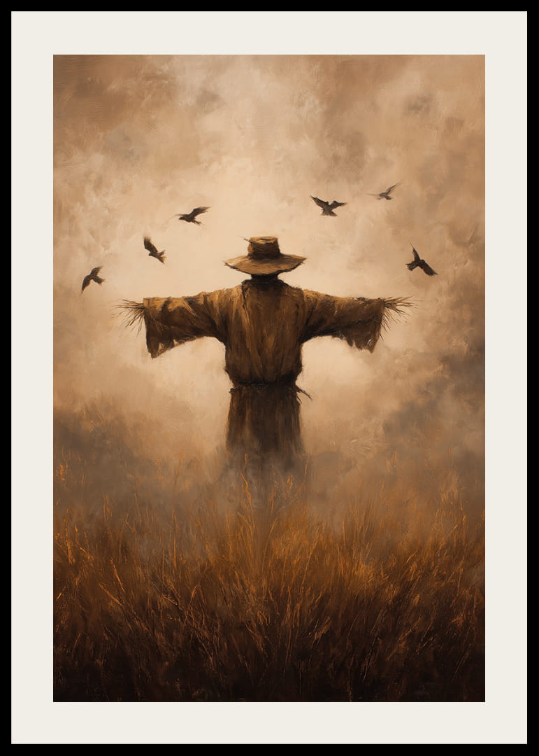Mitt i det trolska ljuset står en fågelskrämma, vars slitna gestalt tycks vakta fälten med tyst förväntan. Runt omkring svävar fåglar, frigjorda i höstens milda bris. Denna poster fångar en känsla av mystik och naturens cykler, där varje penseldrag viskar om bygdens historia. Med denna poster på väggen förvandlas rummet till en stämningsfull plats där tidens gång stilla beundras.