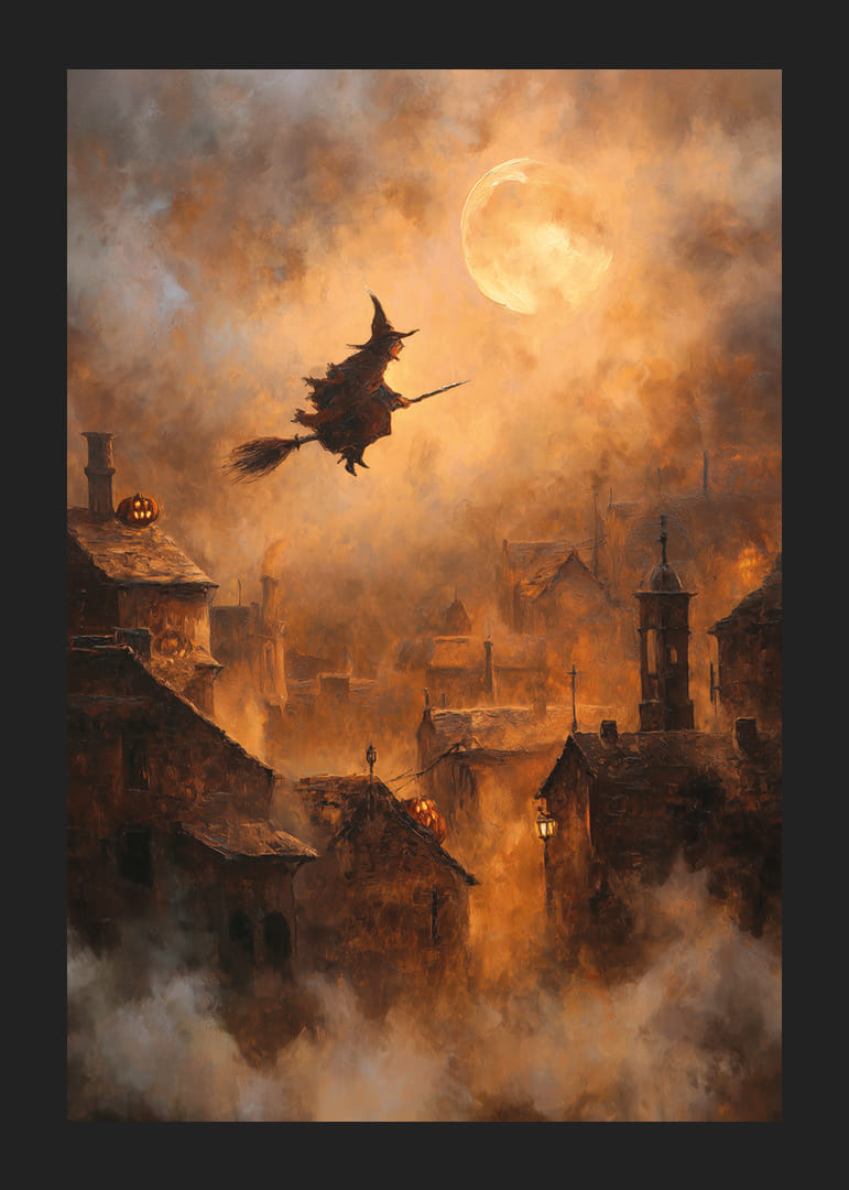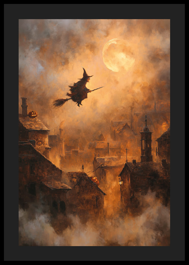 Denna poster fångar en mystisk och magisk scen där en häxa svävar över en by badad i månljus. Dimman sveper in de gammaldags husen och skapar en drömlik atmosfär. Månen lyser starkt på himlen, vilket förstärker känslan av trolldom och mystik. Den konstnärliga stilen och de varma tonerna gör denna poster perfekt för att skapa en fängslande och magisk stämning i ditt hem.