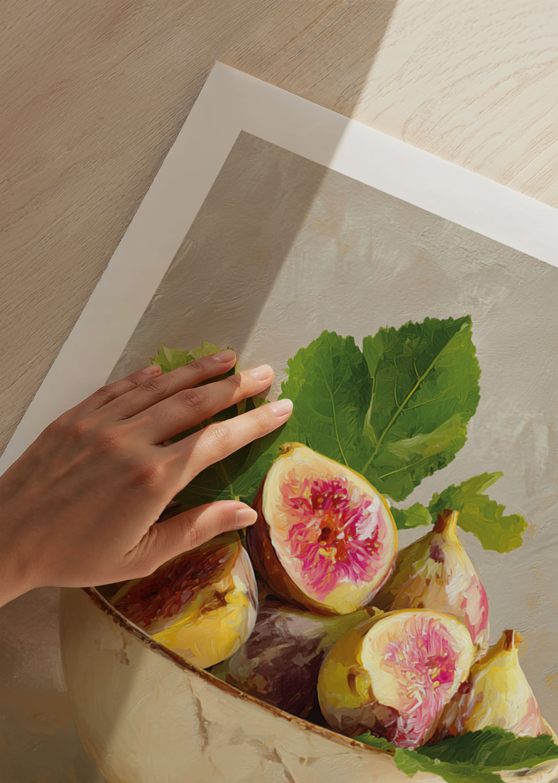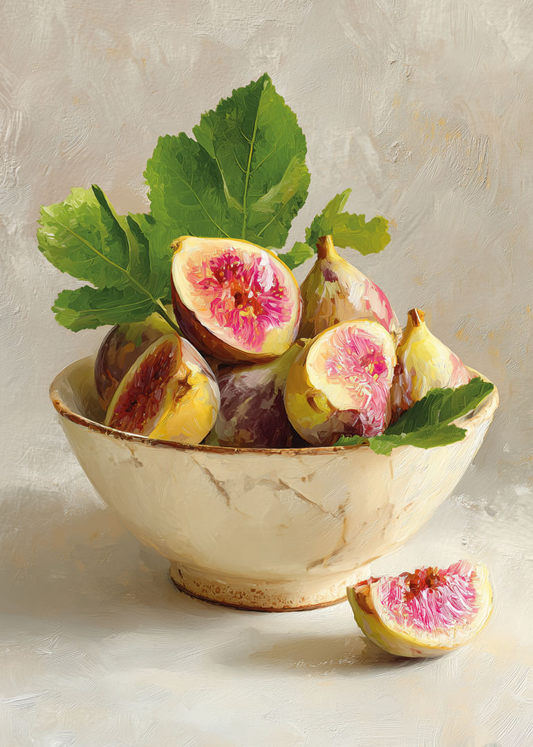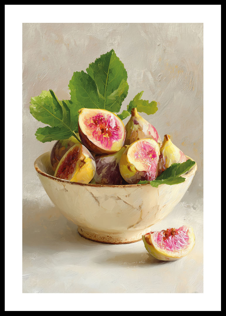 Denna poster fångar en tidlös skönhet med färgrika fikon i en rustik skål. Den subtila kontrasten mellan de saftiga, rosa tonerna och det mjukt glaserade porslinet skapar en drömlik känsla. Fikonens fylliga nyanser kompletteras perfekt av de djupgröna bladen, vilket ger en varm inbjudan till betraktaren. Denna poster tar rummet till en ny nivå av elegans och förvandlar varje vägg till ett konstverk.