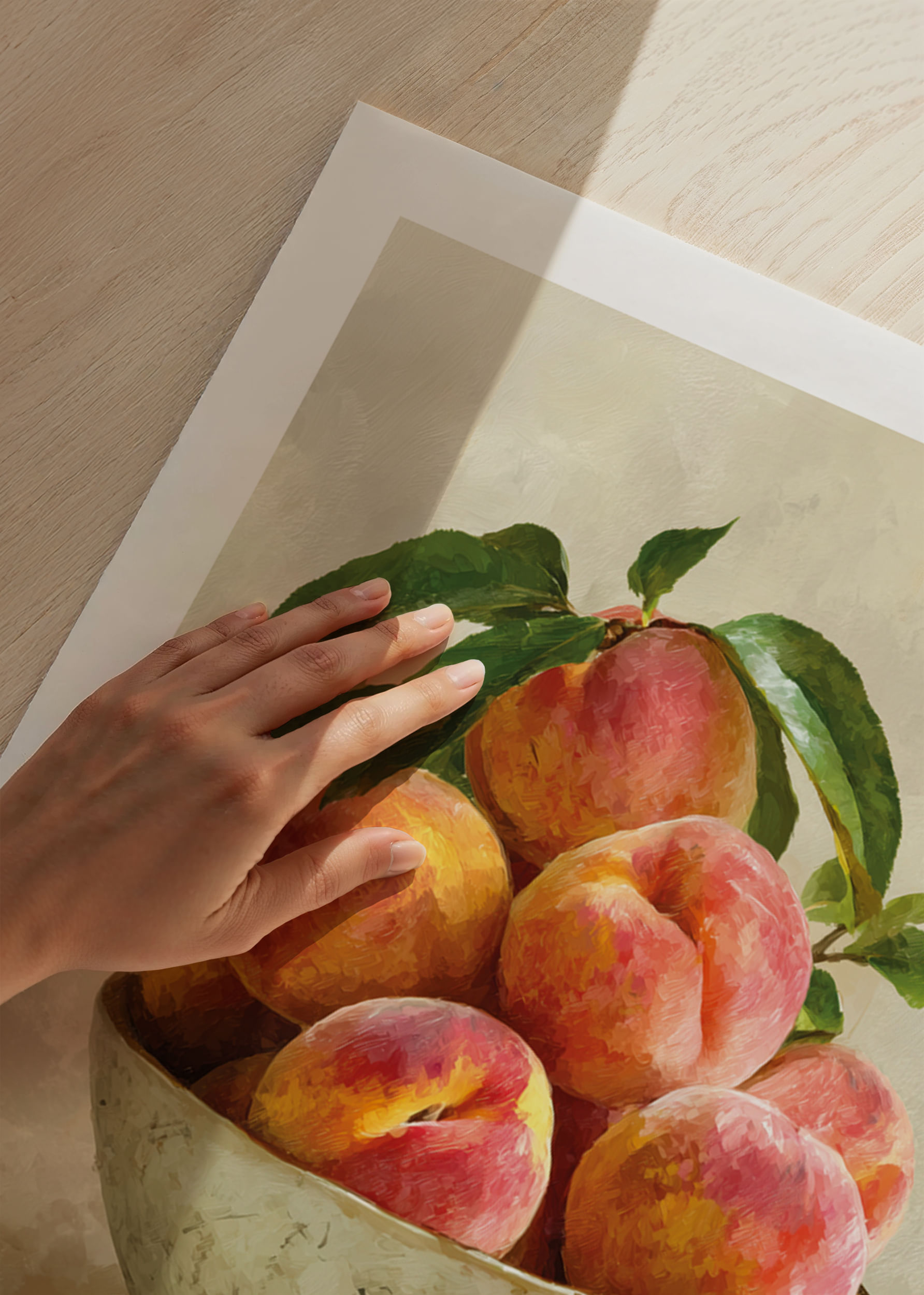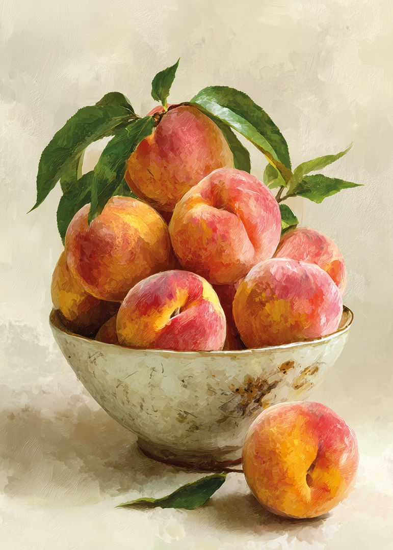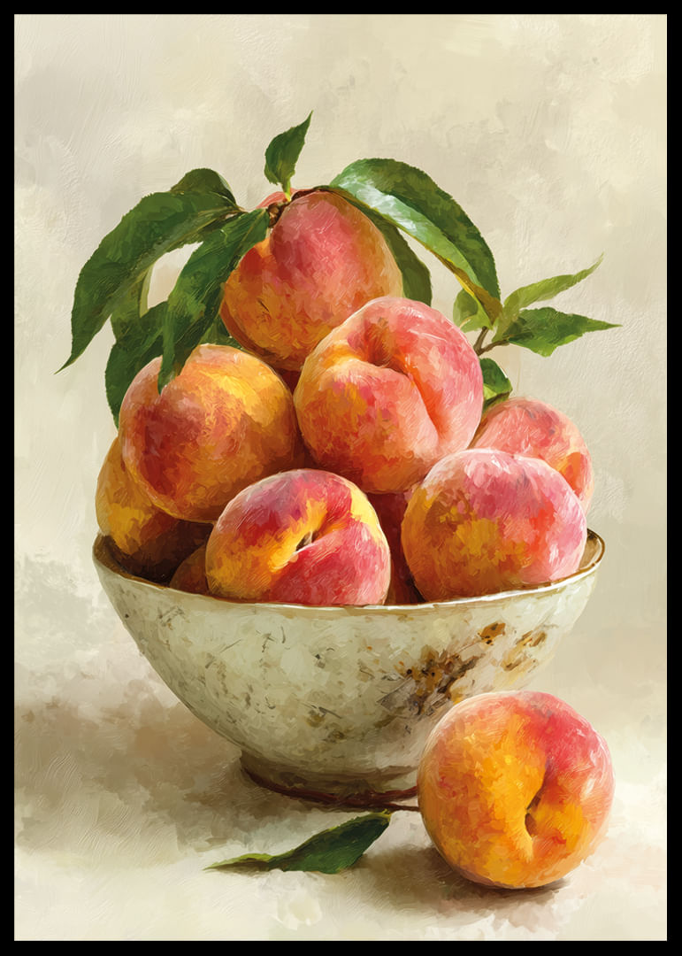 Denna poster fångar sommarens essens med en samling saftiga persikor i en antik skål, vars rustika charm förstärker färgens intensitet. De varma, gyllene tonerna och det mjuka ljuset skapar en livlig och inbjudande atmosfär, perfekt för att ge hemmet en känsla av lantlig elegans. Postern, med sina livfulla nyanser, blir ett blickfång som fyller rummet med värme och naturlig skönhet.