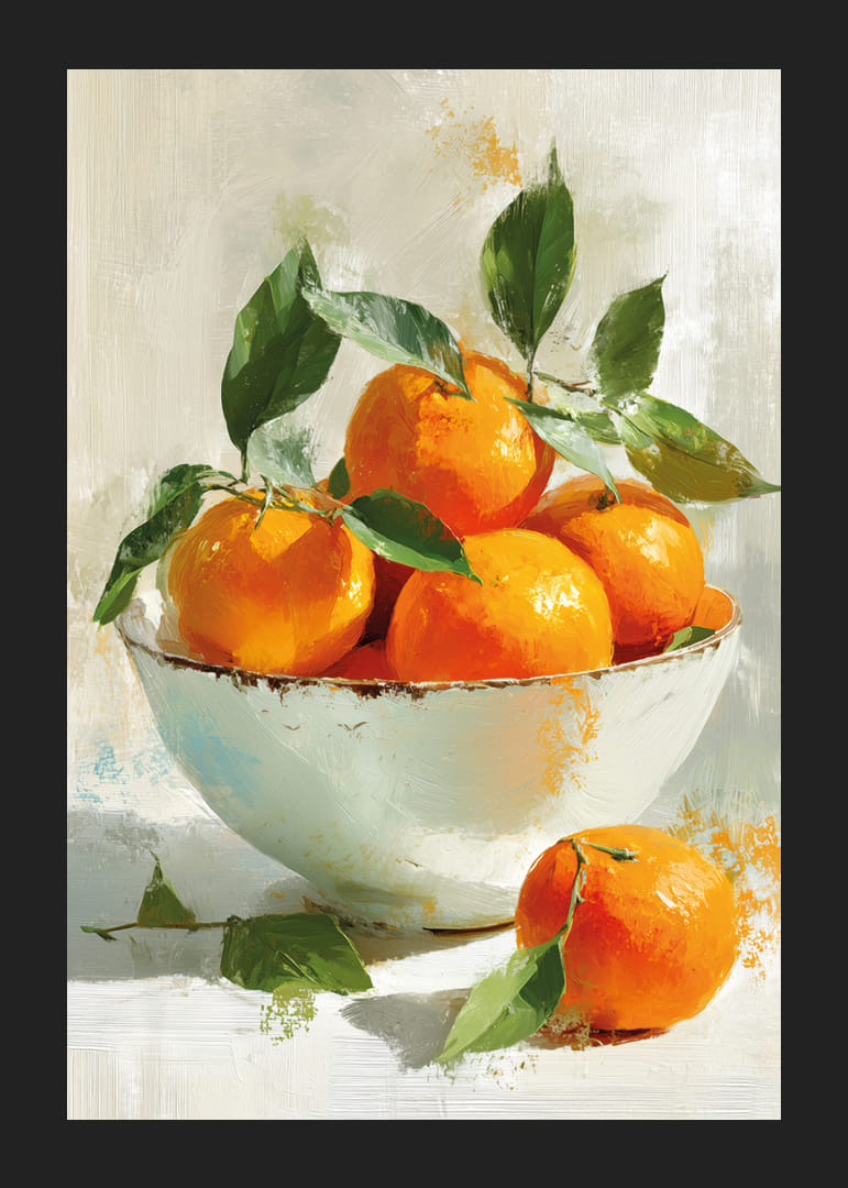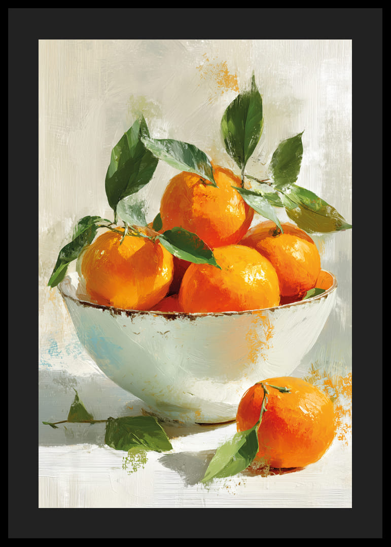 Denna poster fångar ögat med sina levande apelsiner i en elegant skål, där den djärva orangea färgen kontrasterar vackert mot de gröna bladen. Det dynamiska penseldraget ger en känsla av rörelse och liv, vilket gör att postern skapar en känsla av ljus och värme i rummet. Perfekt för att höja atmosfären med sin energi och glädje, ger den en naturlig och fräsch känsla till varje hem.