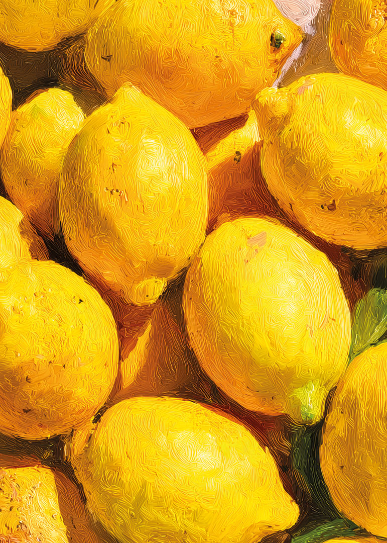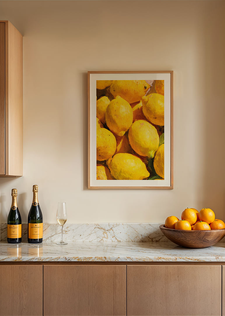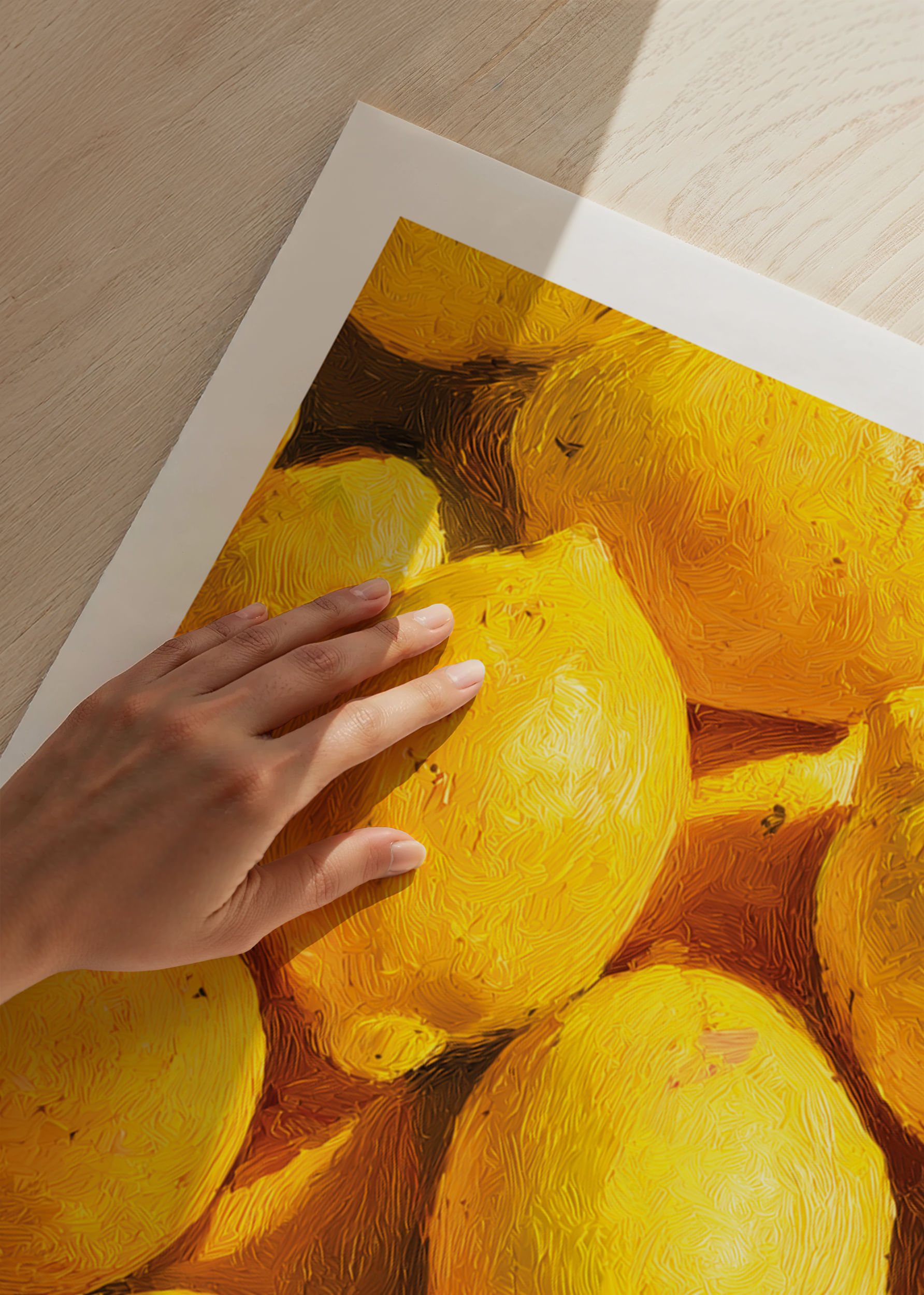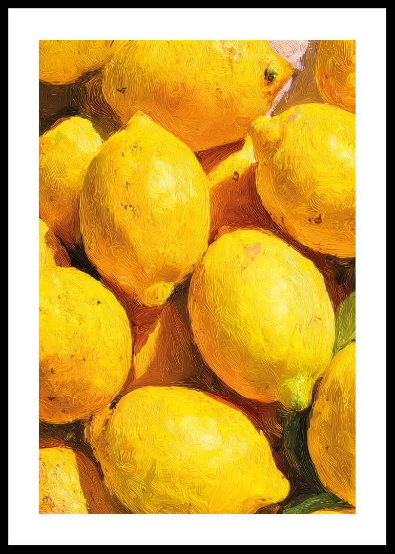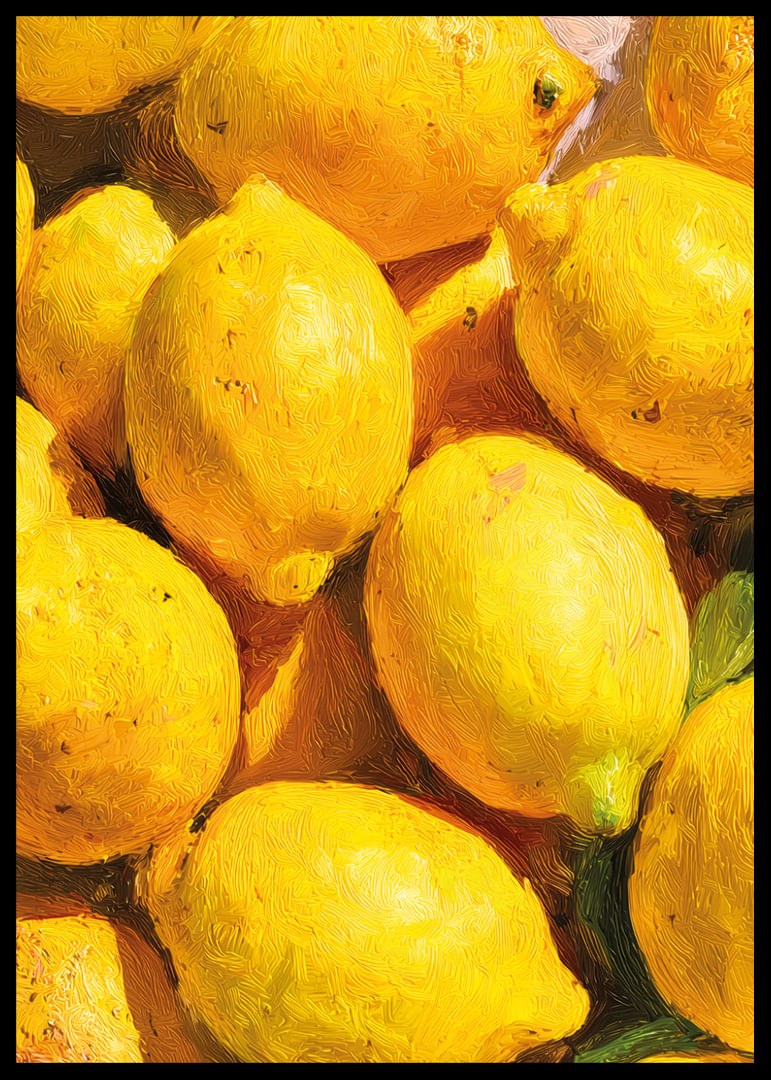 Upplev den livfulla glansen i denna poster med solgula citroner som fyller rummet med energi. Den detaljerade borstrukturen ger en unik konstnärlig touch, och färgerna väcker känslor av soliga dagar och friskhet. Denna poster är perfekt för att lysa upp köket eller vardagsrummet, och dess fräscha energi skapar en upplyftande atmosfär i varje hörn av hemmet.