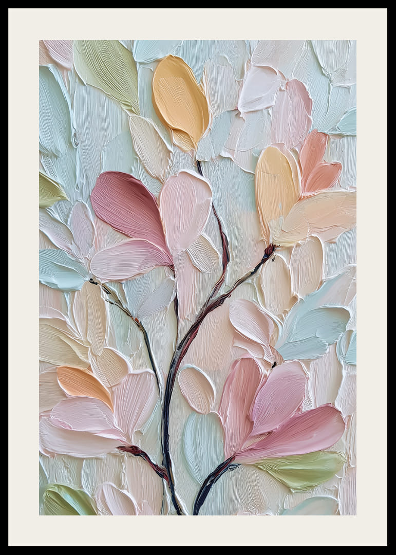 Förtrollas av denna poster där mjuka pastellnyanser bildar en elegant dans av blommor. De svepande linjerna och subtila texturerna bjuder på en upplevelse av lugn och skönhet, vilket skapar en harmonisk atmosfär i vilket rum som helst. Denna poster förmedlar en känsla av vårens skönhet och ögonblick av stillsamhet, vilket lyfter din inredning med en tidlös charm och mjuk elegans.