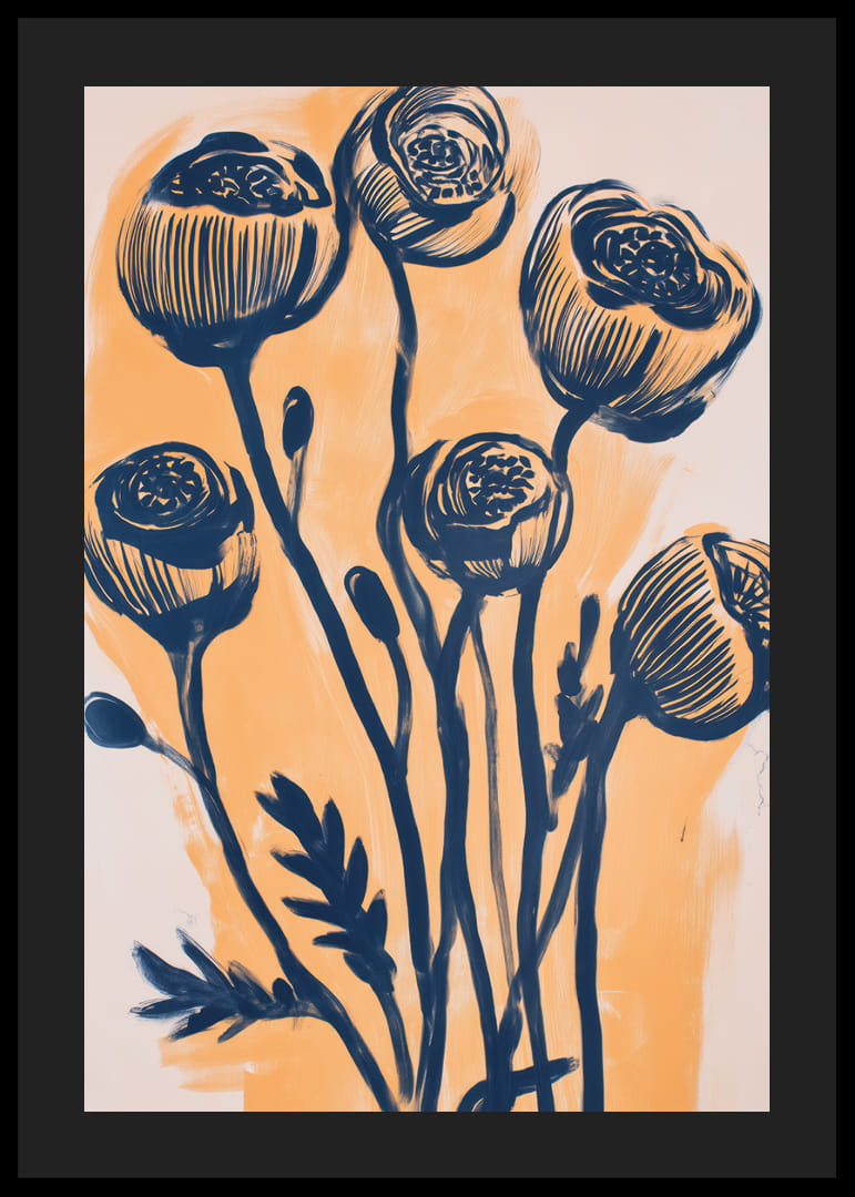Denna poster fångar blicken med sina eleganta blommor i mörkblå toner, som kontrasterar vackert mot en gyllene bakgrund. Med sin levande komposition av blommor som sträcker sig mot himlen, skapar postern en känsla av lugn och sofistikation. Perfekt i vardagsrummet ger den rummet en stilren och konstnärlig atmosfär, och förvandlar det till en plats med inspirerande skönhet.