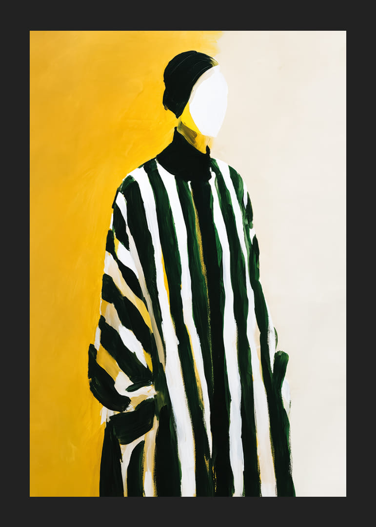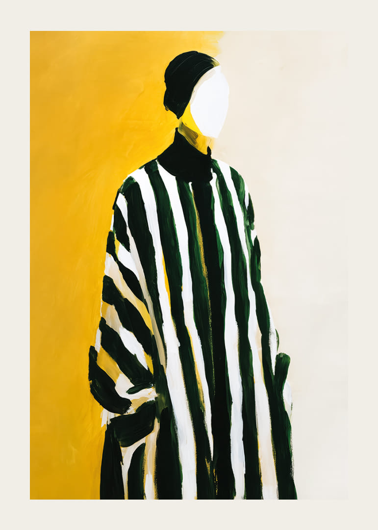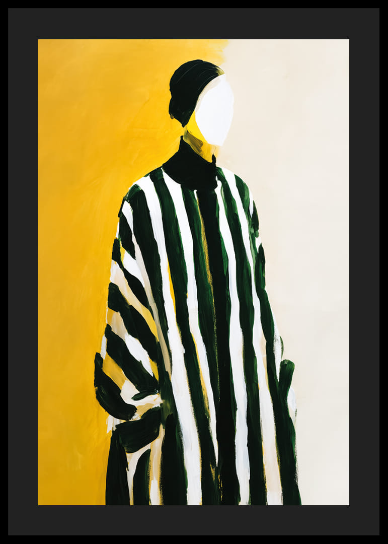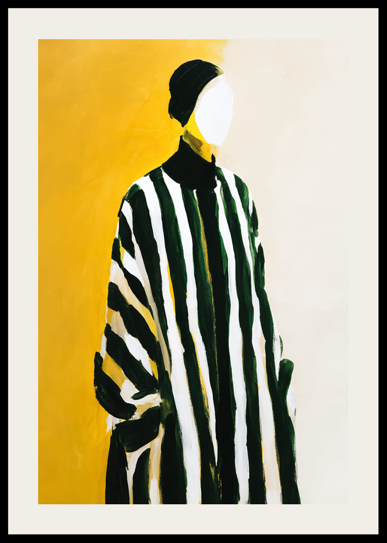 Denna poster fångar ögat med sina djärva, svarta och vita ränder som kontrasterar dramatiskt mot en varm gul bakgrund. Silhuetten, där ansiktet lämnas neutral, skapar en känsla av mystik och tidlös skönhet. Den lekfulla sammansättningen av färger och former ger en modern konstkänsla. En sådan poster förvandlar vilket rum som helst till en stilfull och inbjudande miljö.